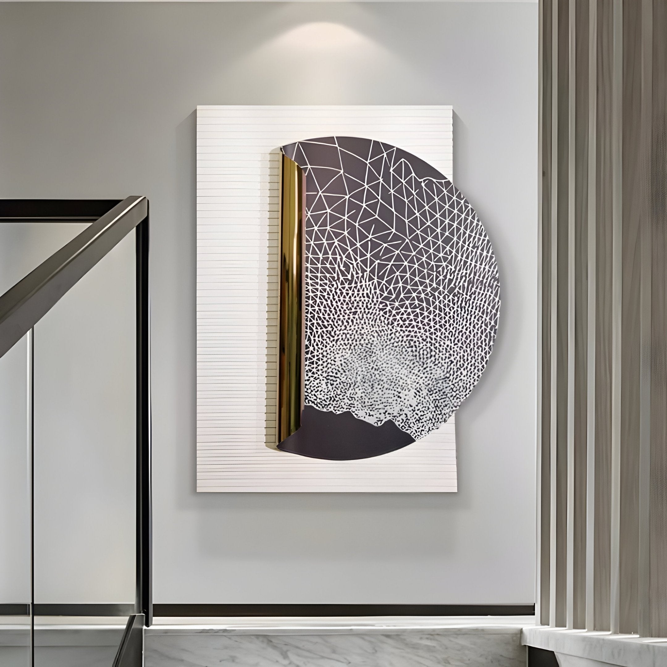 Artevia Grey & White Geometric Wood Relief 3D Wall Art blends industrial cool with calculated elegance. The centrepiece is a brushed grey stainless steel half-disc, laser-etched with a lattice pattern that shifts from intricate dotwork to linear geometry. The shape breaks free from the standard frame, pushing the eye to follow its sharp arc. On the left, a polished gold vertical column adds a warm contrast and anchors the form against a subtly textured white wood relief panel with thin vertical grooves. Together, these materials create a layered structure that plays with reflection, light, and surface.