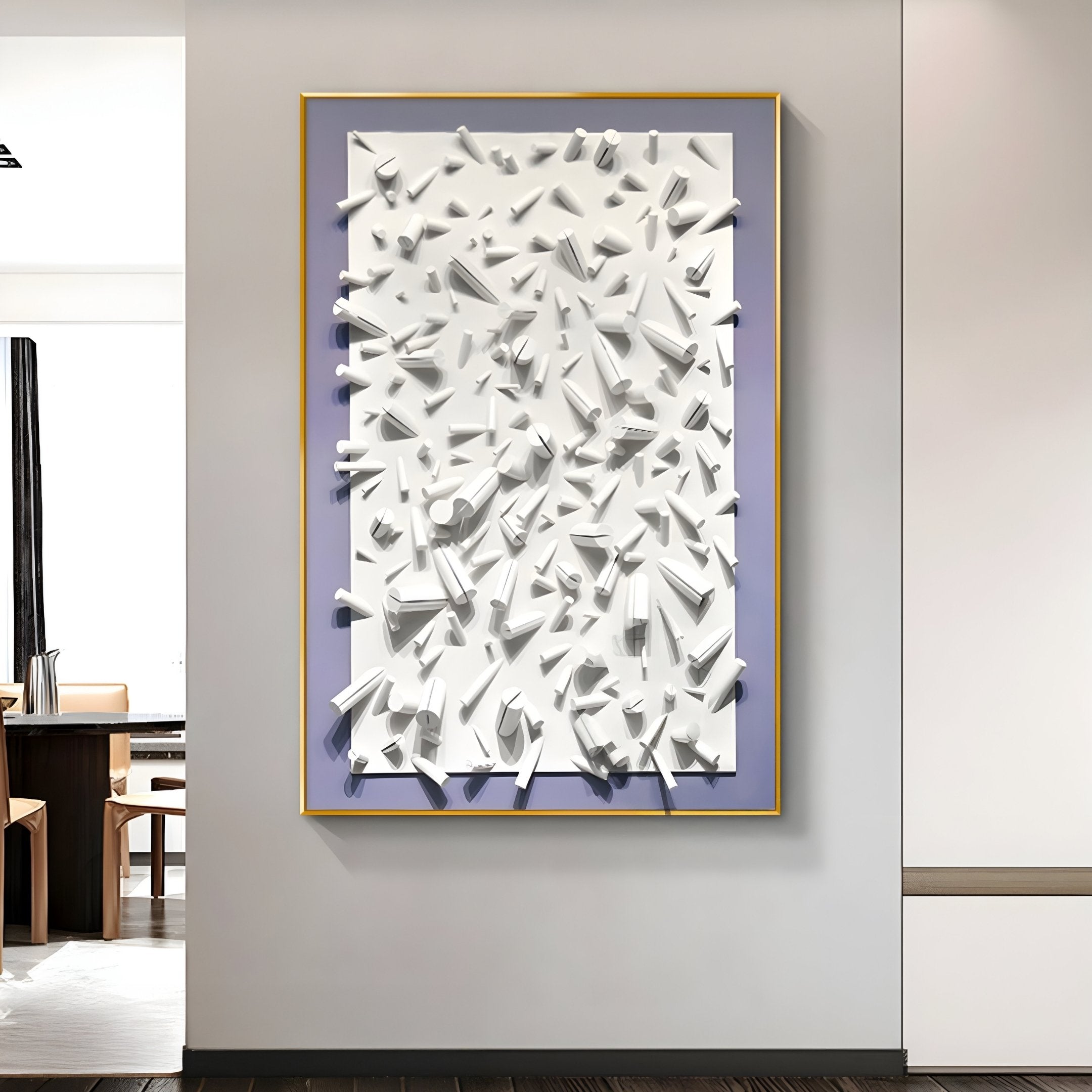 The Artiora Soft Purple Edge & White Abstract Wooden Shard 3D Wall Art offers a compelling mix of crisp white wooden pieces set against a gentle purple panel. Each shard is carved with care, sanded smooth, and painted in a pure white hue that catches light from every angle. The arrangement of these shards introduces fascinating depth, with some protruding further than others, creating a playful dance of shadows and highlights. The soft purple border adds a calming contrast, guiding attention toward the intriguing patterns formed by the overlapping fragments. An underlying framework ensures everything stays securely in place, showing off the thoughtful craftsmanship behind the design.