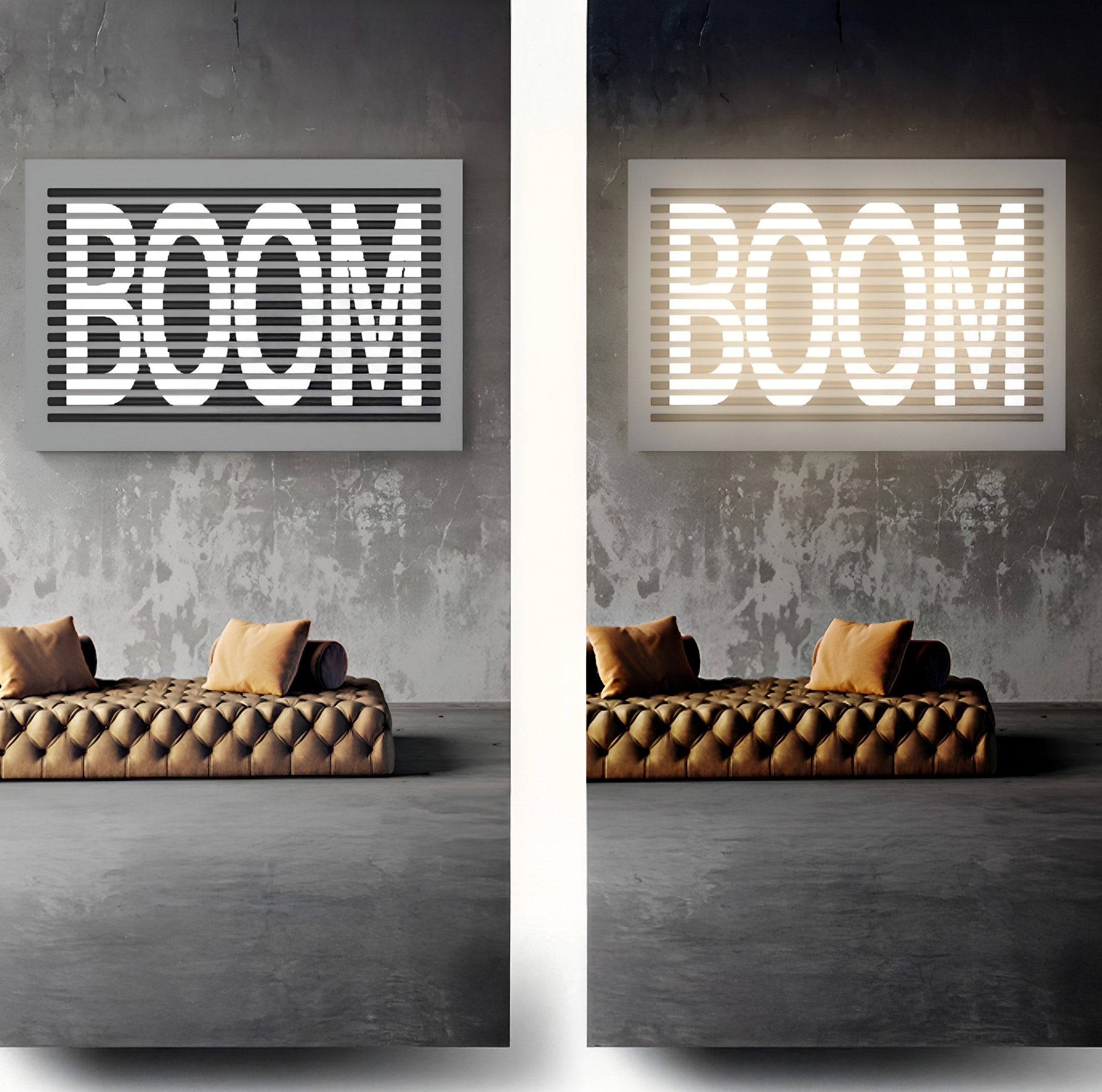 This wall art offers an ideal way to bring character to different spaces, including living rooms, office environments, and hospitality settings. Its industrial charm pairs beautifully with exposed brick walls, concrete textures, and neutral colour palettes, creating a harmonious blend of style and atmosphere. Crafted with high-quality materials, this LED wall art is designed for durability, ensuring long-lasting appeal. The balanced lighting effect provides functional illumination while serving as a captivating visual statement. Positioned in prominent locations such as lounge areas, hallways, or creative workspaces, it elevates the space with a unique sense of style and depth.