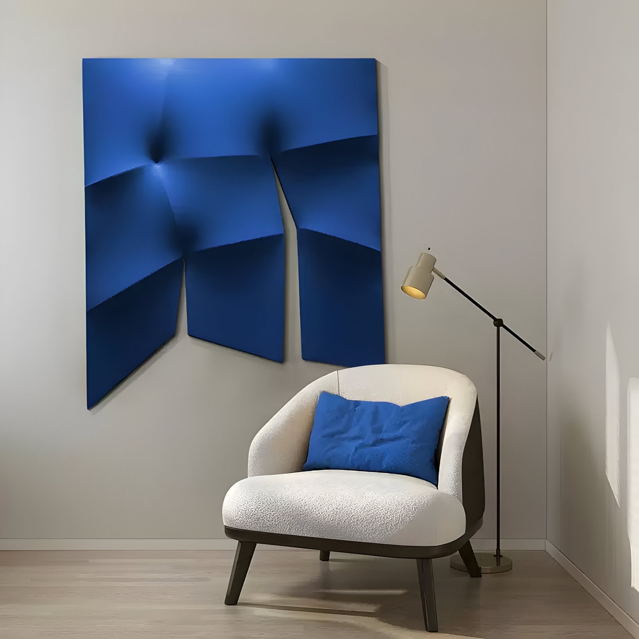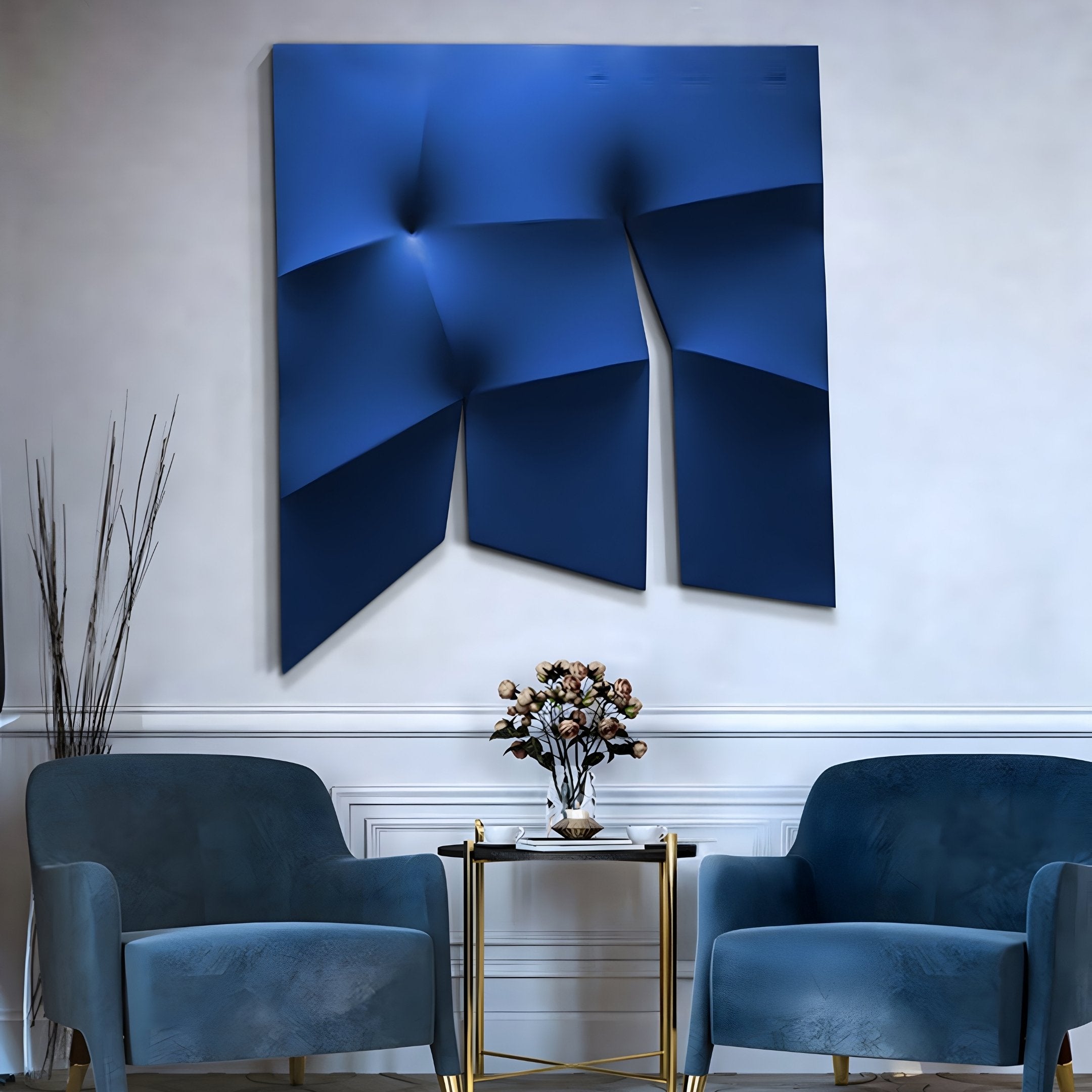 The Contours Dynamic Blue Elastic Fabric 3D Wooden Wall Art redefines modern artistic expression with its bold use of stretched fabric and geometric form. Featuring a striking deep blue elastic material layered over a sturdy wooden frame, the piece showcases a unique interplay of tension and curve. The three-dimensional structure interacts beautifully with natural or artificial light, creating a sense of depth and movement that draws the eye. Designed for contemporary interiors, this artwork transforms bare walls into dynamic, engaging focal points. Its combination of vibrant colour and sculptural shape introduces character and modernity to any environment.