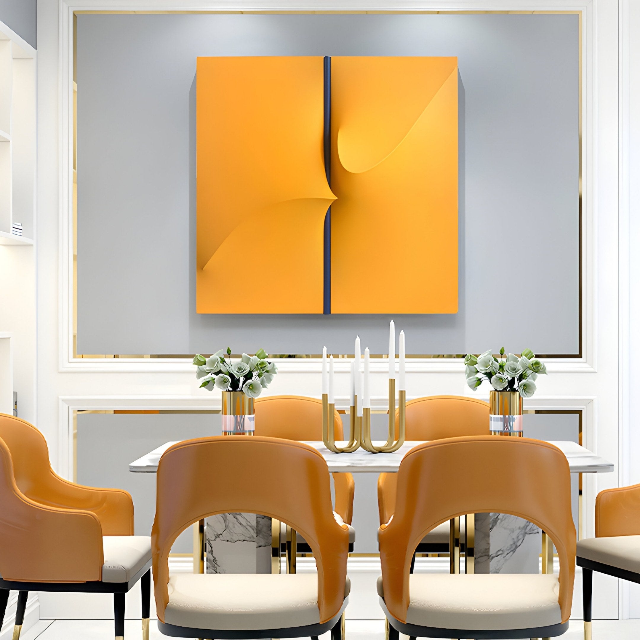 The Delinea Yellow Stretch Fabric 3D Wood Relief Wall Art combines a bright colour palette with a subtle sense of depth, creating a piece that draws the eye. The main panel is covered in a stretch fabric that appears to fold and curve inwards, giving the artwork a soft, sculptural look. A clean vertical division at the centre separates the panel into two sections, adding balance and a clear focal point. Beneath the fabric lies a sturdy wooden structure that enhances the dimensional effect, ensuring that this artwork stands out on any wall. The vivid yellow shade brings a sense of energy to a room, while the gentle contours invite closer inspection.