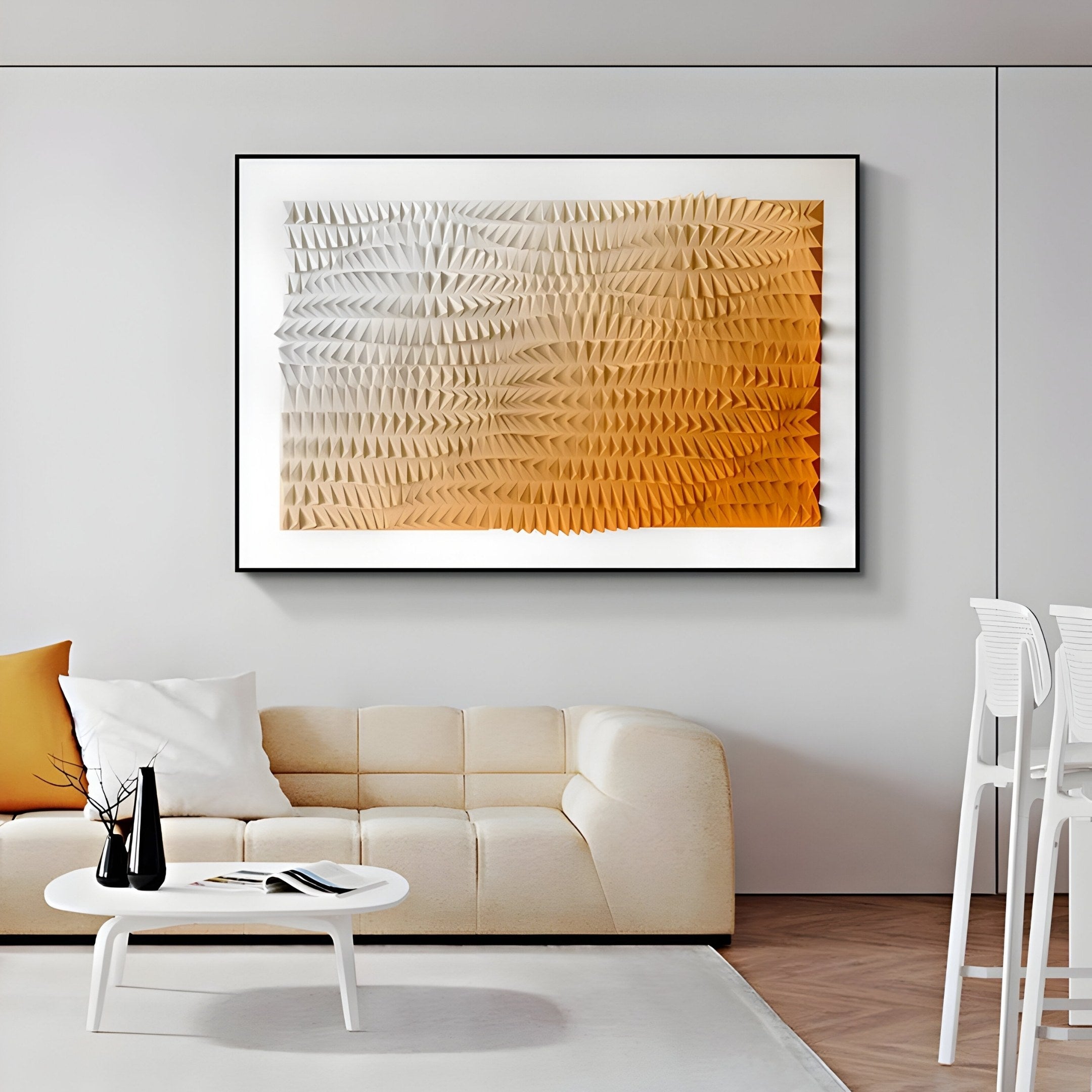 The Elytrum Orange Gradient Hand-Painted Wood Relief 3D Wall Art brings an inviting blend of texture and warm colour to your home. This rectangular wooden panel is meticulously carved, creating raised contours that evoke a sense of movement and depth. Hand-painted in a gradient that transitions from light, near-ivory tones through to a deeper, glowing orange, the piece offers a smooth shift of hue across the surface. These sculpted ridges catch and reflect light in subtle ways, resulting in ever-changing highlights and shadows throughout the day. Whether placed in a living room, bedroom, or hallway, the artwork adds a dynamic focal point that can complement both neutral and more adventurous interiors.