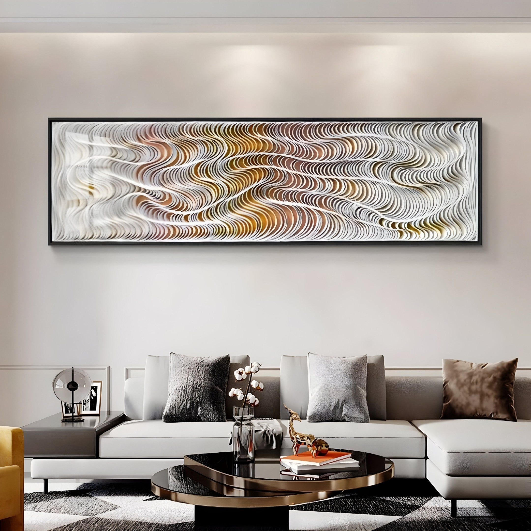 The Fluenta Sunlit Ripple Linear Cardboard 3D Wall Art works beautifully in living rooms, lounges, or bedrooms that benefit from a splash of energising colour. Its cardboard core keeps the entire piece lightweight, so hanging or rearranging is uncomplicated. At the same time, plexiglass safeguards each folded layer against dust, helping the golden and orange accents remain vibrant over time. By using cardboard as the primary material, this creation embraces a more responsible approach to artistic expression, appealing to those who value sustainable design. The elongated shape can be hung horizontally above a sofa for a subtle yet striking statement, or vertically along a feature wall for maximum impact. Each wave suggests a flow of warmth that can uplift interior moods without overpowering the space. The combination of form, function, and thoughtful materials makes this sculpture an engaging addition to your home, adding a sense of natural radiance to any setting.