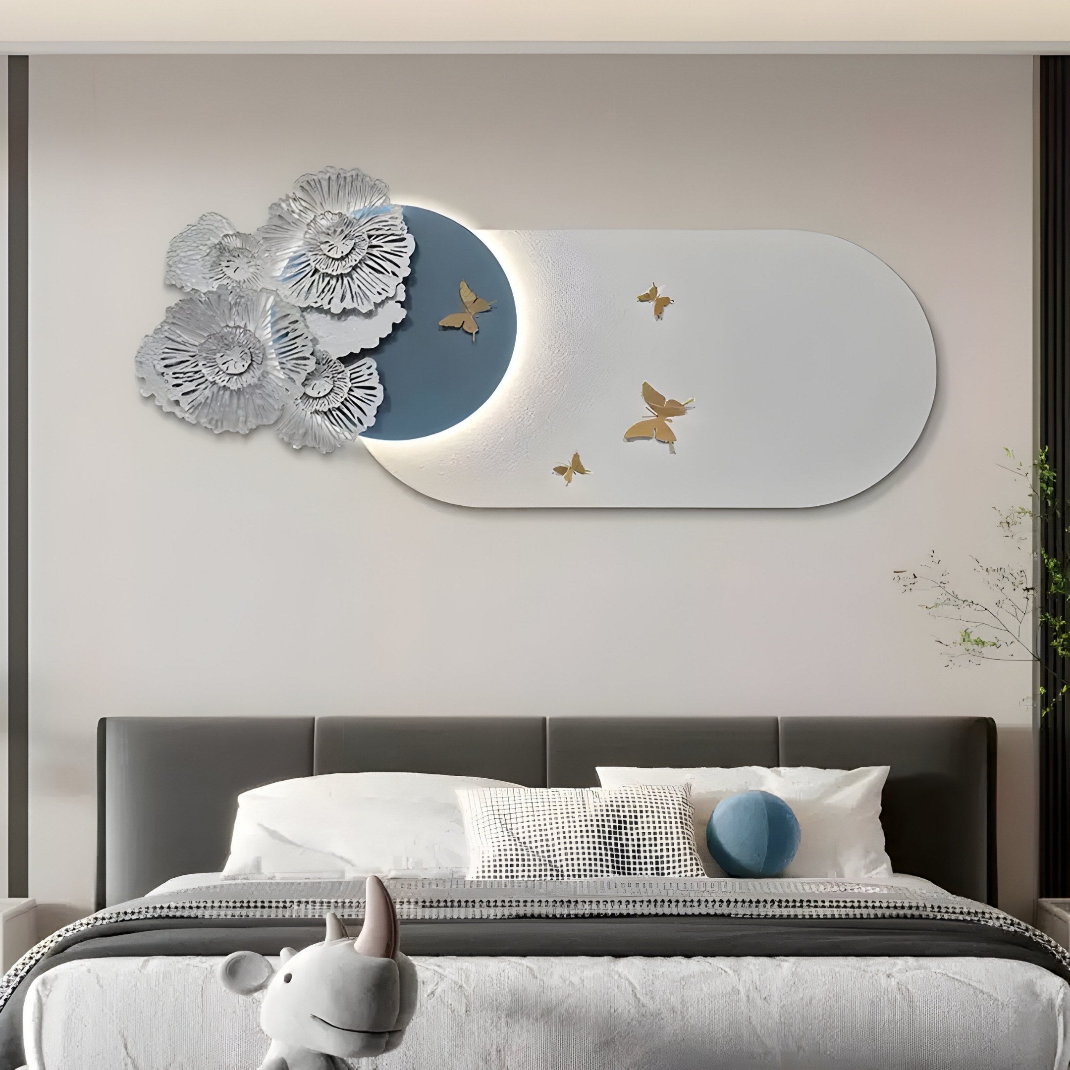 Perfect for living rooms, bedrooms, or hallways, the Flutter Bloom Wall Art serves as both a decorative feature and a subtle lighting solution. Its harmonious blend of white, gold, and blue tones allows it to complement a variety of interiors, from contemporary to transitional spaces. Placed above a sofa, bed, or console table, this piece adds depth and character while serving as a calming focal point. The warm white LED light accentuates its unique design, making it a standout addition during both day and night. Designed with quality materials like durable iron, wood, and sandstone, this 3D wall art is built to last while maintaining its stunning aesthetic. This wall art adds sophistication and artistic appeal, offering a perfect balance of form, function, and timeless style.