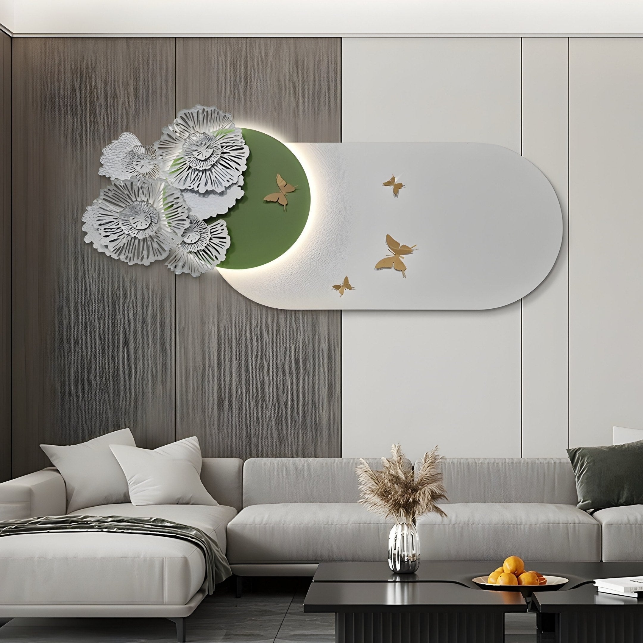 The Flutter Bloom Green Butterfly Floral 3D Wall Art beautifully blends organic elegance with artistic craftsmanship. A soft green circle forms the foundation, contrasting gracefully with intricately crafted white floral patterns. Delicate gold butterflies add a dynamic sense of motion, creating a serene and visually engaging focal point. The combination of textures and tones makes this wall art a statement piece that captures attention while exuding calm sophistication.
