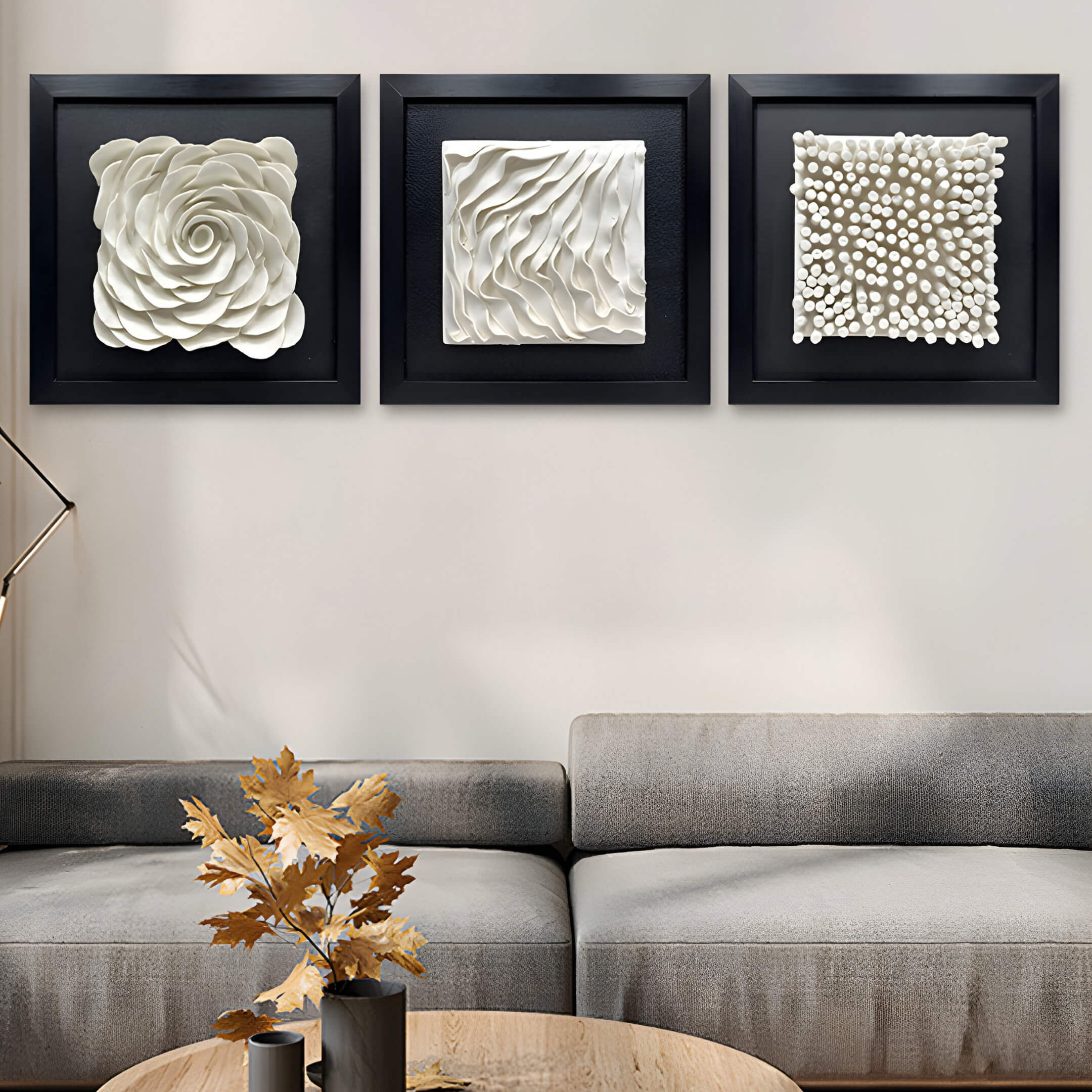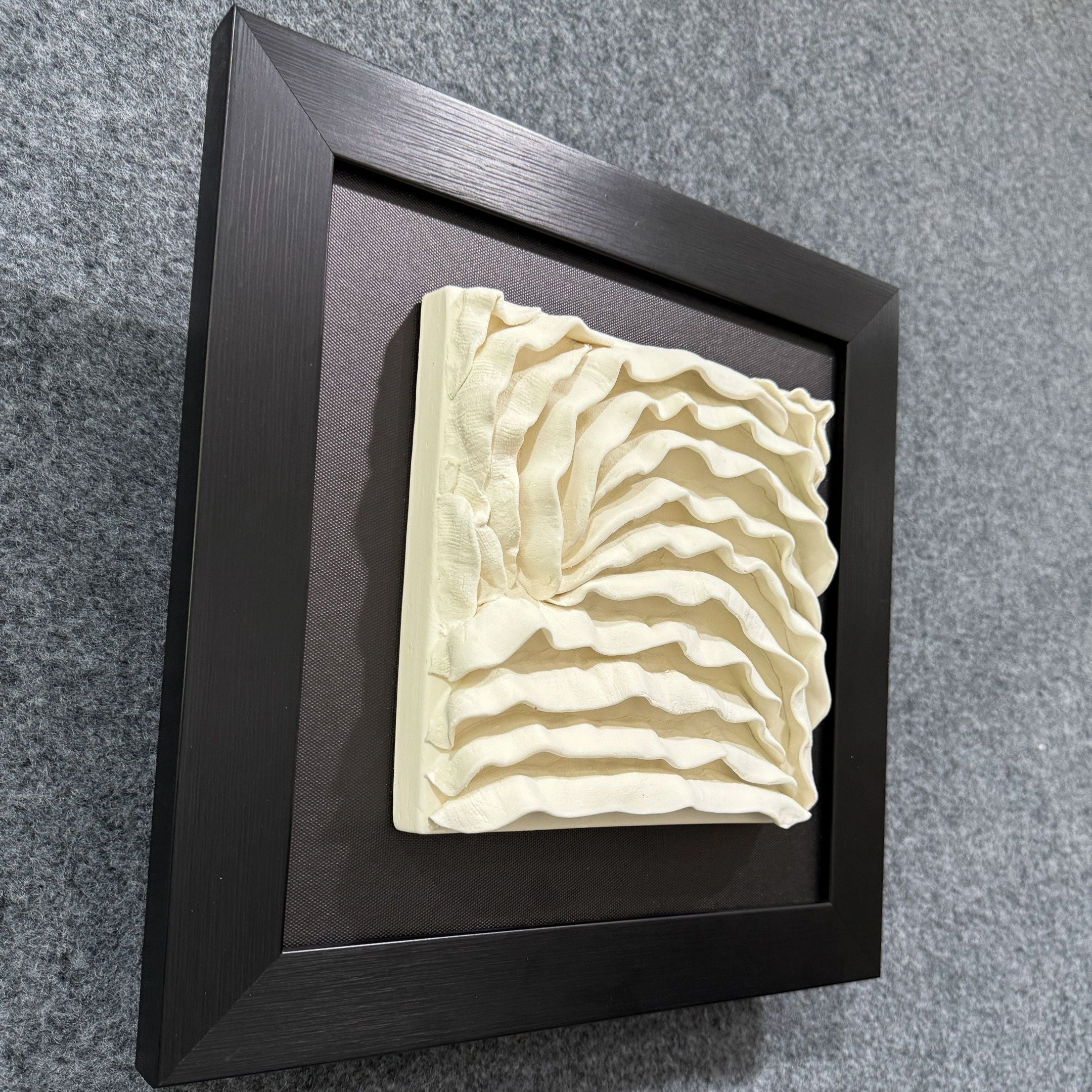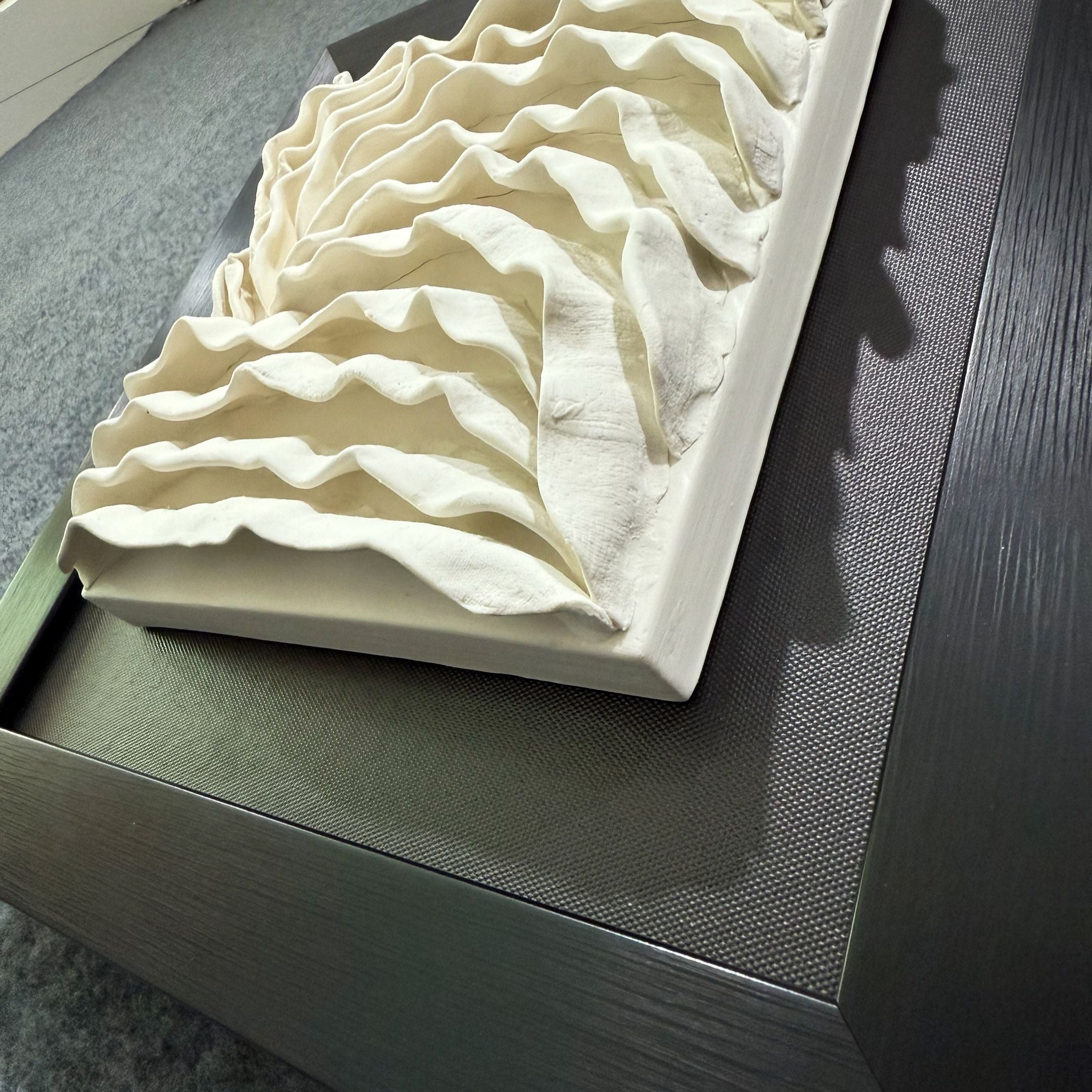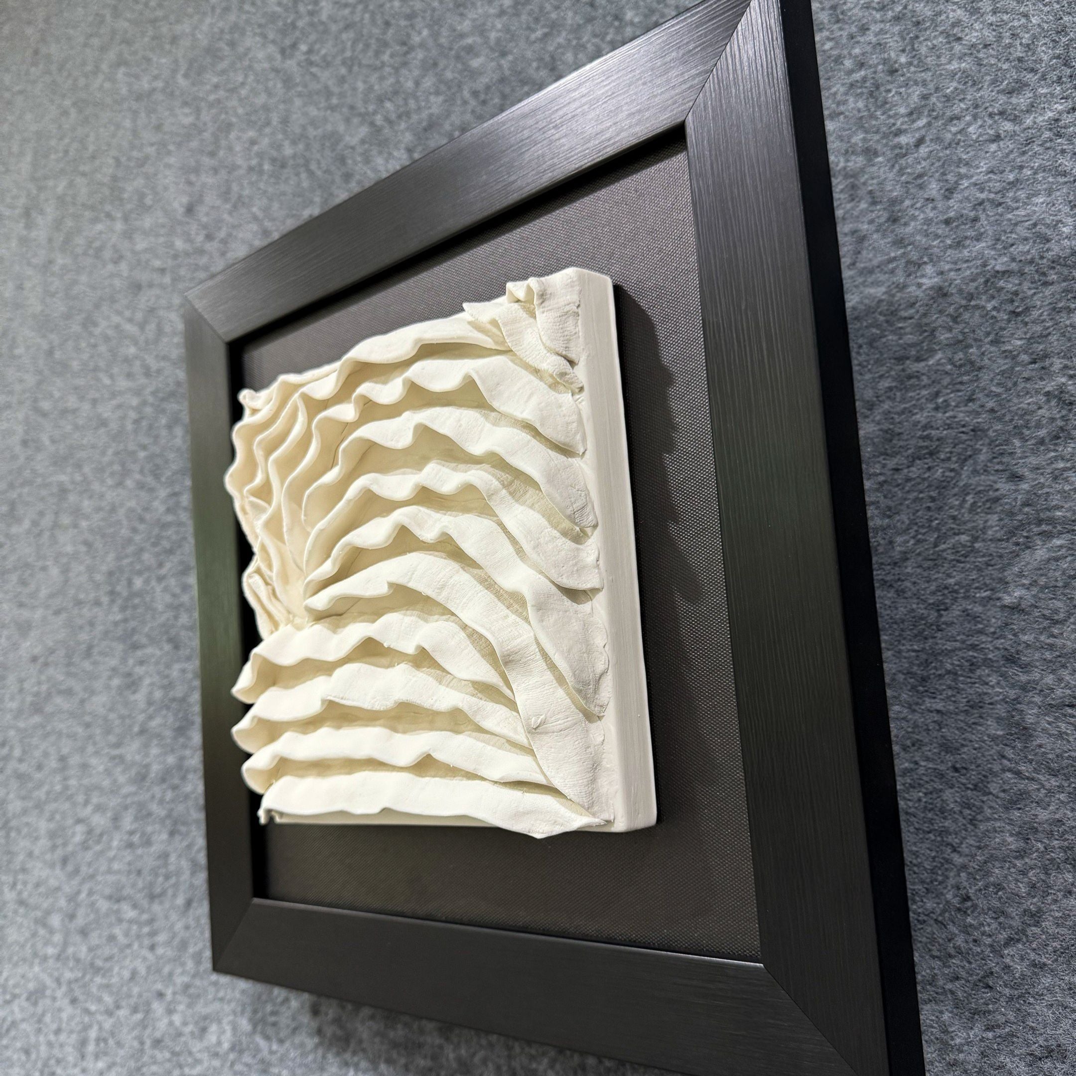 This framed ceramic 3D wall sculpture brings a dynamic, flowing texture to modern interiors. Designed with expertly crafted ceramic waves, the installation captures an organic rhythm, evoking the natural patterns of wind or water. The off-white ceramic surface features graceful, undulating lines that create depth and movement, transforming a simple space into a refined artistic statement. Encased within a bold black frame, the contrast between the clean, flowing ceramic design and the textured dark background adds a striking visual balance. Perfect for art enthusiasts seeking a minimalist yet impactful piece, this ceramic installation blends modern sophistication with timeless craftsmanship.