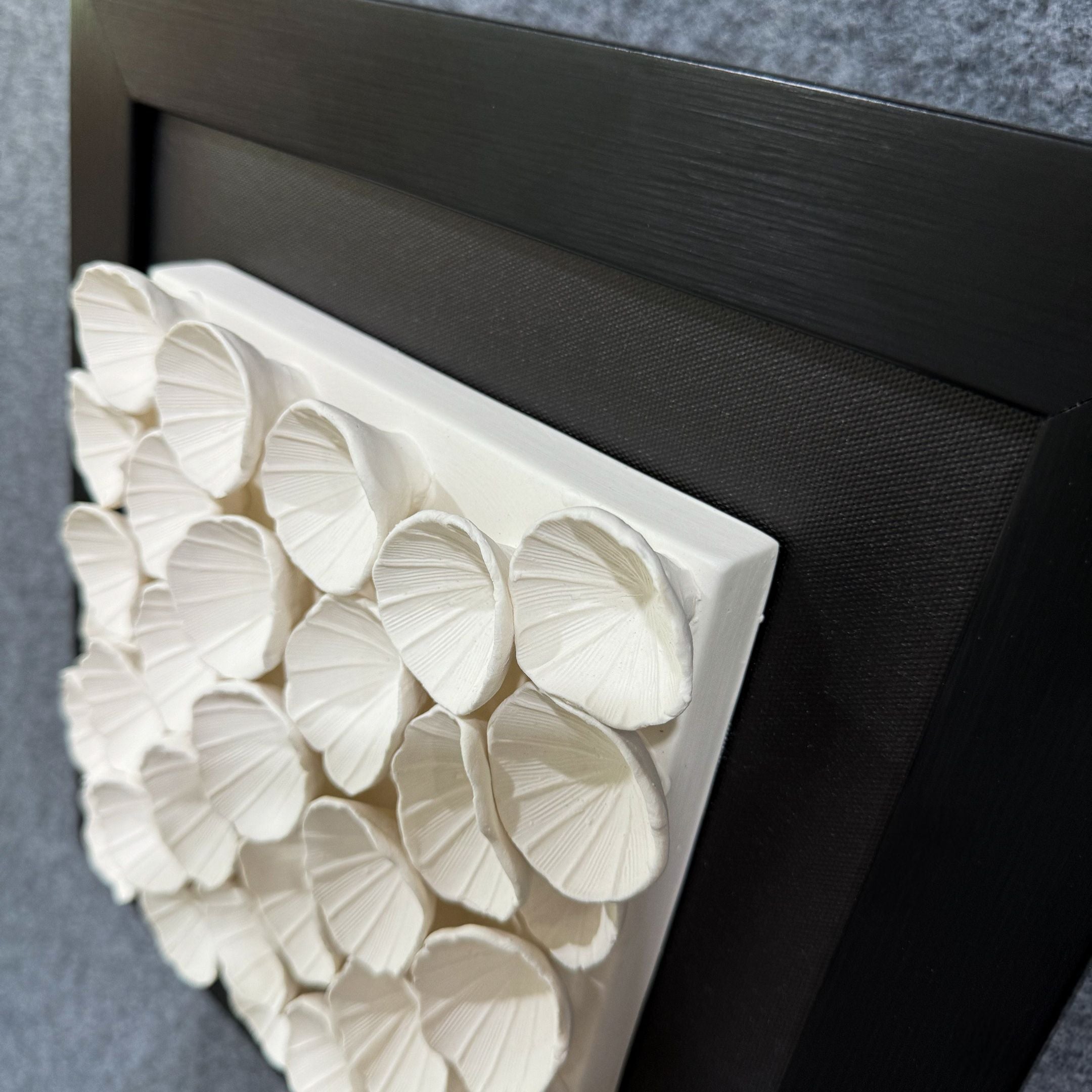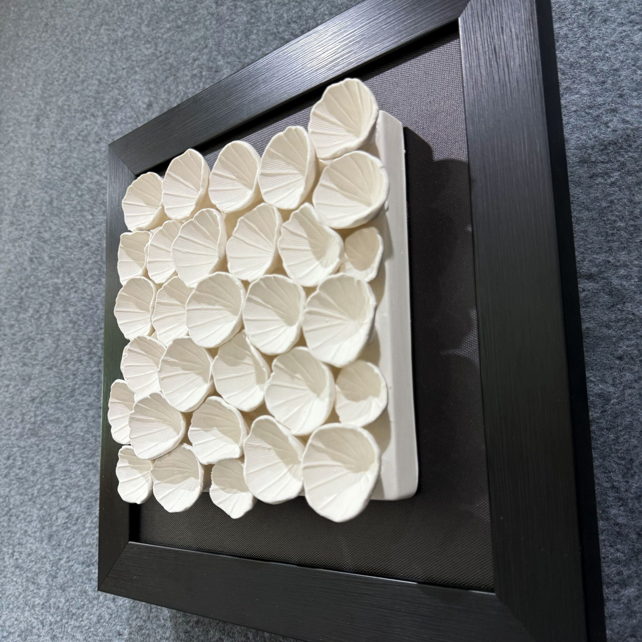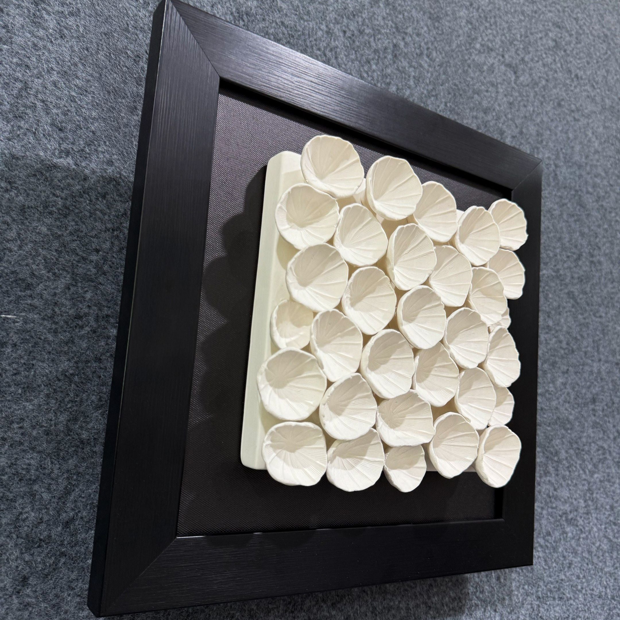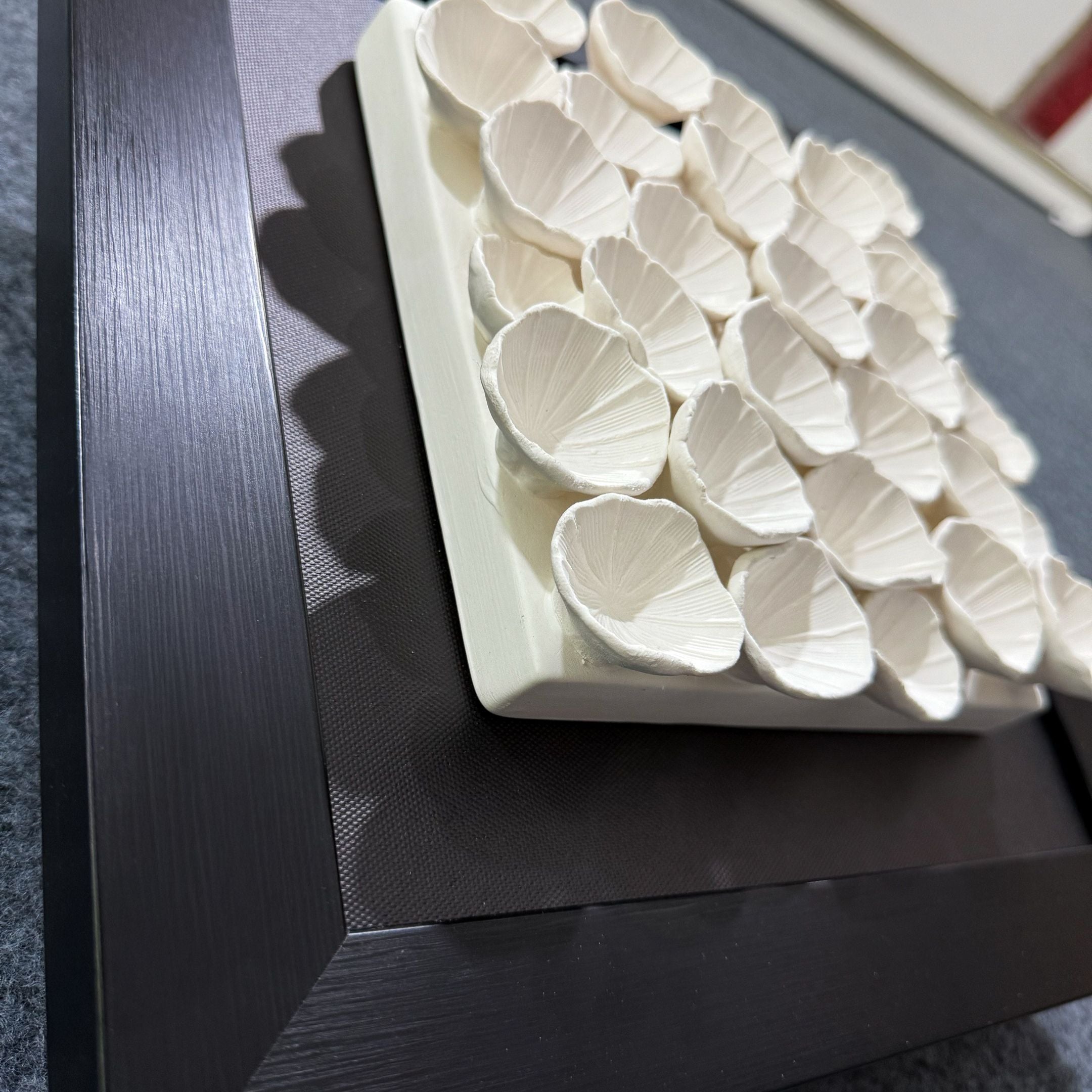 This framed ceramic 3D wall sculpture features an elegant arrangement of petal-like forms, creating a harmonious blend of natural beauty and artistic craftsmanship. Each off-white ceramic petal is delicately shaped, evoking the softness and charm of blooming flowers. The thoughtful layout forms a grid that balances texture, rhythm, and visual appeal, while the interplay of light and shadow adds depth and dimension. Encased within a bold black frame, the contrast between the clean white petals and the dark background enhances its modern sophistication, making this sculpture an eye-catching centrepiece for contemporary interiors.