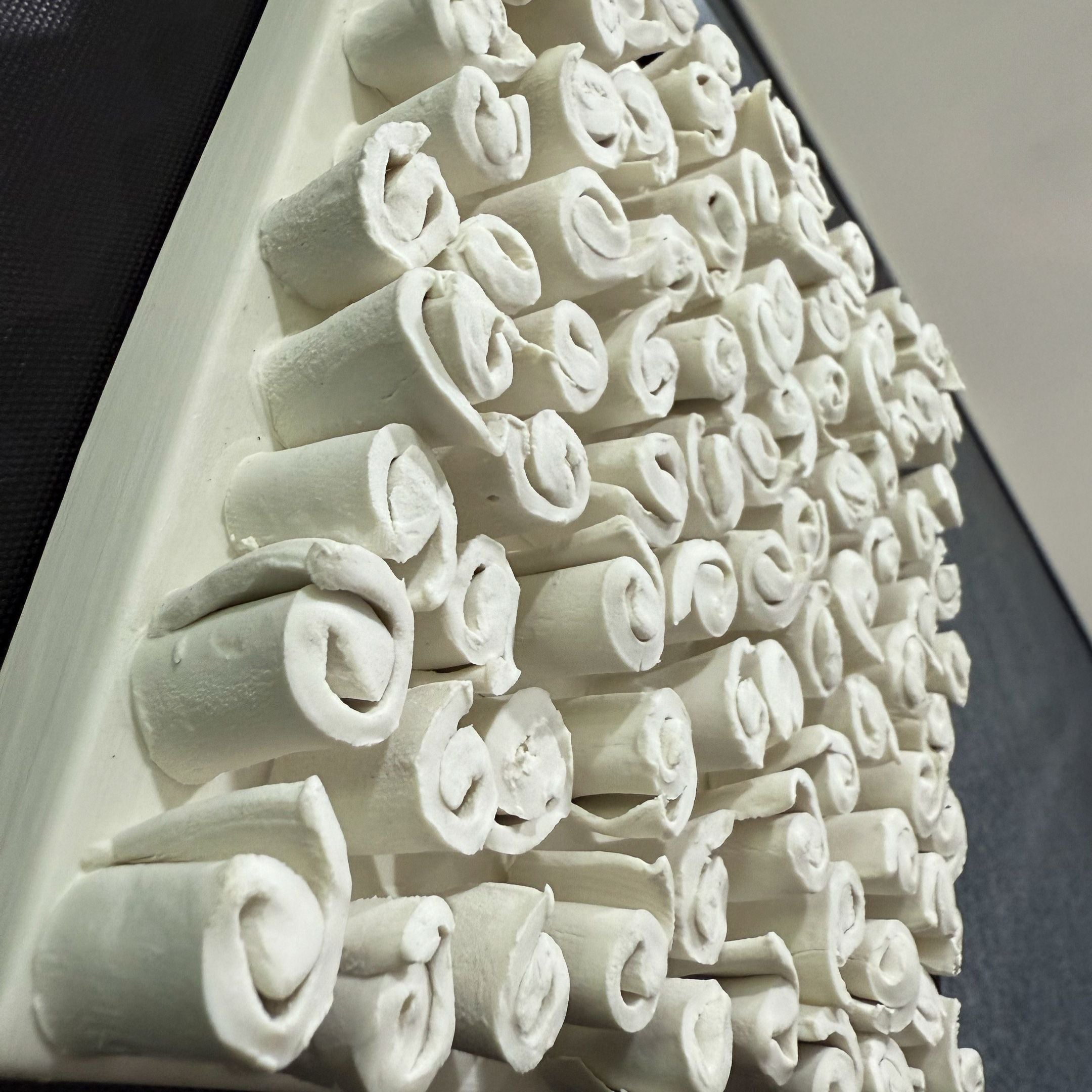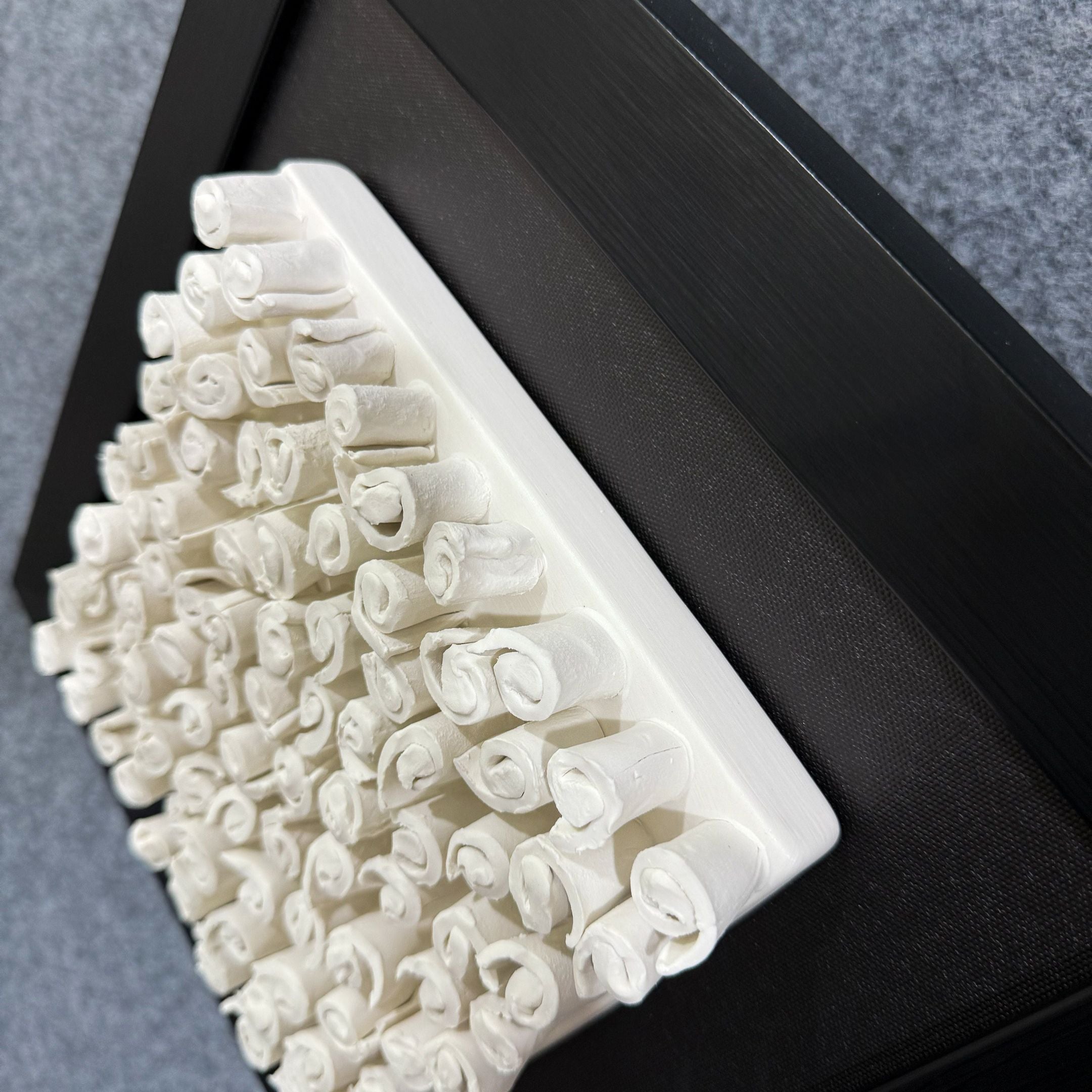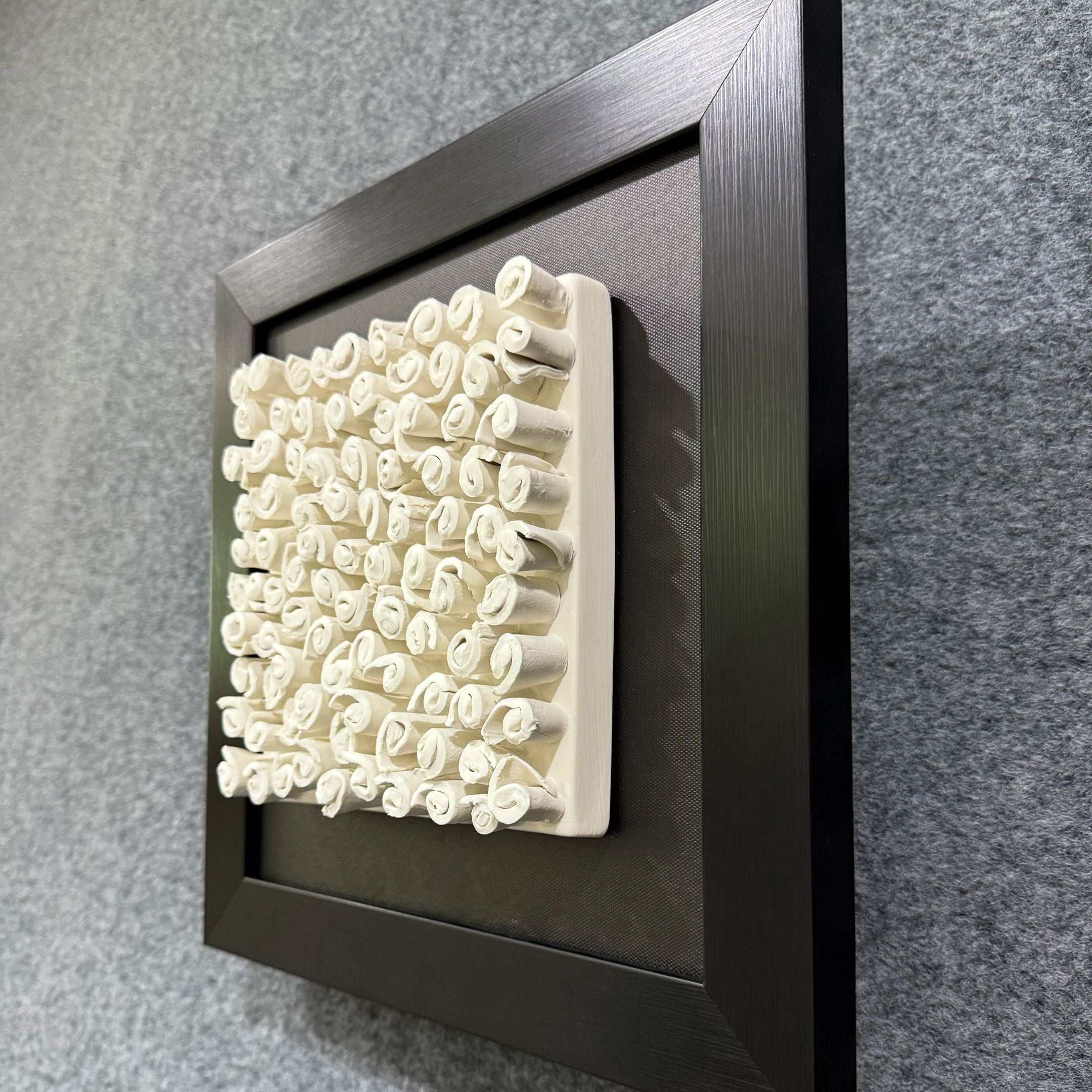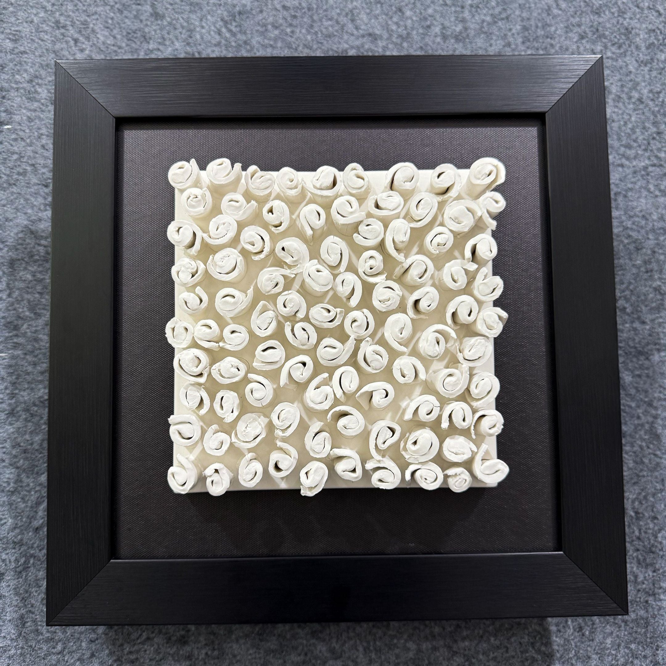 This framed ceramic 3D wall sculpture features an exquisite arrangement of delicate spiral forms, creating a harmonious blend of texture and artistry. The off-white ceramic spirals are carefully crafted to bring a sense of movement and visual intrigue, evoking patterns inspired by nature like seashells or blooming florals. Each swirl adds depth and dimension, playing with light and shadow to enhance the three-dimensional effect. The piece is encased in a black frame, offering a striking contrast that draws attention to the intricate ceramic details. This installation seamlessly combines modern design with timeless elegance, making it an artistic focal point for contemporary interiors.