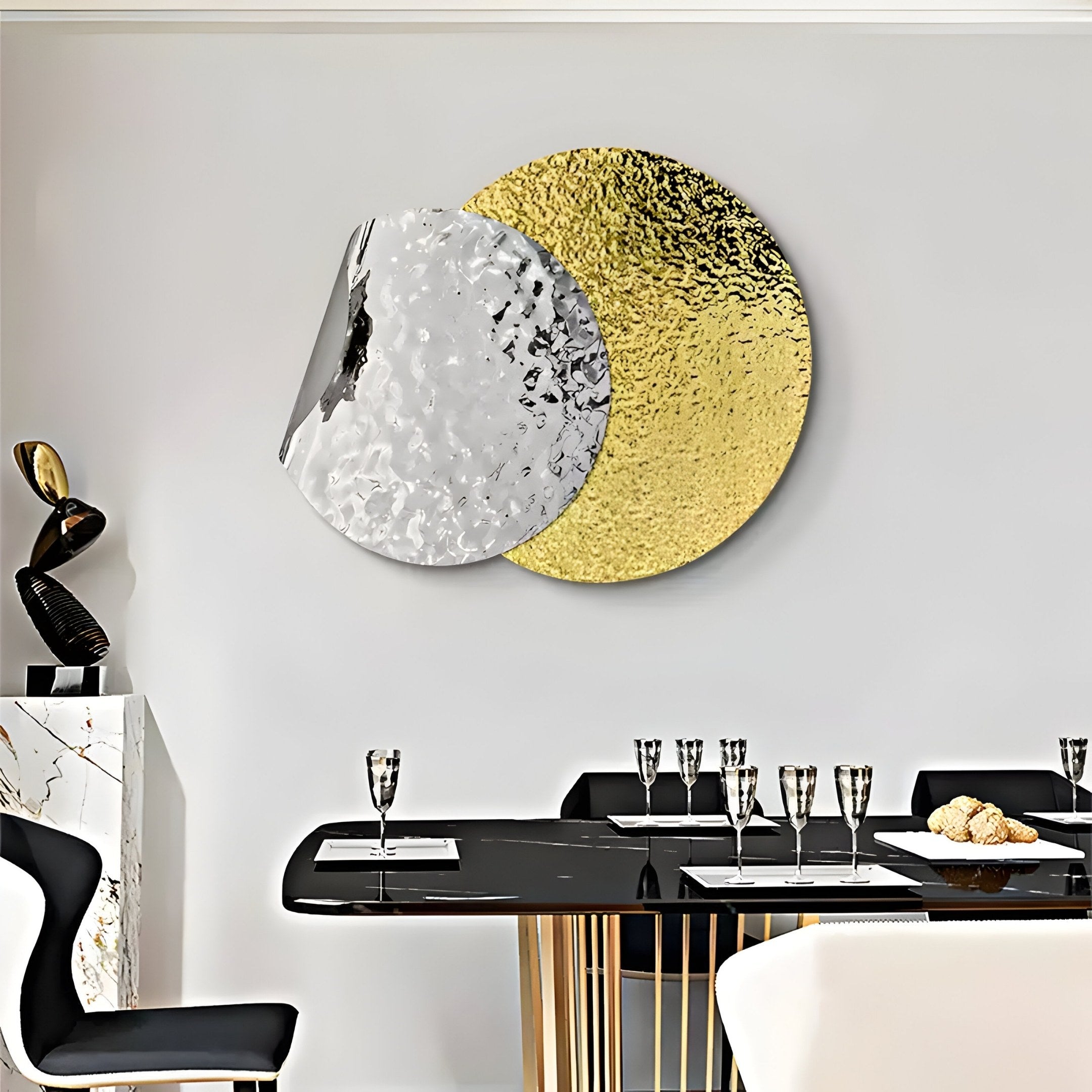 This wall art fits effortlessly into contemporary, modern, and luxury-themed spaces. Its dual disc design complements neutral color schemes while enhancing areas like dining rooms, living rooms, or entryways. Placed above a dining table, sofa, or hallway console, it commands attention without overwhelming the surroundings. The smooth silver contrasts with the textured gold surface, offering a refined blend of style and modern touch. Constructed with premium stainless steel, the Metaluxe II wall art combines durability and visual impact. Its 3D design captures natural light throughout the day, creating a dynamic effect that shifts with your room’s ambiance.
