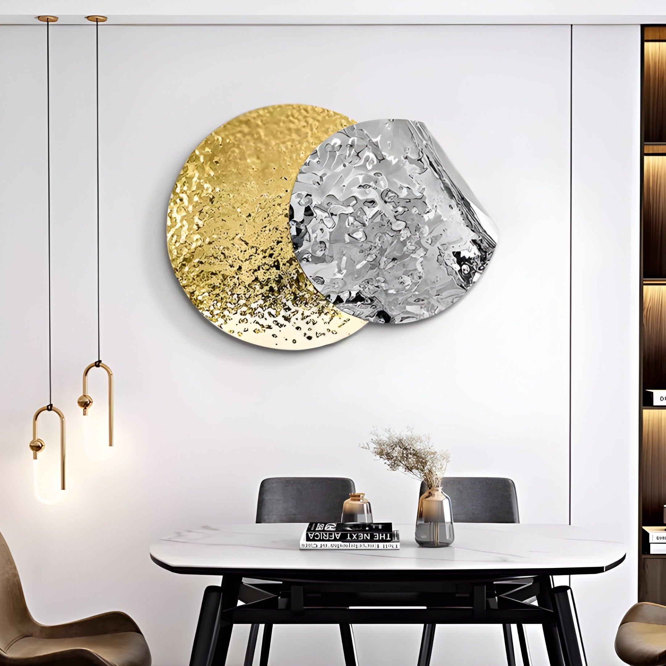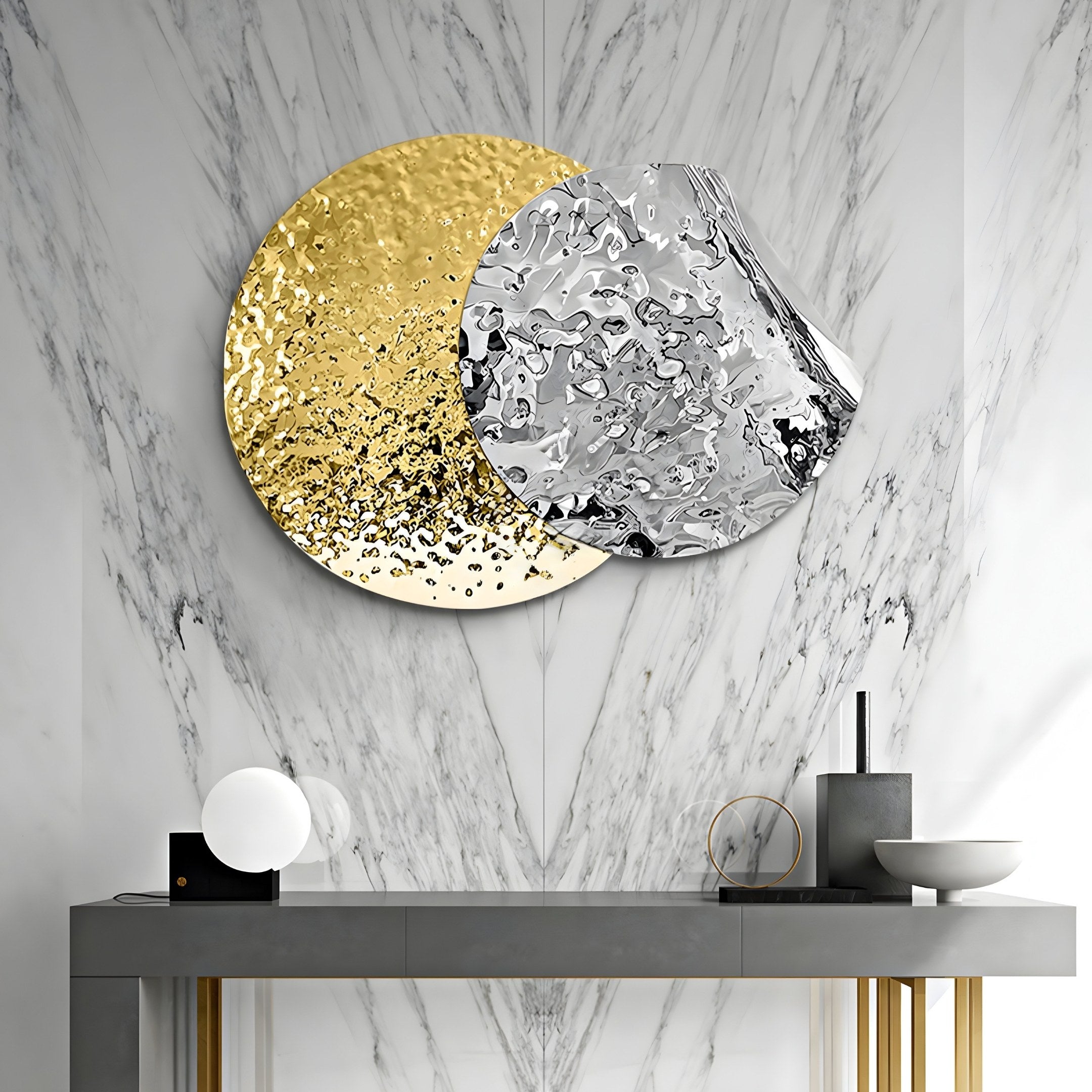 The Metaluxe IV Gold & Silver Dual Disc Textured 3D Wall Art combines opulent design with modern sophistication, creating a stunning centrepiece for your home. Crafted from high-quality stainless steel, this wall art showcases two overlapping discs – one in a radiant gold finish and the other in a shimmering silver. The unique hammered texture adds depth and visual interest, reflecting light beautifully. The golden disc adds a warm, inviting touch, while the silver disc lends a sleek and modern appeal. Together, they create a harmonious balance that brings elegance to any room.