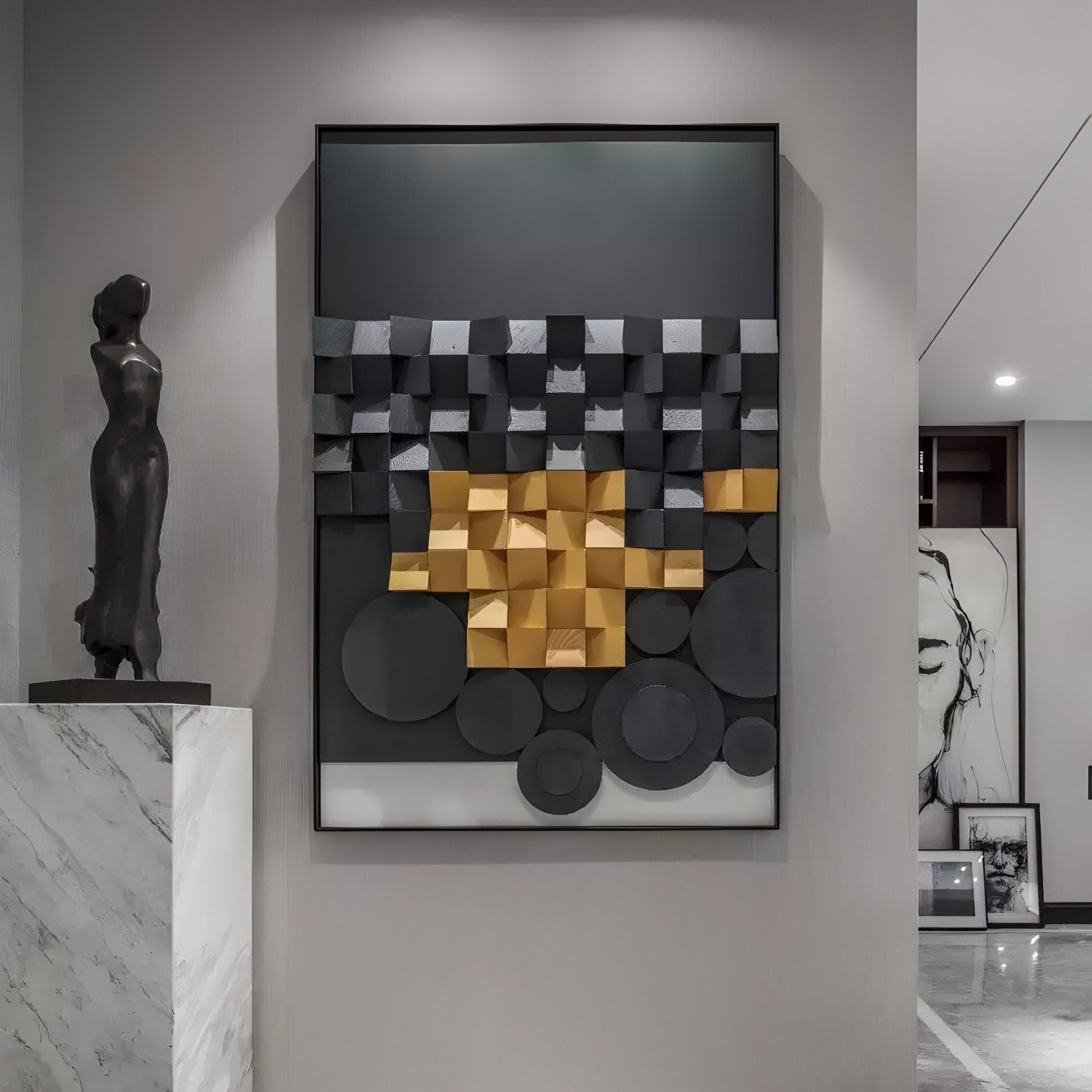This wall art stands out with its structured arrangement of gold-tinted cubes seamlessly transitioning into darker tones. The juxtaposition of circular and square elements adds a sense of movement and balance, creating a statement piece for living rooms, offices, or creative spaces. The Obscura design is versatile, making it suitable for settings that demand understated luxury or bold sophistication. Whether displayed as the central artwork in a gallery wall or as a stand-alone feature, its layered geometry commands attention without overwhelming the space. Handcrafted from high-quality wood, the piece celebrates precision and creativity, adding a touch of modern refinement. The combination of black and gold not only conveys a sense of opulence but also pairs effortlessly with a variety of décor styles, from industrial to minimalist.