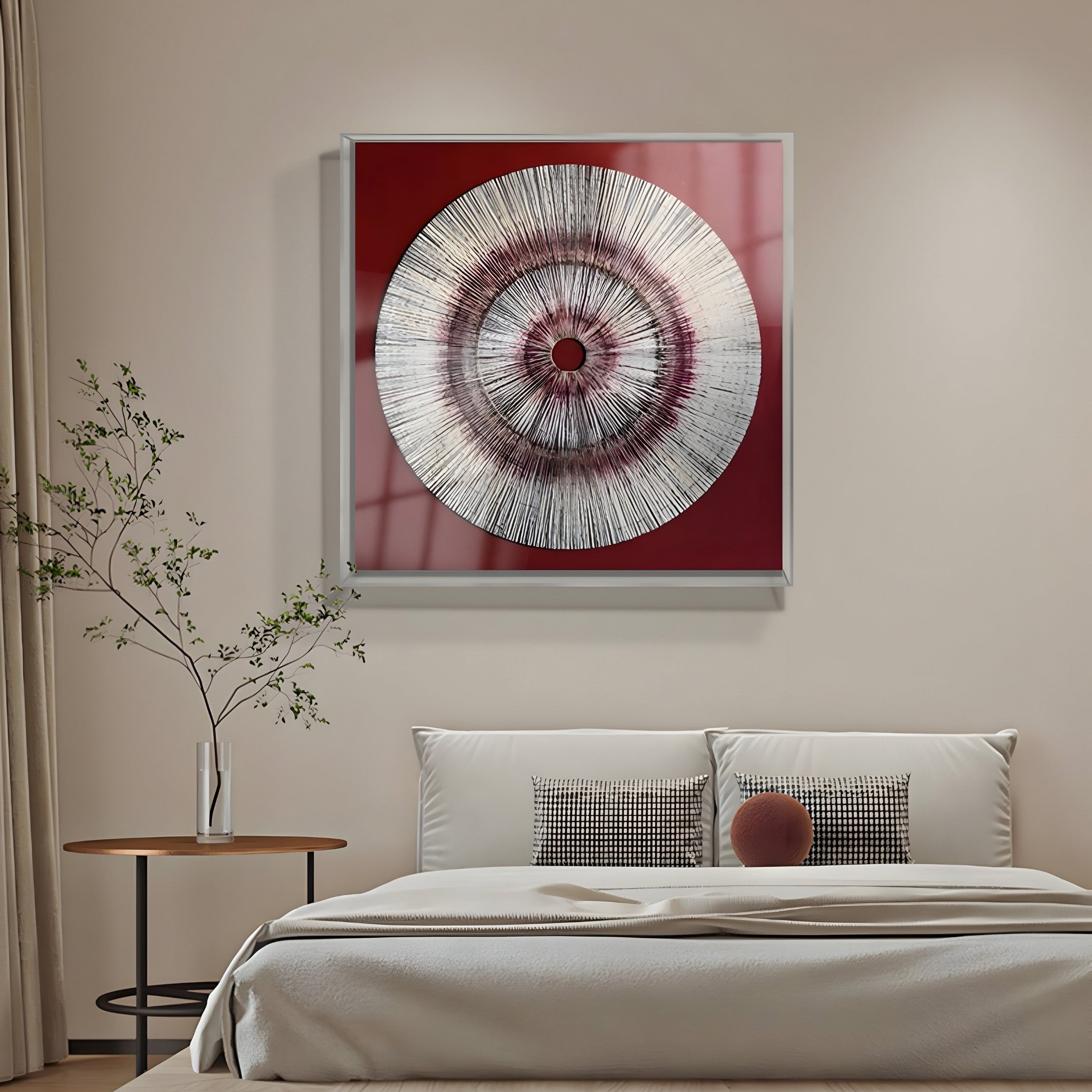 A striking circular form takes centre stage against a crimson backdrop in the Oculis Crimson Aura Square Handmade 3D Paper Wall Art. Layers of finely cut paper radiate from a focal point, creating an almost hypnotic gradient that shifts from pale grey to deeper red tones. Housed in a square acrylic box frame, this piece offers a fusion of classic geometry and contemporary design, making it ideal for bedrooms, lounges, or hallways that deserve a bold yet elegant statement. Each paper strand is placed with care, allowing subtle variations in shade and thickness to catch the eye, while the deep red background brings warmth and depth to the composition.