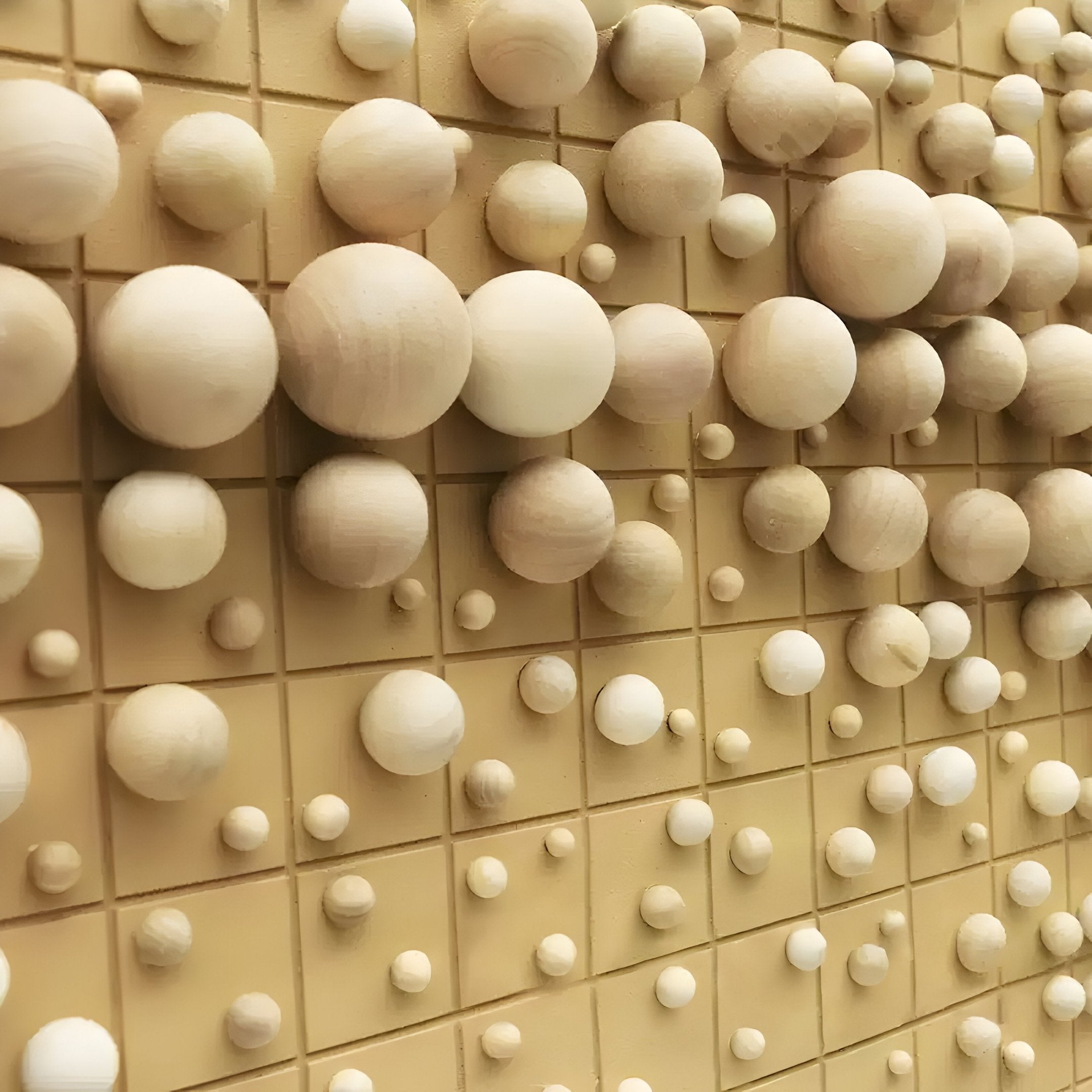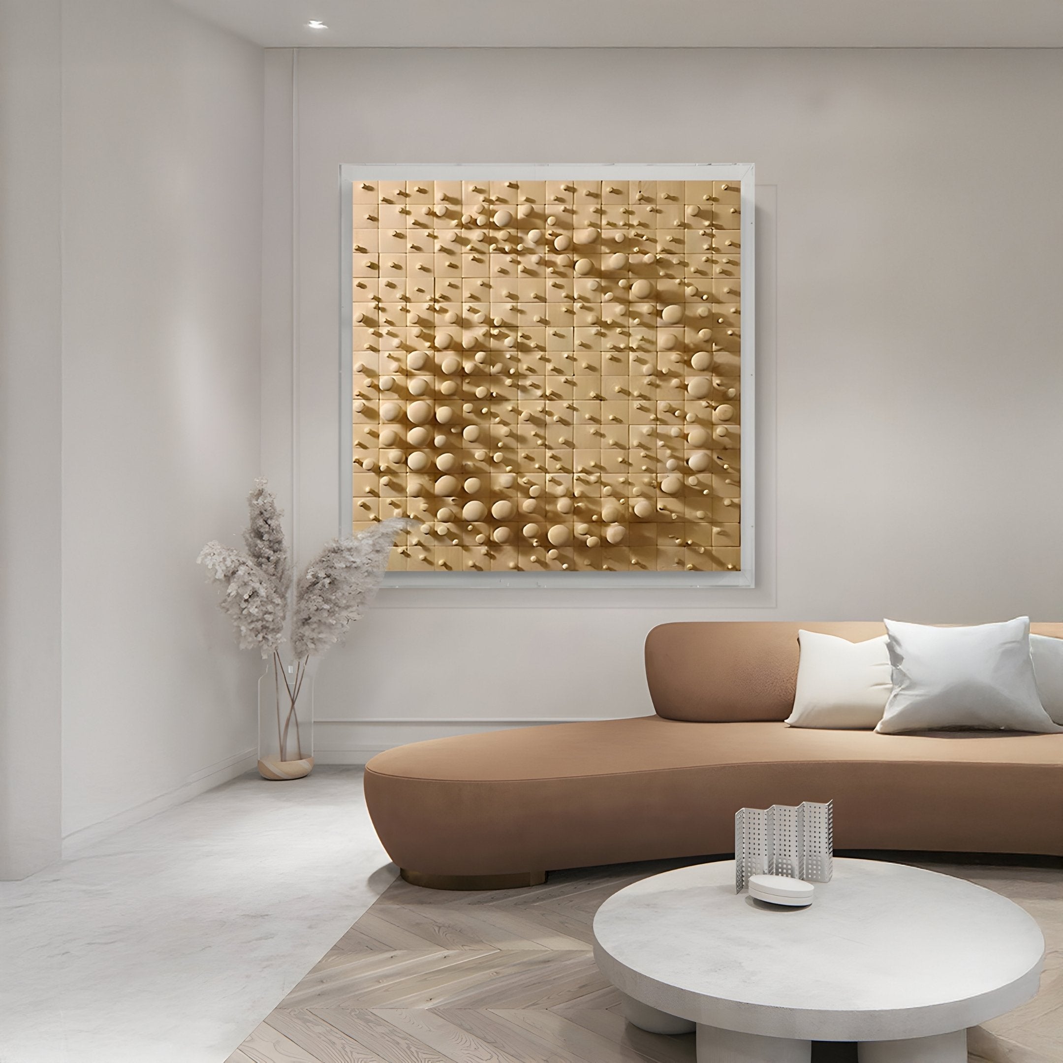The Orbila Circular Flow Wooden Spheres 3D Wall Art is a mesmerising piece that effortlessly combines natural wooden textures with artistic precision. Encased in a sleek acrylic box, this design features an array of wooden spheres arranged to mimic a circular flow pattern, creating a dynamic and hypnotic effect. The spheres vary in size and are meticulously placed over a gridded wooden base, enhancing the dimensionality and overall structure. This artwork's warm, natural wood tones contrast beautifully with the minimalistic acrylic enclosure, making it an ideal choice for modern interiors.