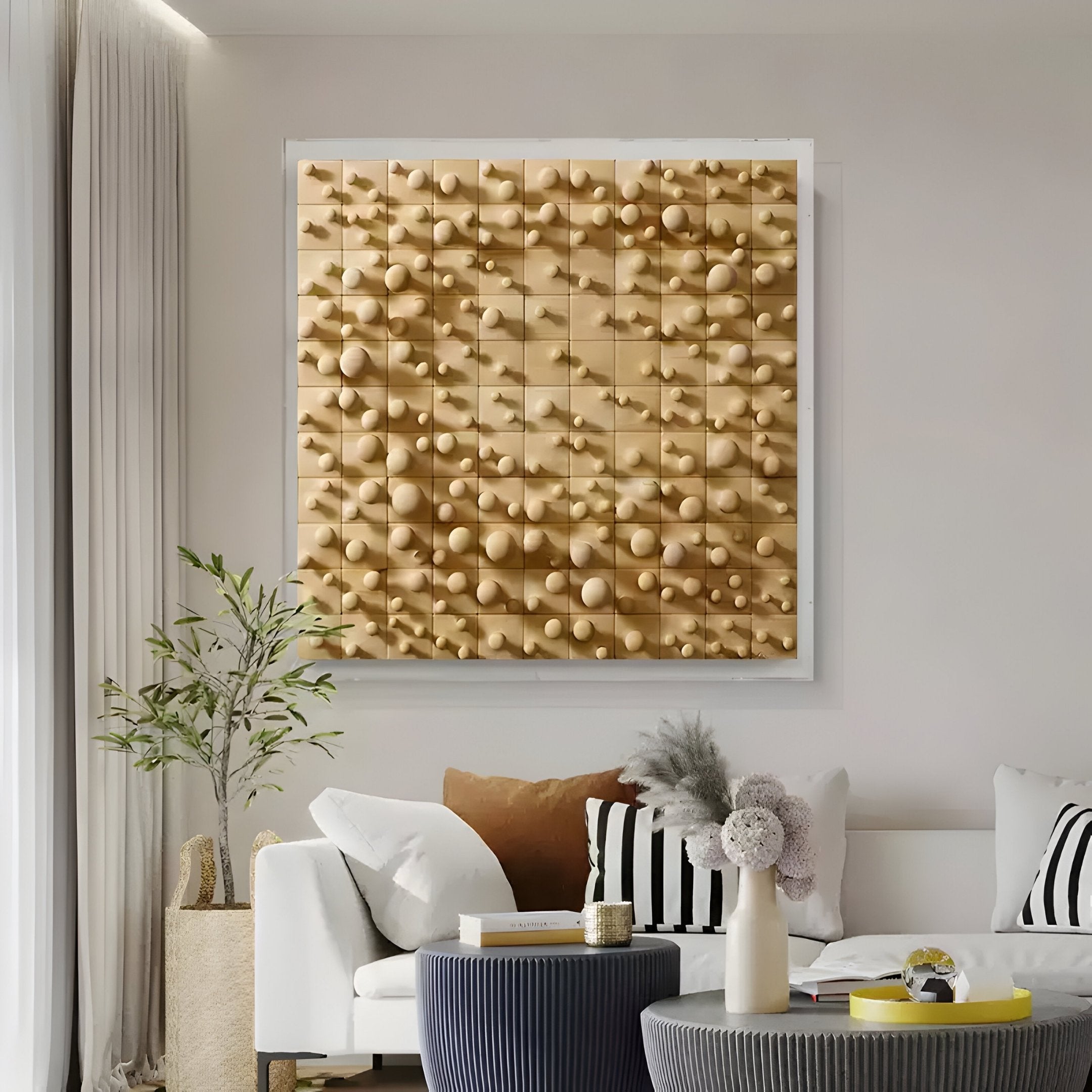 The Orbila Wooden Spheres Dynamic 3D Wall Art is a visually captivating display of craftsmanship and innovative design. Featuring an array of meticulously hand-carved wooden spheres of varying sizes, this artwork creates a dynamic pattern that flows across a gridded wooden panel. Encased in an elegant acrylic box, the piece combines modern aesthetics with natural elements. The interplay of light and shadow enhances its dimensionality, giving the spheres a floating effect and adding depth to any room. This wall art serves as both a statement piece and a versatile addition to contemporary interiors.