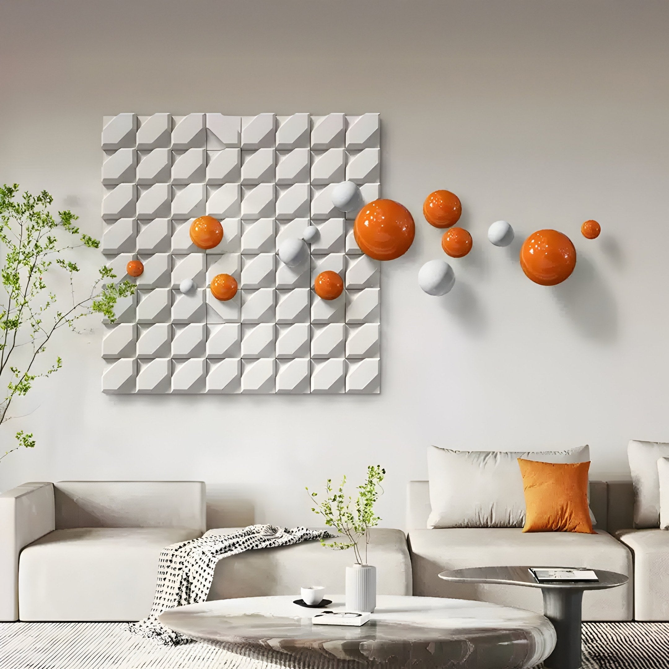 The Orbina White 3D Wood Relief Wall Art With Orange & White Metal Ball blends crisp geometric carving with lively metallic spheres to create a bold statement piece for modern interiors. A square wooden panel, meticulously carved into a raised relief, provides the backdrop for an array of orange and white orbs. Each sphere stands out against the white base, offering a playful contrast that draws attention to the artwork’s layered design. The reflective finish on the orange metal balls brings a burst of vibrancy, while the white metal spheres contribute a subtle, cohesive element. This unique fusion of textures and tones instantly captures the eye and sparks conversation.