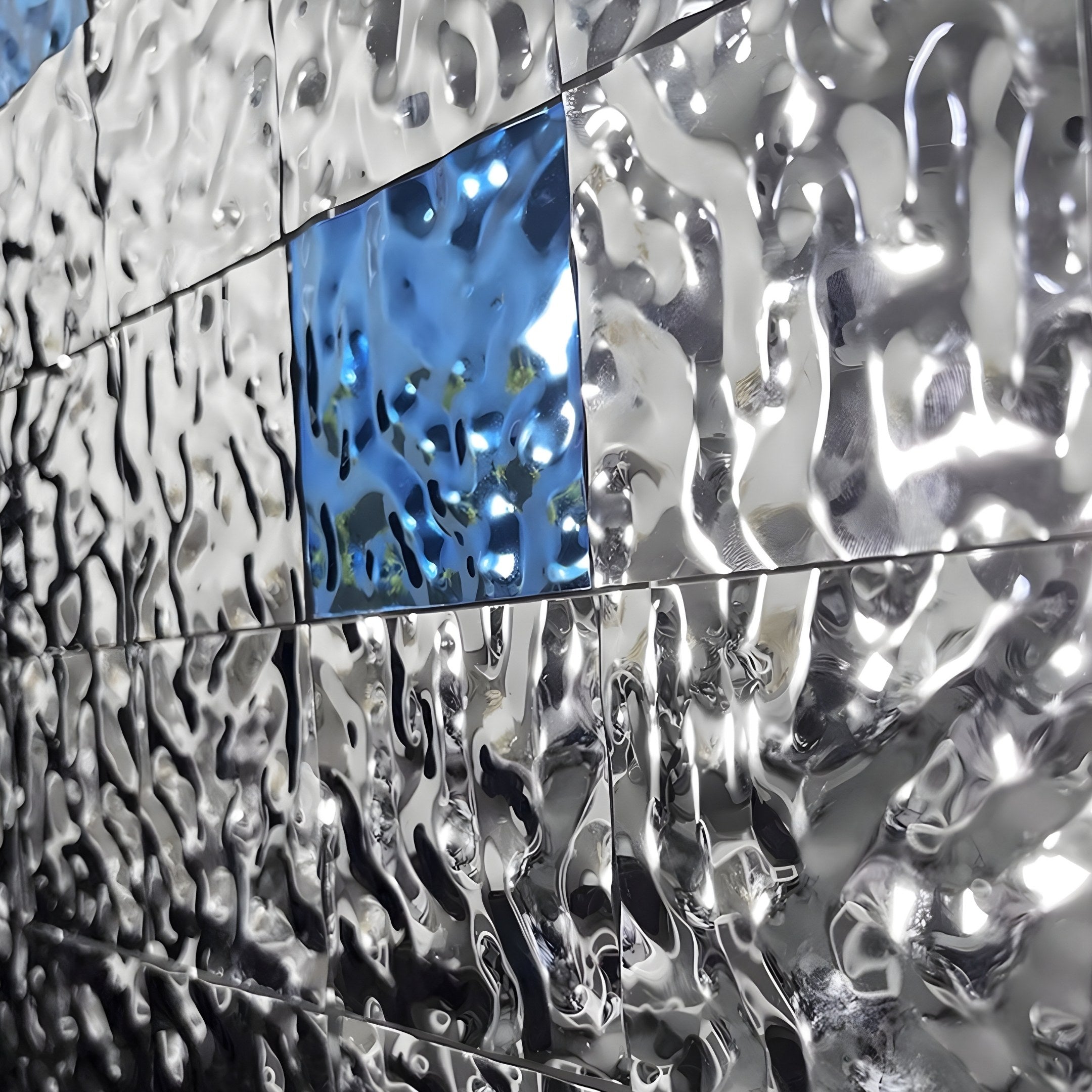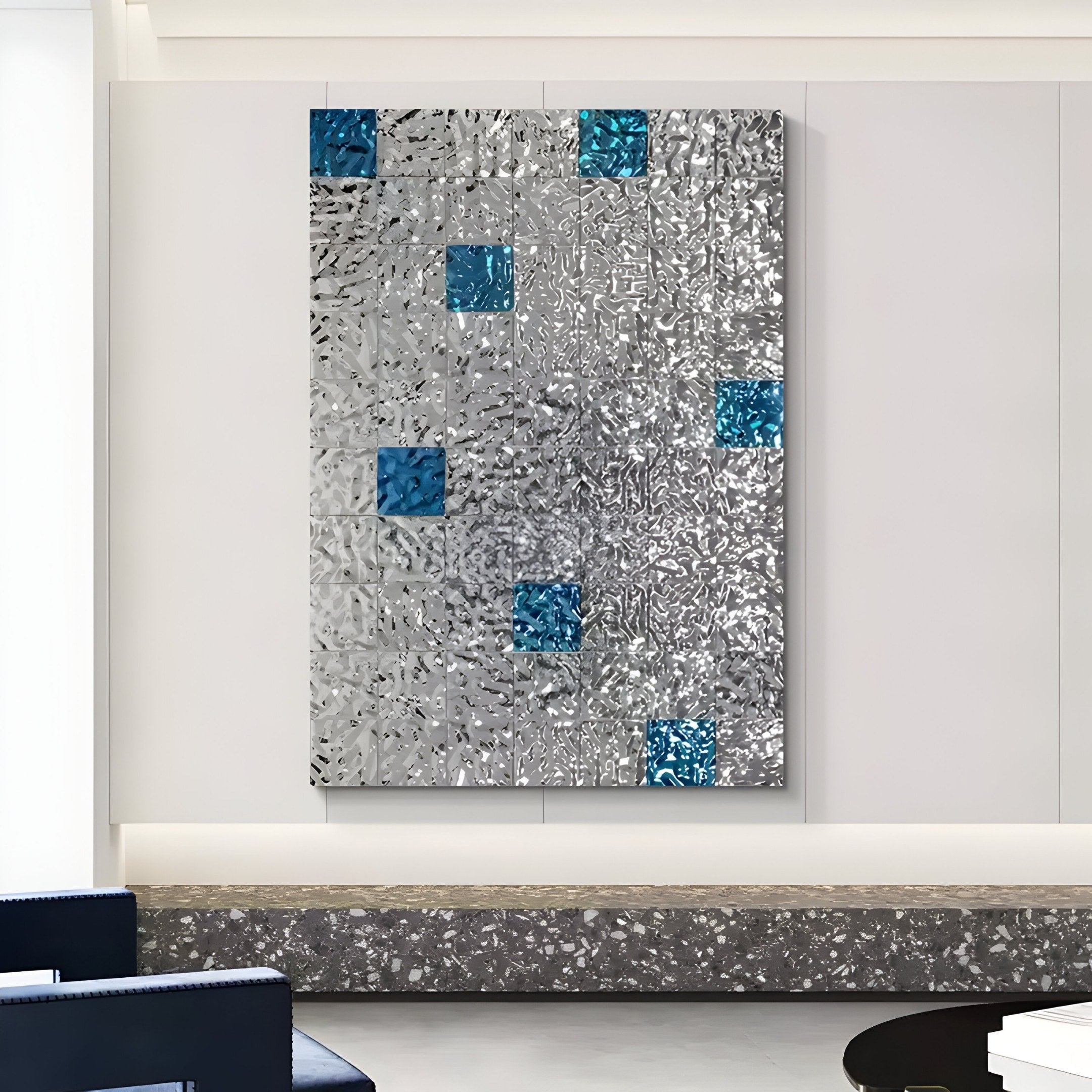 This eye-catching Prismatica Blue & Silver Mosaic 3D Wall Art features a stunning combination of polished stainless steel and vibrant blue accents. The intricate, wave-like textures reflect light beautifully, creating a sense of depth and motion across its surface. Strategically placed blocks of shimmering blue punctuate the silver background, offering a bold yet balanced design. The abstract arrangement makes it a perfect statement piece for contemporary interiors seeking both style and sophistication.