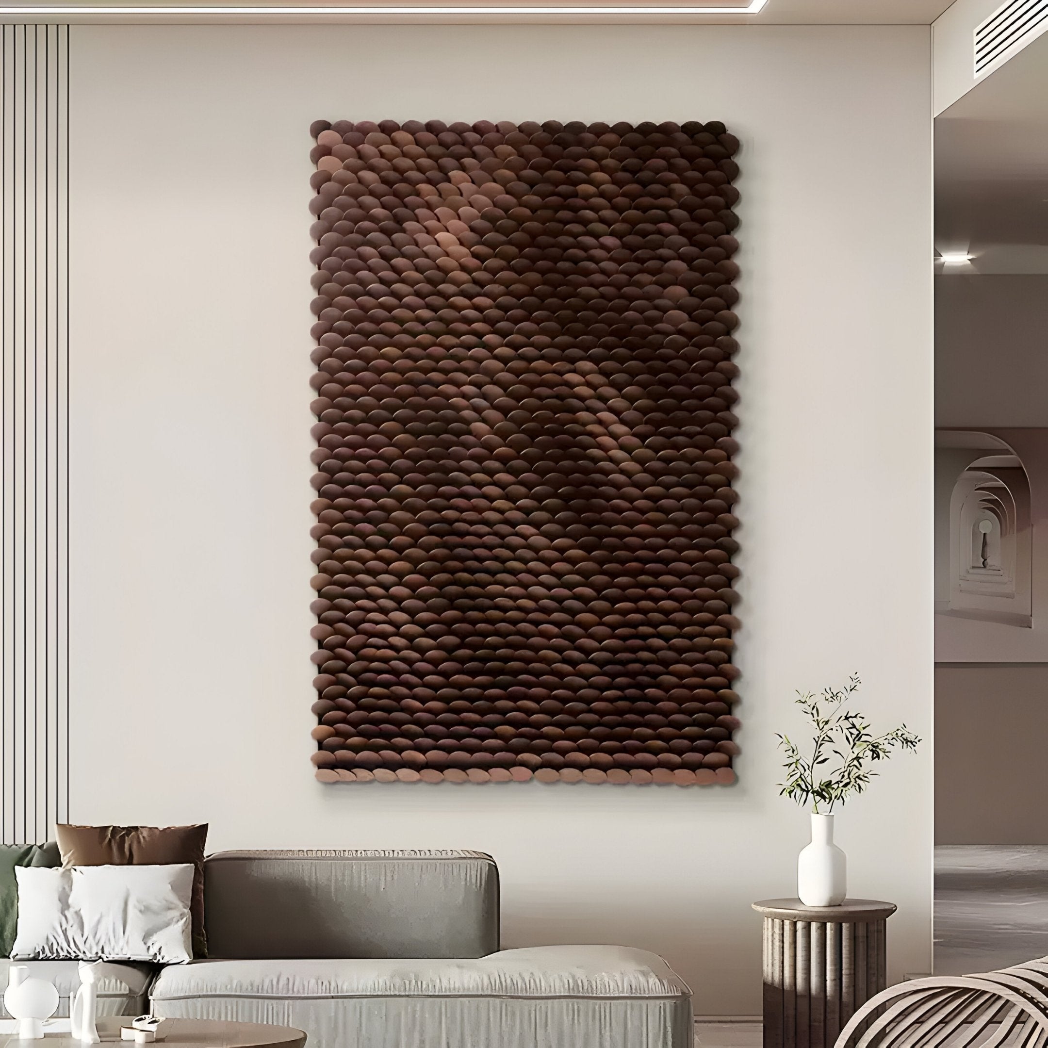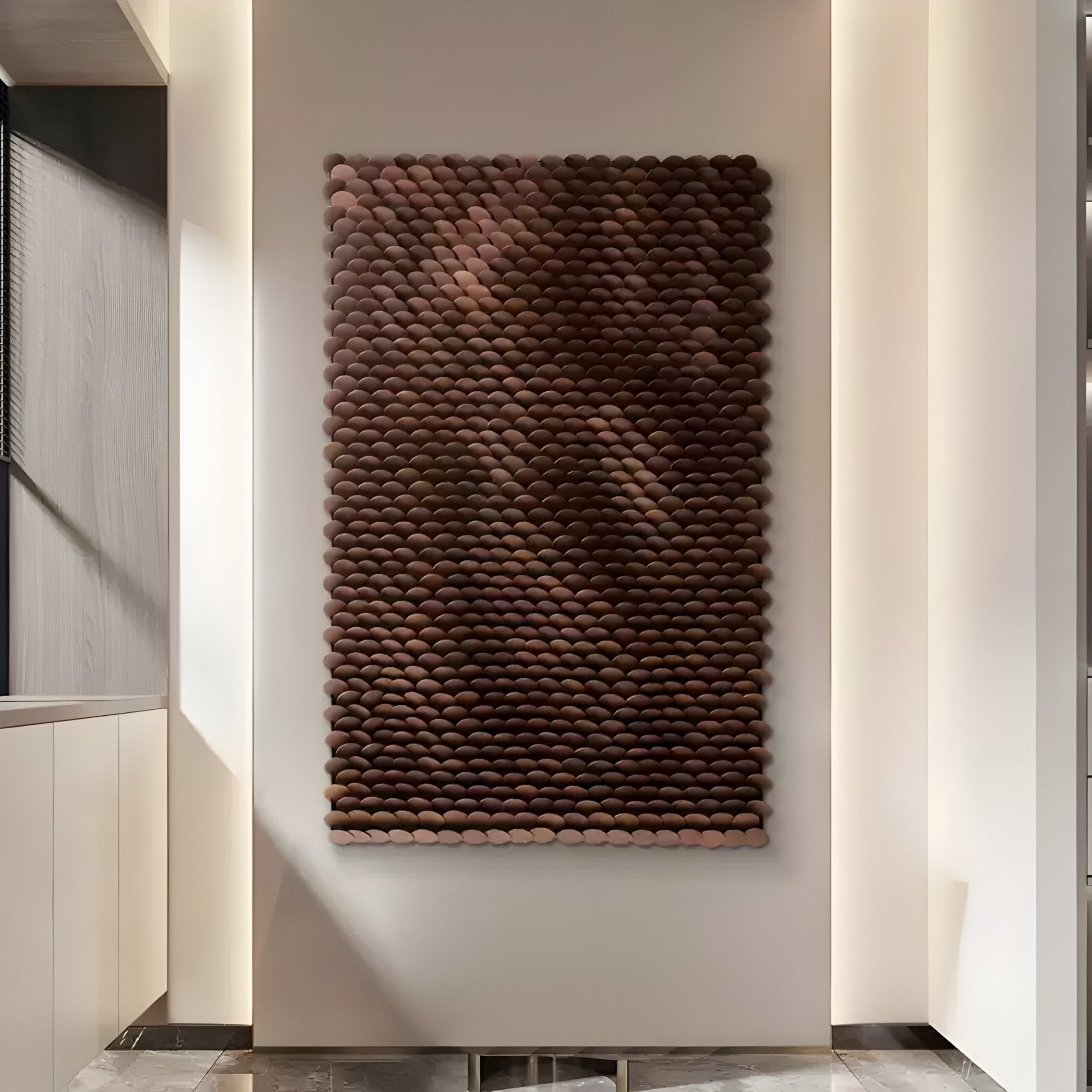 This 3D wall art captures the beauty of natural textures with its flowing, scale-inspired design. The carefully arranged elements create a tactile surface that adds character and intrigue to your walls. Its warm brown finish complements both modern and rustic interiors, harmonising effortlessly with earthy tones and neutral palettes. As a standalone piece, it transforms any blank wall into a focal point, while its durable wooden construction ensures longevity. This vertical design is particularly effective in adding visual height and elegance to compact or large spaces alike.