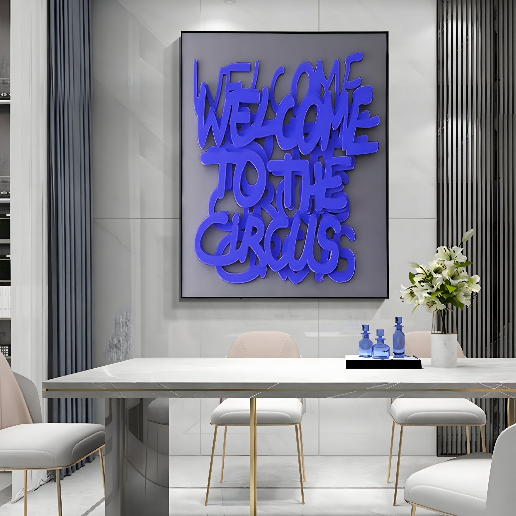 The Urbanic Blue Welcome Script 3D Wooden Graffiti Wall Art is a striking and contemporary piece that merges street art aesthetics with refined craftsmanship. It features the bold phrase 'Welcome to the Circus' in dynamic graffiti-style typography, meticulously carved from high-quality wood and painted in an eye-catching shade of electric blue. The layered 3D design adds dimension and depth, creating captivating light and shadow effects that enhance its visual appeal. Against the neutral background, the vivid blue lettering commands attention, making it a standout centrepiece while maintaining harmony with modern interiors.
