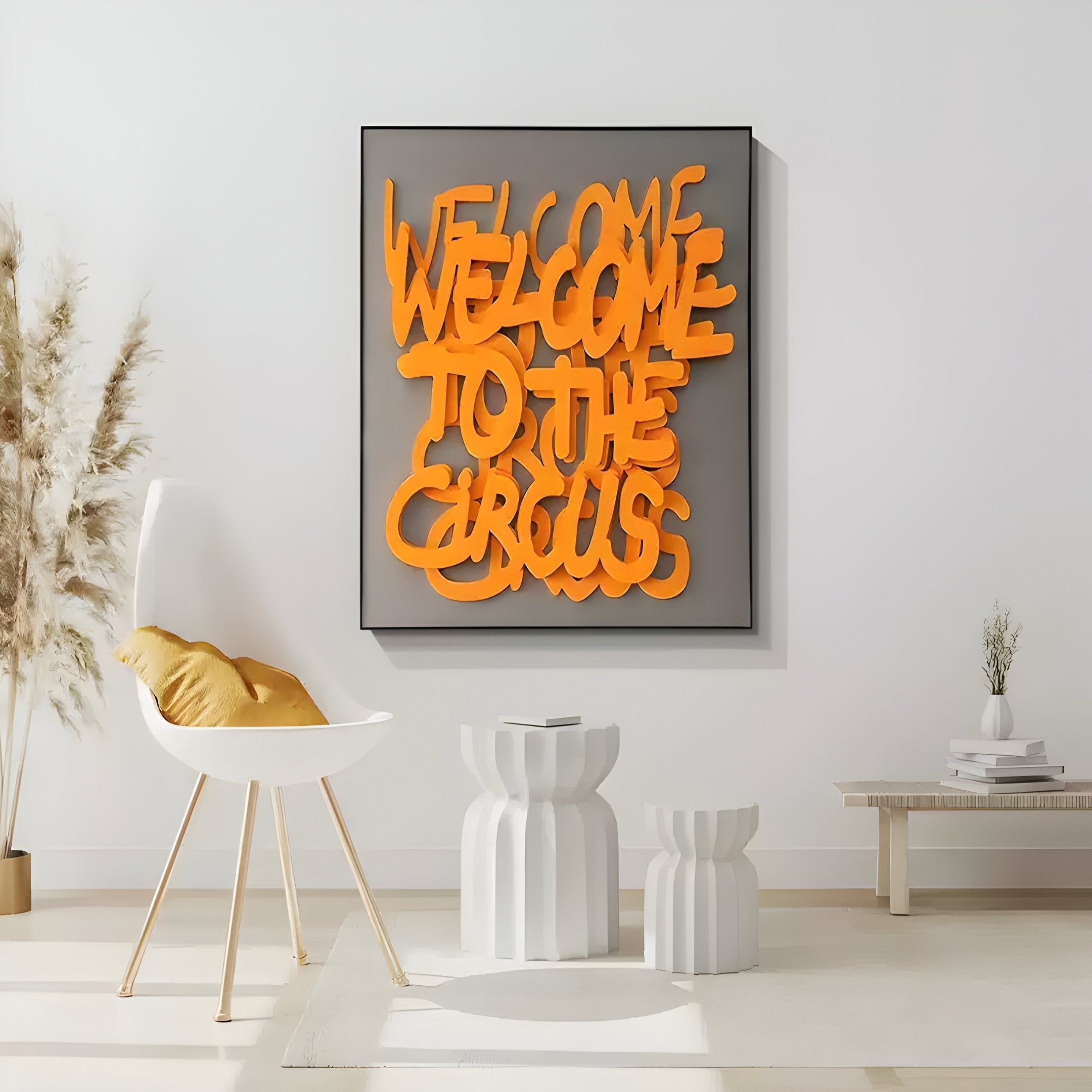 The Urbanic Orange Welcome Script 3D Wooden Graffiti Wall Art merges the vibrancy of street art with impeccable craftsmanship. Displaying the bold phrase 'Welcome to the Circus' in graffiti-inspired typography, this artwork is carved from high-quality wood and finished with a bright orange paint. Its layered 3D design adds a striking depth, while the interplay of shadows enhances the dynamic visual appeal. Mounted on a neutral backdrop, the vivid orange lettering stands out brilliantly, making it a centrepiece that transforms plain walls into captivating displays.
