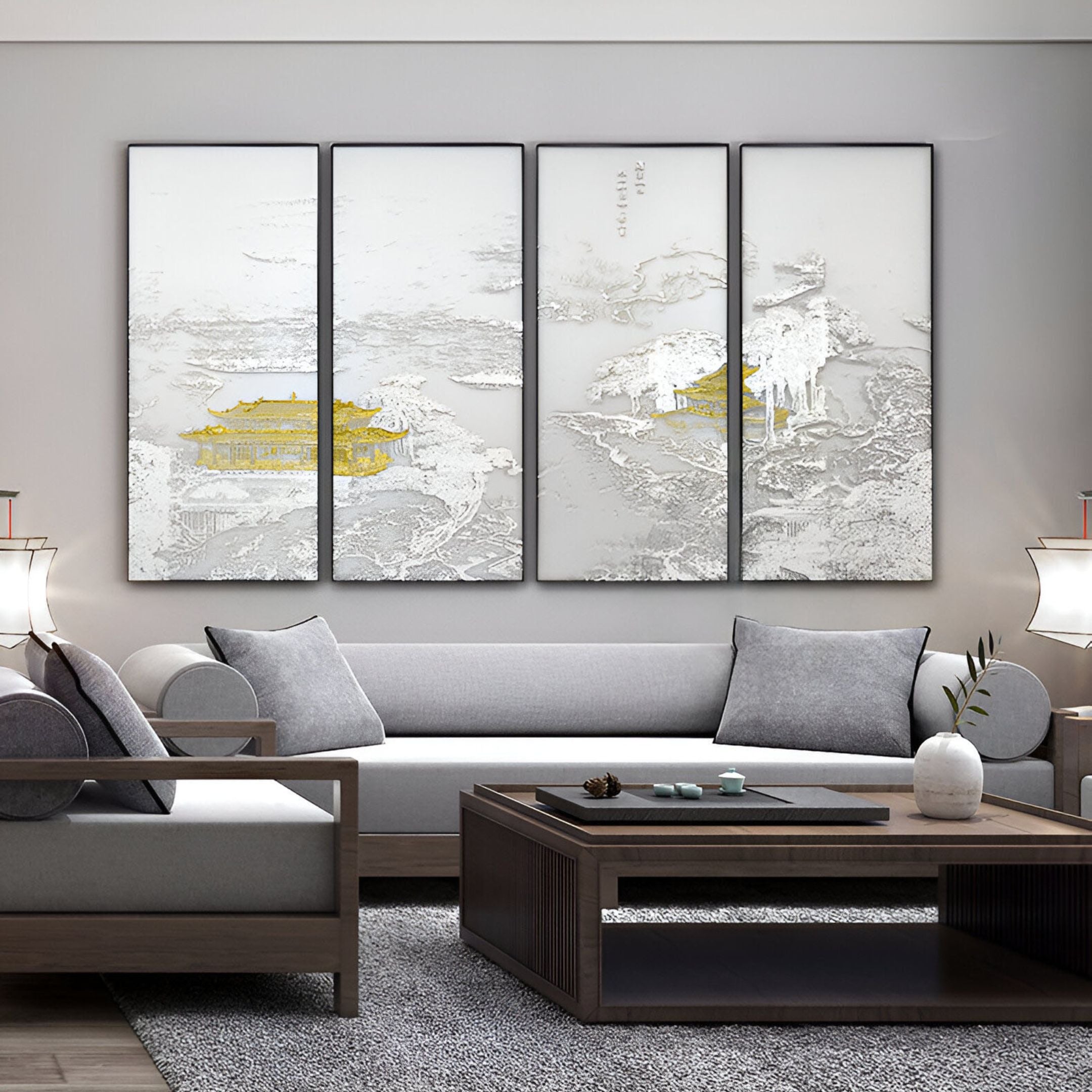 This elegant multi-panel silk wall art is designed to enhance sophisticated interiors. Ideal for living rooms, dining areas, or corporate spaces, its neutral tones and gold foil accents make it versatile enough to complement both contemporary and traditional decor styles. The 3D gold detailing interacts beautifully with natural and artificial light, creating a dynamic focal point in any room. Used as a centrepiece on a feature wall or as part of a curated art collection, this artwork transforms spaces with its serene yet commanding presence. Perfect for those seeking to combine artistic excellence with luxurious decor.