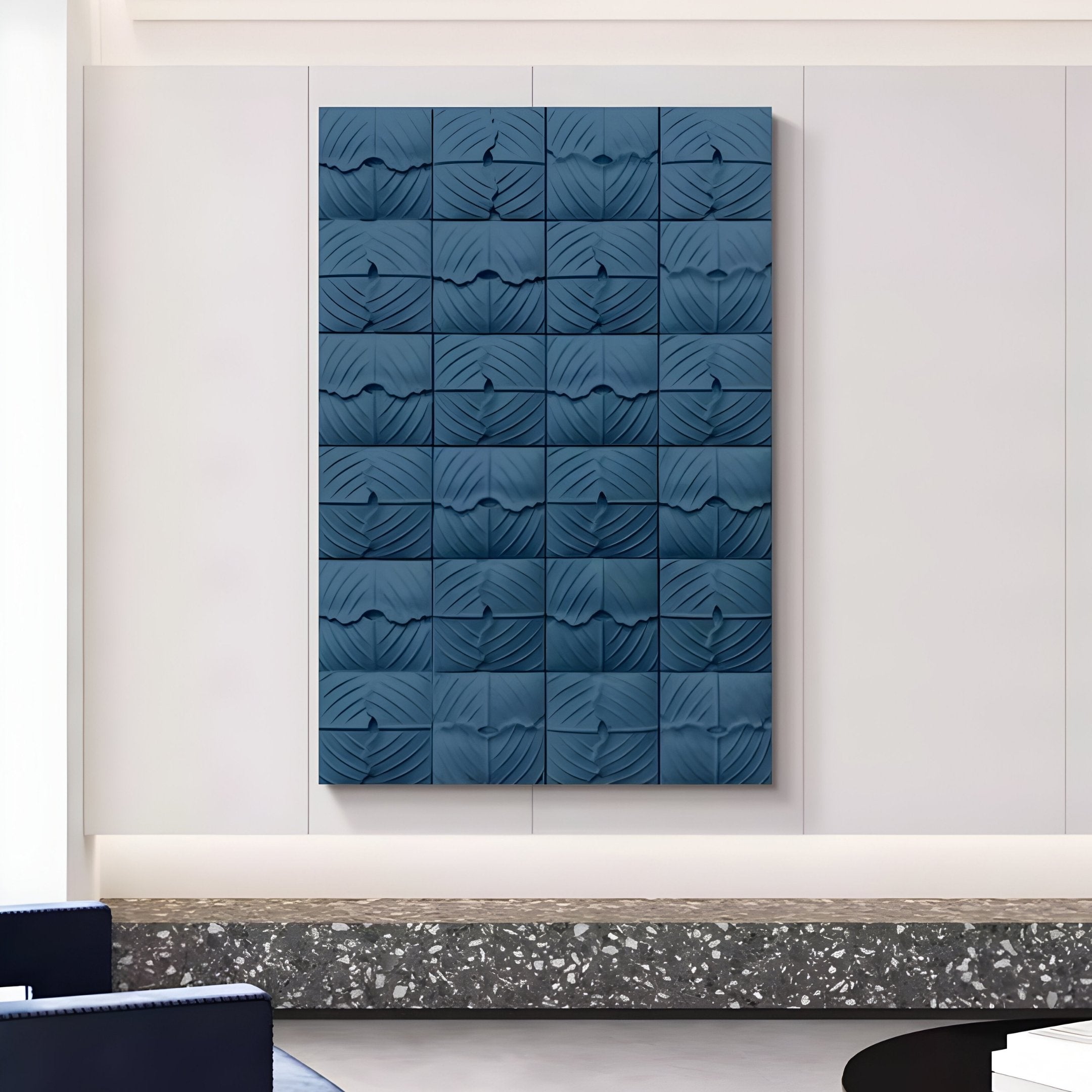 Perfect for modern, coastal or tonal interiors, this panel pairs well with soft whites, sandy beiges, and even deep greys. Its sculptural quality gives it versatility, functioning as both a statement piece and a subtle background texture. Designed for indoor use, it works especially well in quiet reading areas, hallway walls, stairwell landings or minimal workspaces. Each tile is carved and finished by hand, ensuring slight natural variation across the grid. The blue tone is moody without feeling heavy, and the relief work gives the piece a tactile presence that shifts with daylight. Inspired by Italian abstract minimalism and nature-informed design, the Vellura Blue panel blends symmetry with subtle topography. Whether used solo or in a tonal series, it offers balance, movement, and depth without overwhelming a space.