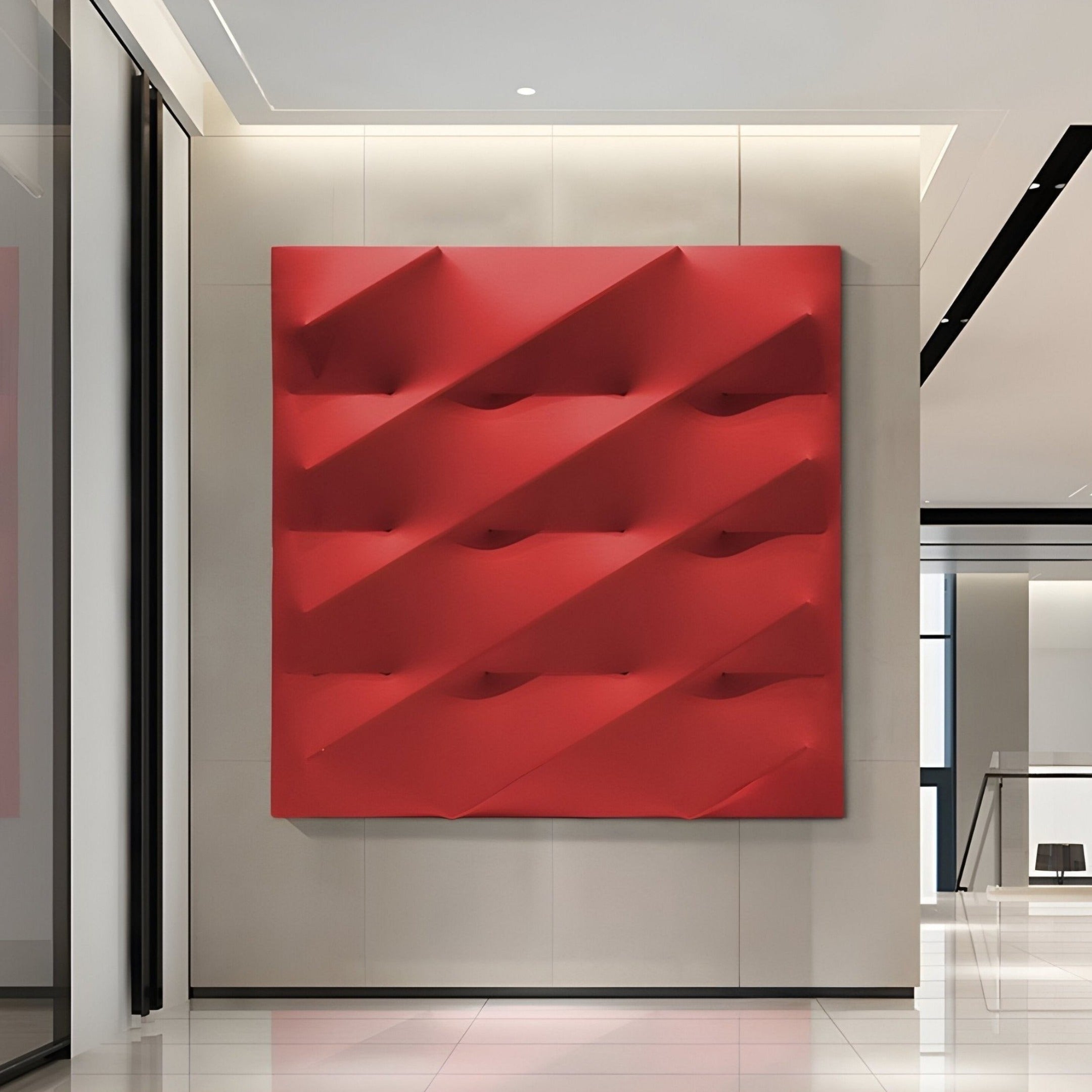 The Verto Bold Red Stretch Fabric Layered Wooden 3D Wall Art is a dynamic fusion of minimalist design and bold colour. Crafted from premium wood and overlaid with textured stretch fabric, this artwork showcases a striking diagonal pattern that adds depth and dimension. The vivid red hue commands attention, creating a dramatic interplay of light and shadow that evolves with the room's lighting and perspective. Its clean, geometric structure and monochromatic aesthetic make it a statement piece for any modern interior, blending artistic sophistication with contemporary charm.