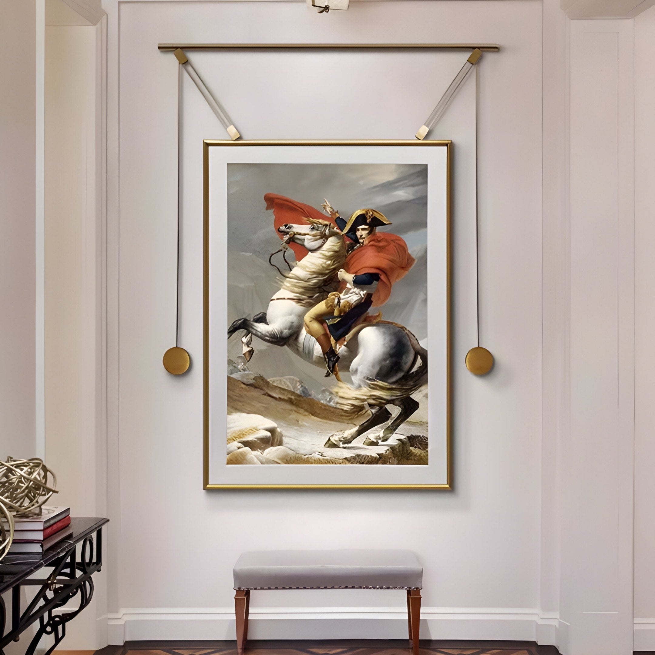 The Aristo Napoleon On Horseback Painting Gold Frame Hanging Wall Art captures a moment of historical grandeur and power. This iconic painting showcases Napoleon Bonaparte astride a rearing white stallion, exuding strength and leadership. The fine details, from Napoleon’s vibrant red cloak to the dynamic movement of the horse, are masterfully reproduced through high-definition inkjet printing. Encased in a sleek gold frame with a luxurious finish, the painting adds sophistication and a touch of classical art to any room. Its balanced composition and meticulous brushwork pay homage to traditional European artistry, making it a perfect statement piece.