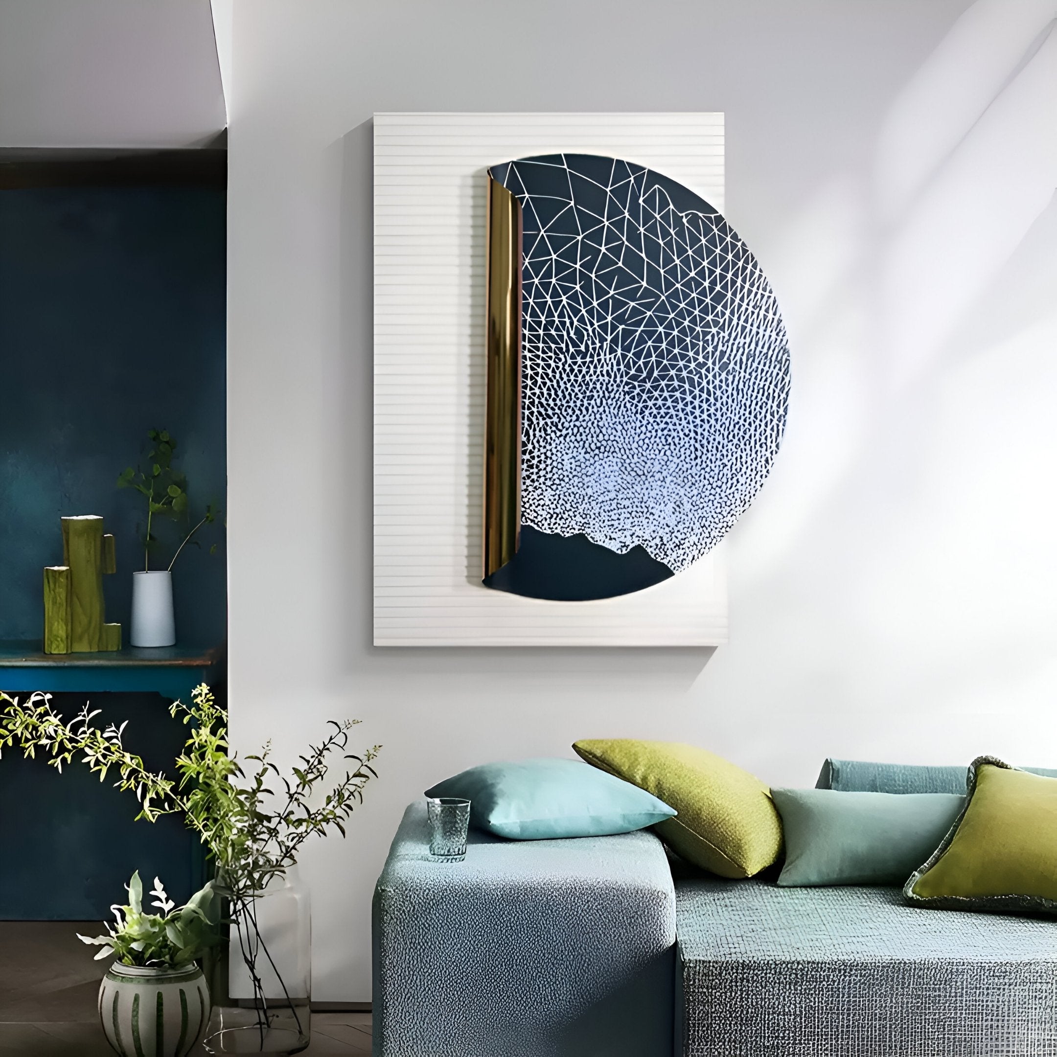Artevia Blue & White Geometric Wood Relief 3D Wall Art is a precision-crafted, high-impact mural that balances structure with motion. A polished semicircle in a deep, inky blue commands attention with its complex grid of white etched lines. These intersecting paths dissolve towards the bottom in a cascade of delicate, data-like fragments, resembling both digital architecture and organic cellular networks. This intricately finished form is anchored against a vertical gold stainless steel divider and mounted on a ribbed white wood panel that subtly refracts light and frames the composition.