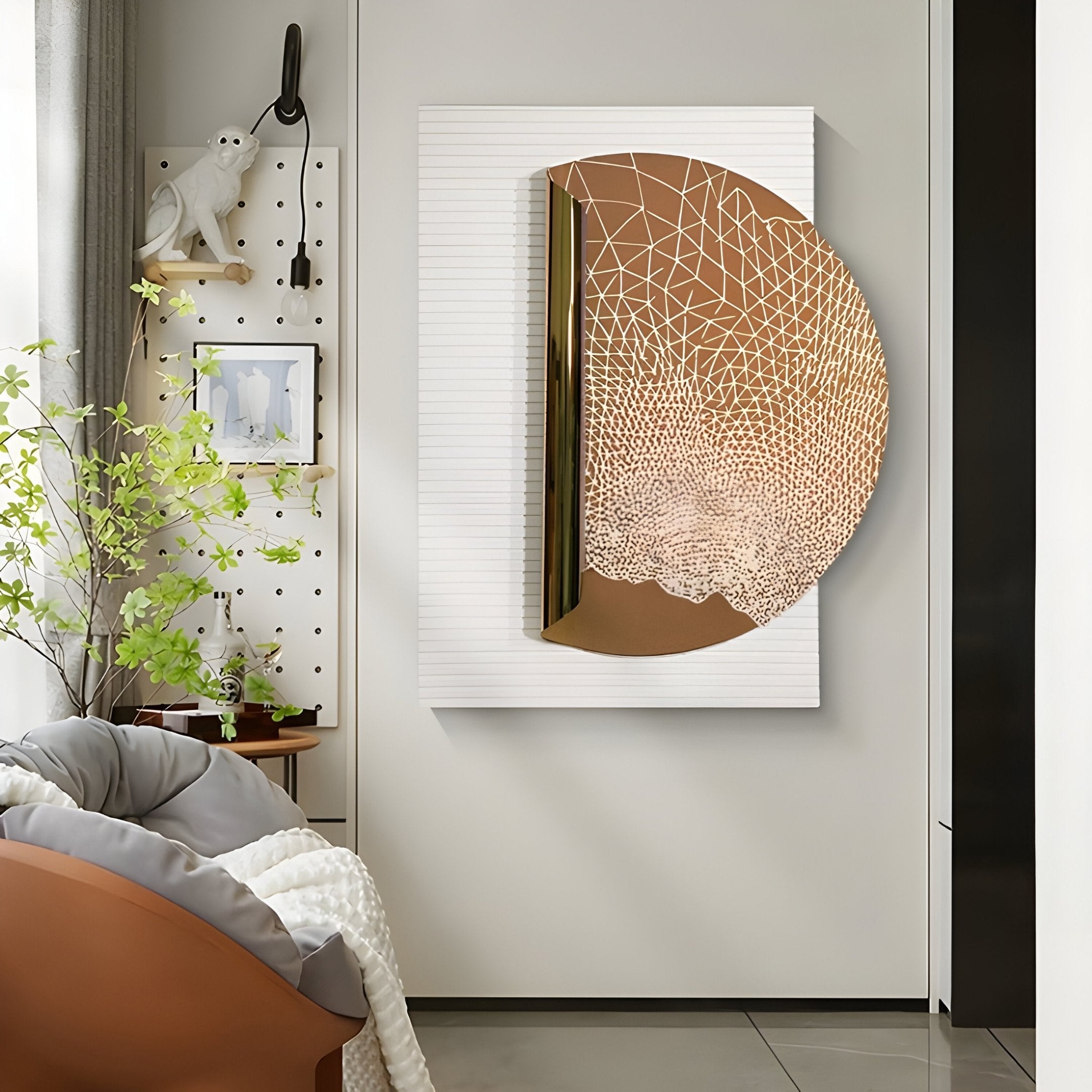 This artwork is built to stand out. From entryways to hotel lounges, the Artevia piece brings layered texture and light play without relying on loud colour. The mirrored finish catches ambient light and reflects its surroundings with subtle distortion, adding movement throughout the day. The gold tones read warm without being brash, and the textured white panel introduces a clean visual counterweight. Whether placed in a minimal white-walled room or against darker wood tones, this piece adapts, its contrast and craftsmanship do the heavy lifting. Designed with a premium combination of wood, stainless steel, and leather backing, it balances hard-edged modernity with material depth. Hang it vertically in corridors or stairwells for maximum impact, or use it to punctuate a larger wall with sculptural intent. It’s built to be noticed but finished to feel deliberate, not just decor, but design.