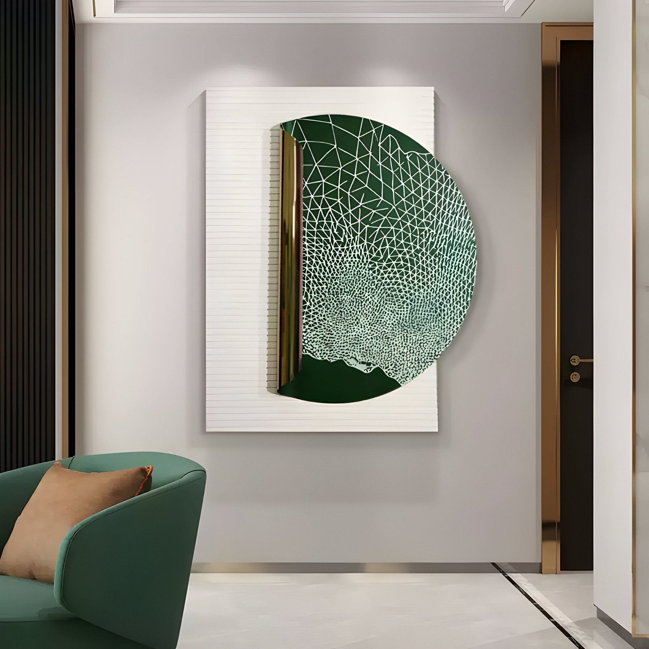 Artevia Green & White Geometric Wood Relief 3D Wall Art fuses material depth with clean, graphic lines. This sculptural piece features a deep forest green semi-circle in stainless steel, laser-etched with an evolving web of linear geometry that transitions from dense lattice to organic fragmentation. The radial pattern rises subtly from the glossy surface, enhanced by the reflective finish and angular distortions created by the relief’s curvature. Anchoring the design is a vertical column in brushed gold, forming a divide between the bold central disc and its white wood backing.