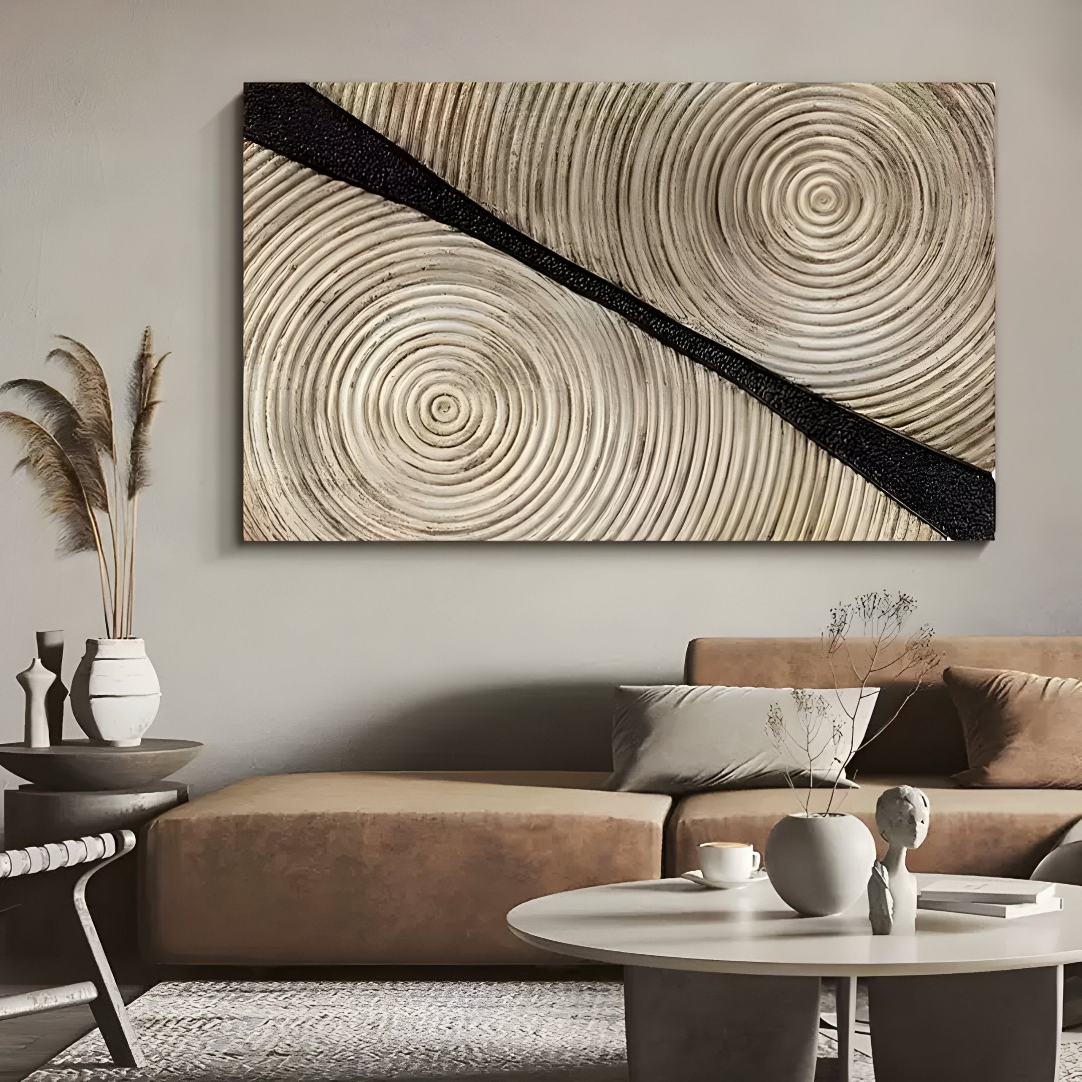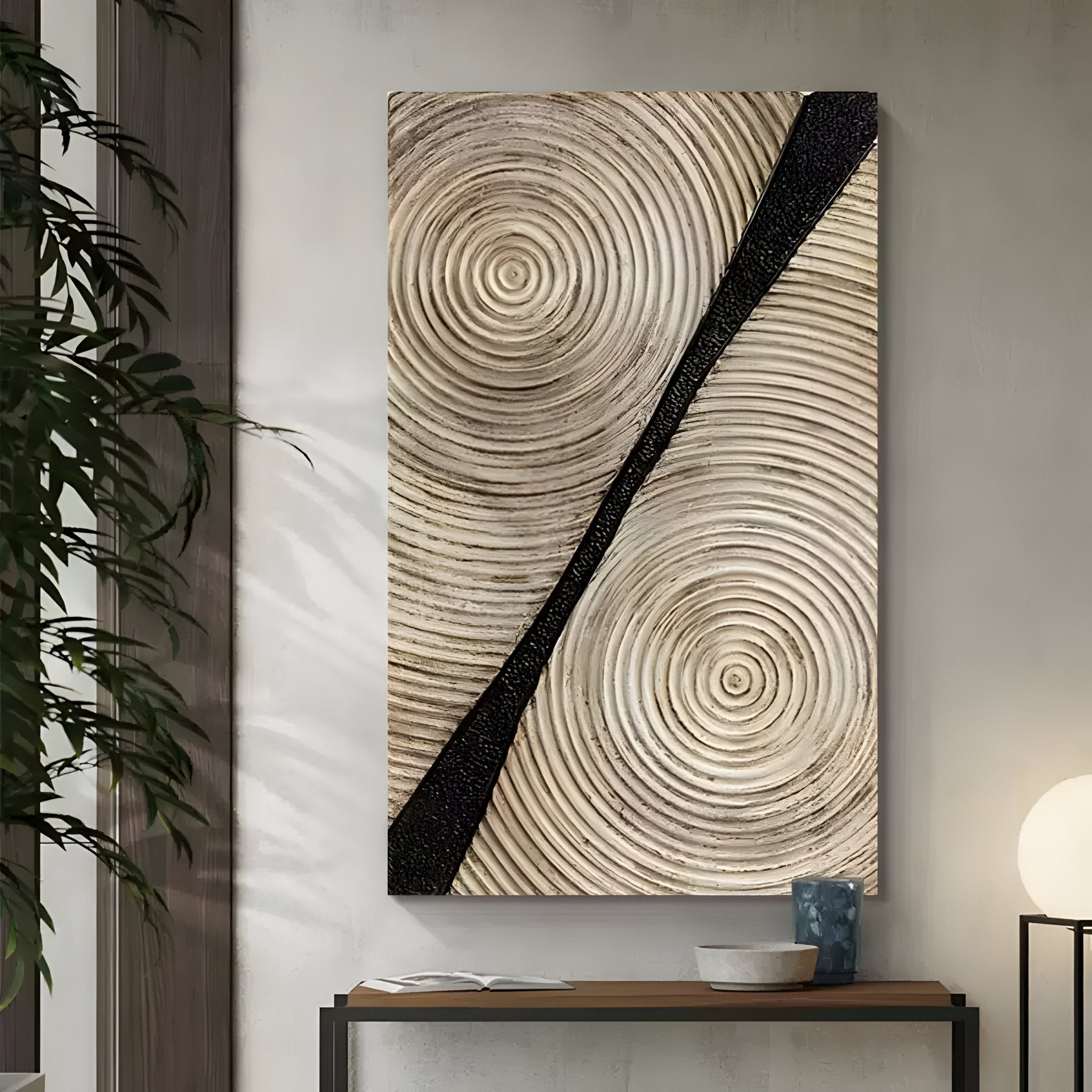The Artura Ivory Hand-Painted 3D Relief Wall Art offers sculptural calm and geometric rhythm in a refined vertical composition. Carved from wood and hand-painted in soft ivory tones, the surface features two opposing circular ripple patterns divided by a textured, matte black diagonal band. Each ringed section is built from evenly spaced concentric lines, creating a hypnotic flow that shifts subtly with light. The carved relief is elevated further by a sandstone-inspired finish that blends earthy imperfection with structured design.