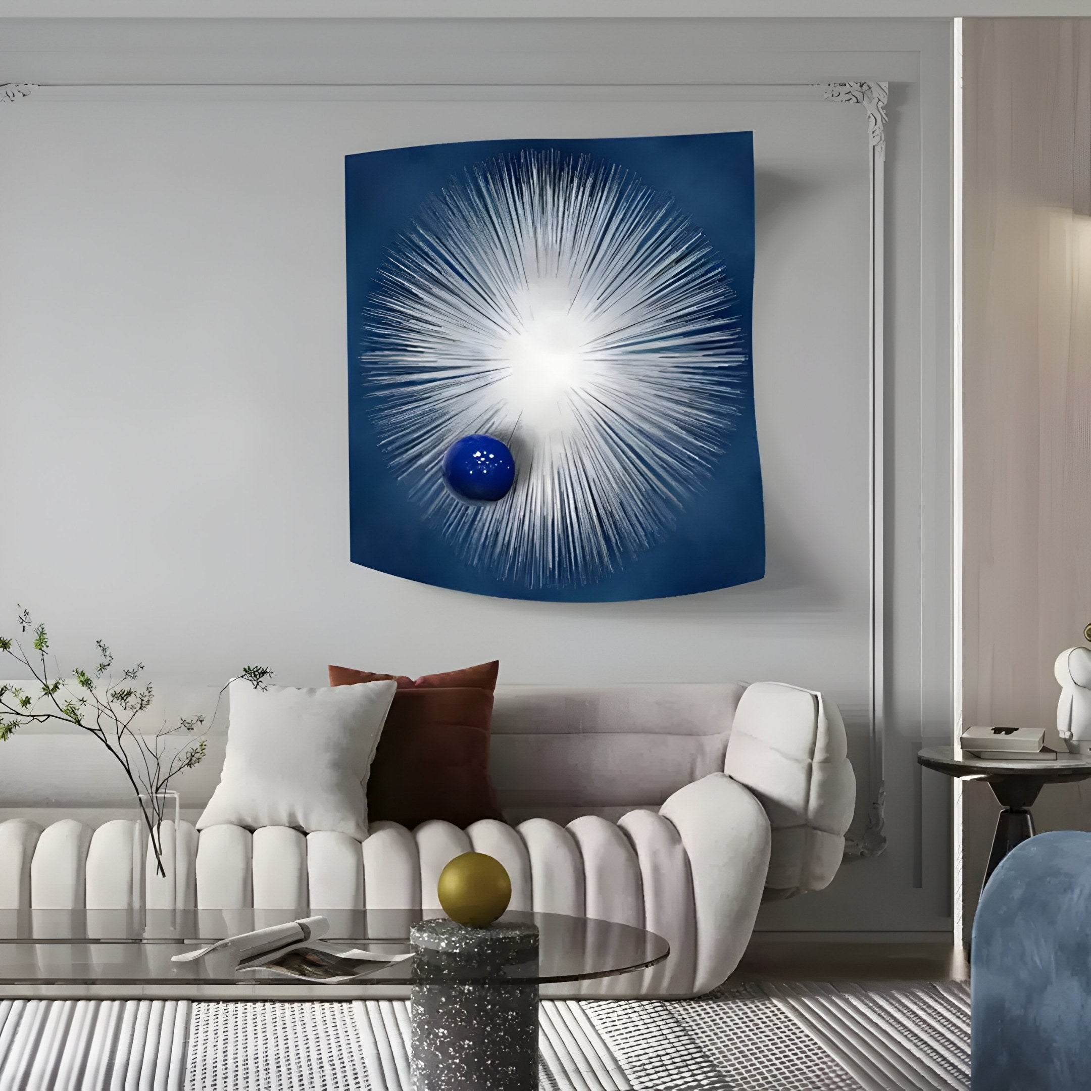 Crafted with precision and innovation, the Astralis Stellar Burst Abstract 3D Wall Art is a stunning artistic piece featuring an explosion of radiant white streaks set against a deep blue backdrop. This wall art showcases a captivating celestial-inspired design, enhanced by a glossy, spherical blue accent. The interplay of texture and dimension brings an otherworldly aura to any modern space, capturing the essence of cosmic energy. Meticulously constructed using high-quality materials, including stainless steel and hand-painted UV textures, this artwork makes a bold statement in any living room, office, or gallery setting.