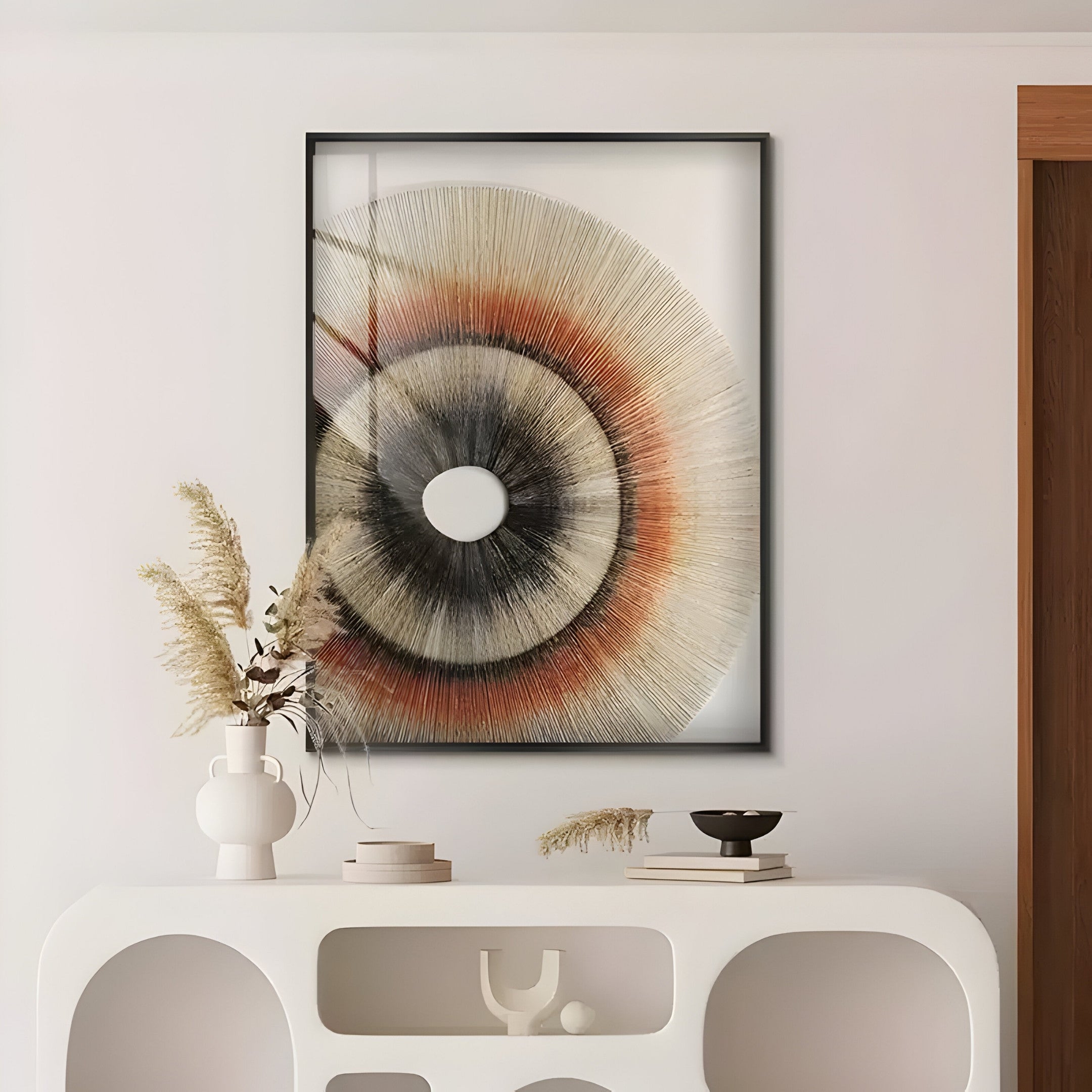 A captivating blend of earthy tones radiates through the concentric design of the Auralis Earthy Tone Concentric Circular Cardboard Craft Wall Art. Crafted from meticulously layered cardboard, this piece achieves a striking visual depth, resembling the gentle ripples of nature. The centrepiece, a minimalist circular void, enhances the artwork’s modern aesthetic, while the vibrant hues of warm oranges and deep browns transition seamlessly into soft creams, adding dynamism to the design. Encased in a sleek aluminium frame and protected by plexiglass, this work exemplifies the harmony between natural textures and contemporary craftsmanship.