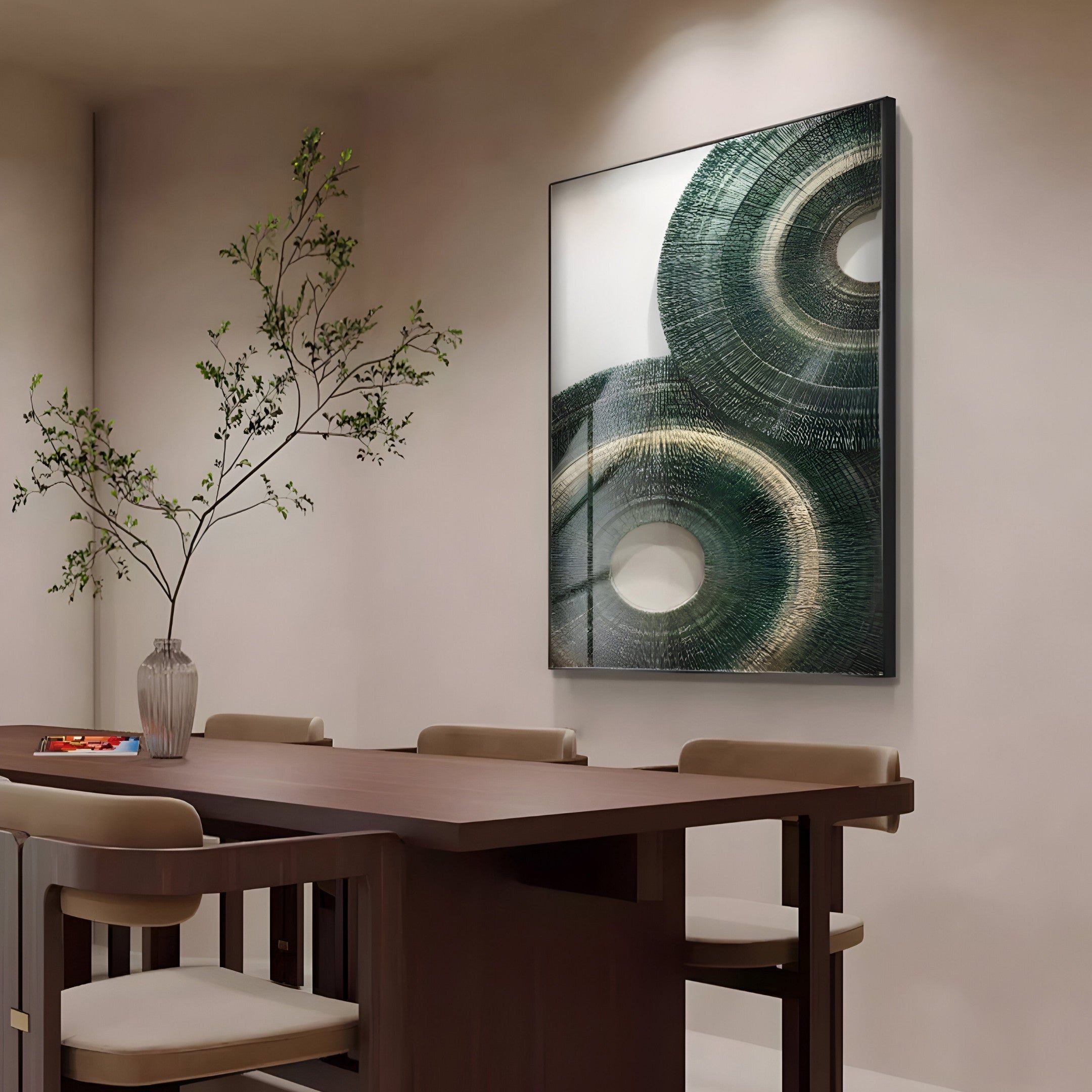 Transform your interiors with this versatile wall art that seamlessly complements both residential and commercial spaces. Ideal for dining areas, hallways, or office settings, the green-toned design exudes tranquility and sophistication. Its dual concentric patterns symbolize balance and harmony, making it an excellent fit for modern, Zen-inspired, or nature-themed decors. Whether mounted in a living room or displayed in an entryway, this artwork is guaranteed to spark conversation and admiration.