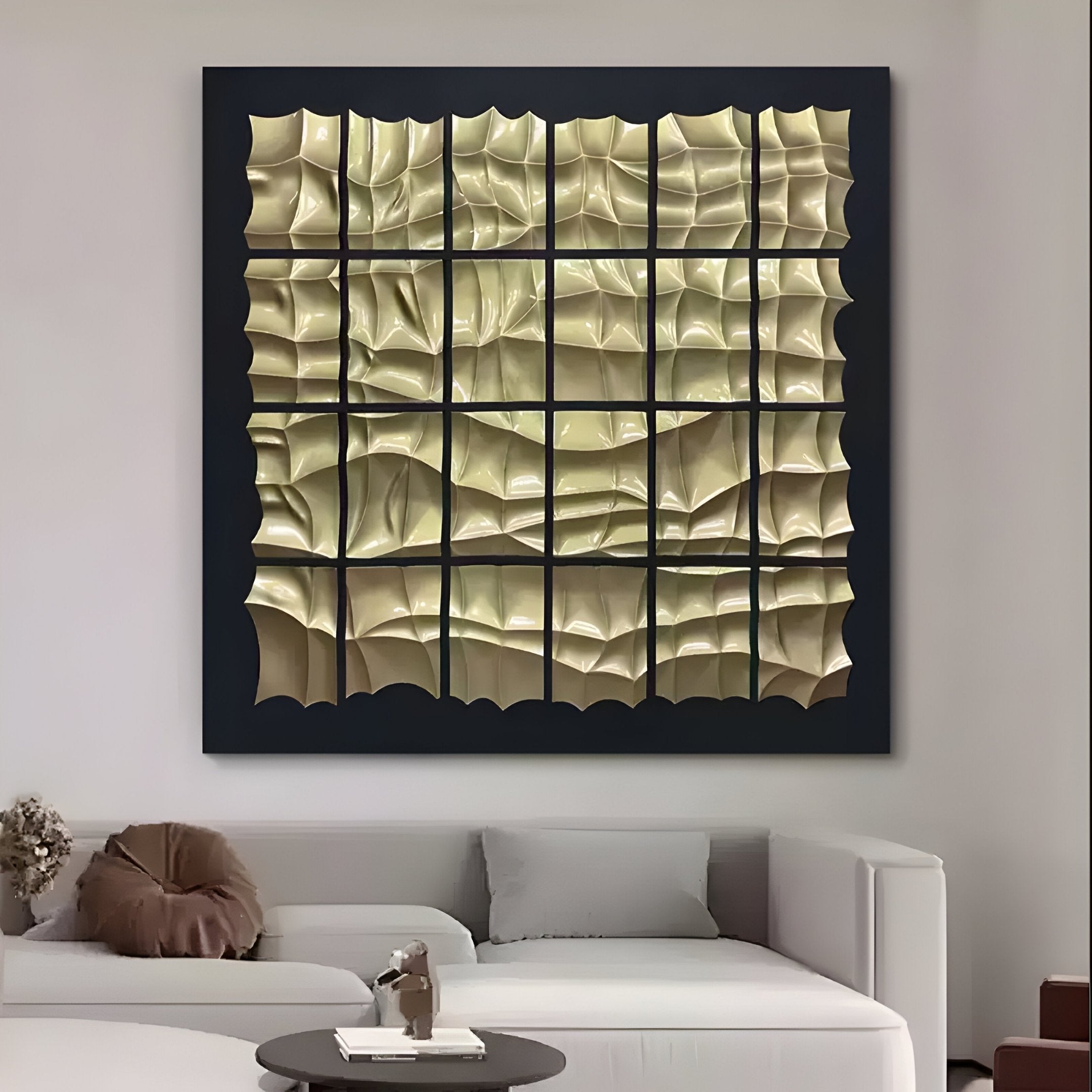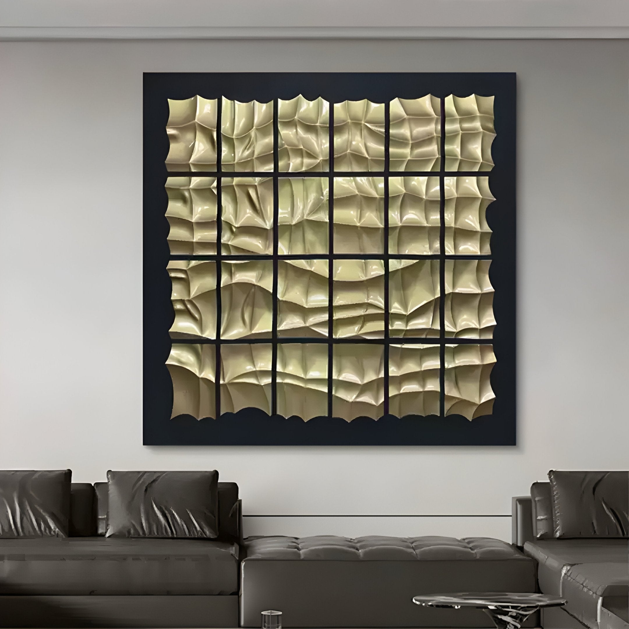 Carved from wood and treated with a glossy gold finish, the Aurion Black & Gold Glossy Wood Carving 3D Wall Art delivers an opulent yet refined statement for contemporary interiors. Arranged in a grid of square segments, each panel exhibits undulating shapes that reflect light in soft waves, creating an interplay of highlights and shadows. Placed against a black backdrop, the luminous gold sections stand out dramatically, amplifying the design’s sense of depth. Whether showcased in a modern living area, a stylish porch, or a hallway seeking a touch of Italian-inspired luxury, this piece’s clean geometry meets sculptural fluidity, generating a visually arresting focal point that invites closer observation.