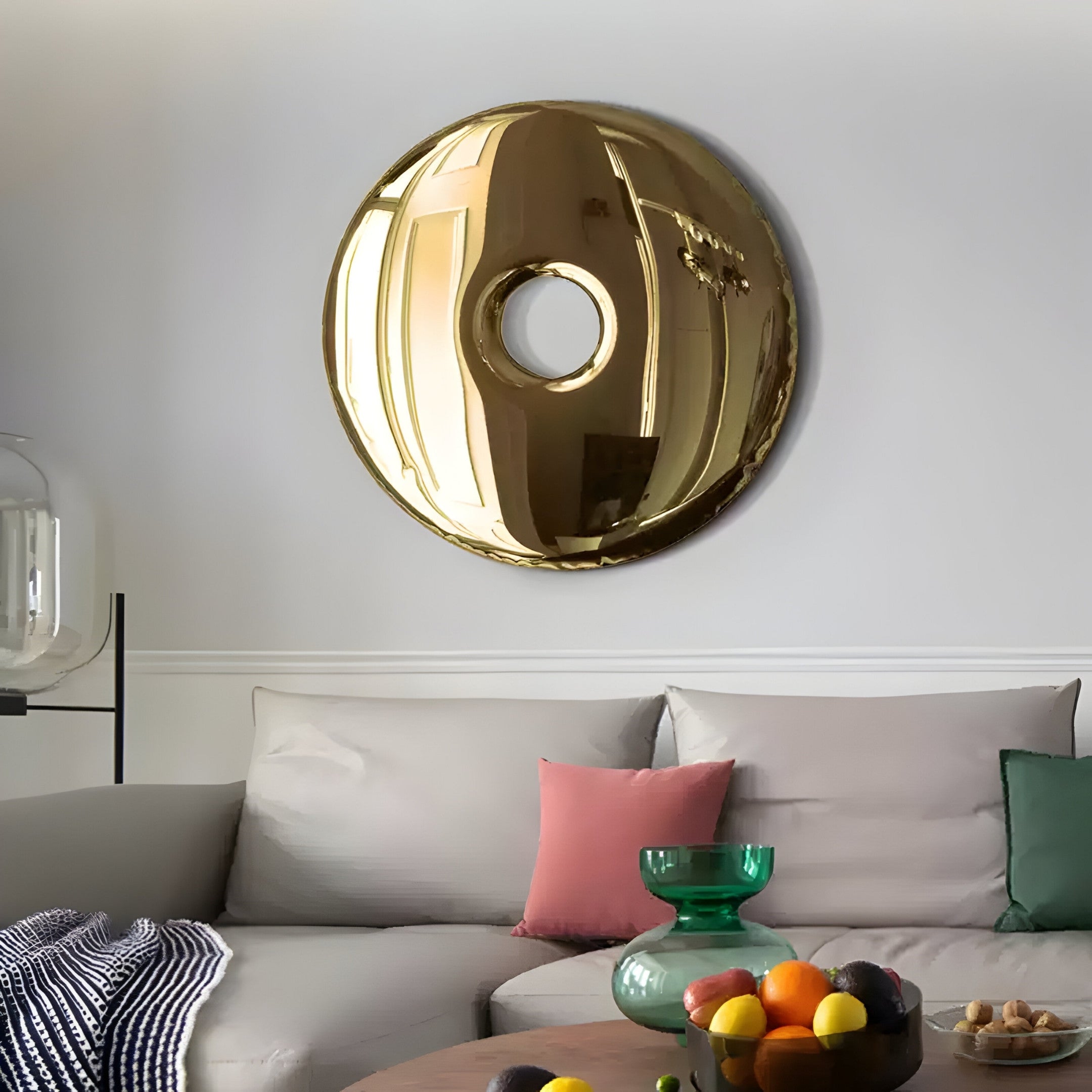 The Auro Gold Round Gloss Metal Wall Art is a masterpiece of modern luxury and artistic design. Crafted from high-quality stainless steel, this striking round wall piece features a polished gold finish that radiates elegance and sophistication. Its three-dimensional structure, with a hollowed centre and reflective surface, creates a dynamic interplay of light, adding depth and texture to any space. The curved silhouette offers a bold yet refined statement, making it a perfect fit for upscale interiors, from contemporary living rooms to opulent hotel suites.