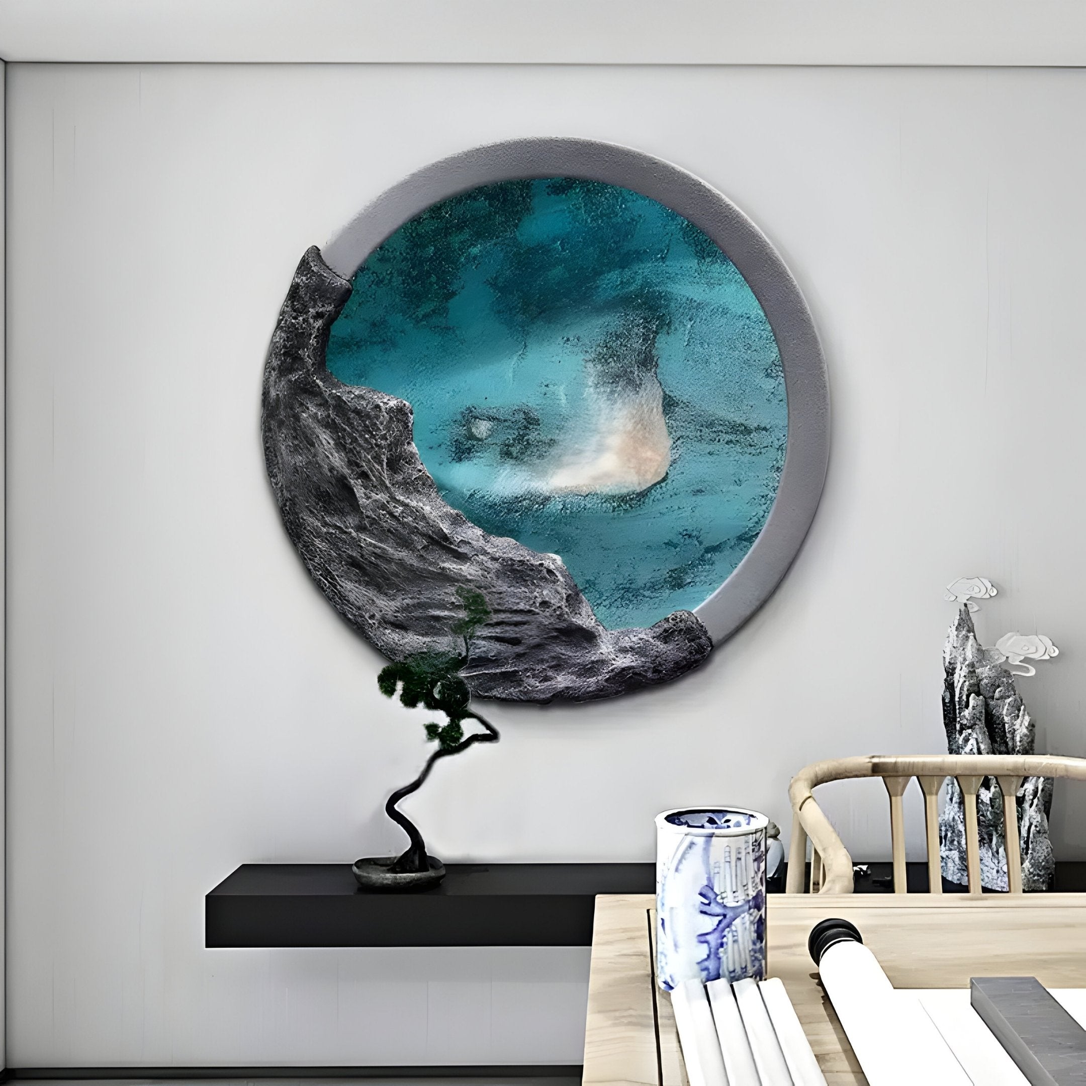 Carved from premium wood and meticulously hand-painted, the Auroria Golden Ember Hand-Painted Wood Relief 3D Wall Art offers a circular scene dominated by vivid teal tones and a gentle golden glow. A rugged, rock-like form occupies one portion of the ring, creating textural contrast with the central swirl, where dappled highlights invoke the interplay of light across water or misty air. Subtle transitions of colour bring depth to the piece, while the glossy finish in certain areas catches ambient lighting. When set in an entrance hall or dining area, it introduces an eye-catching focal point that seamlessly melds contemporary style with a whisper of natural mystery.