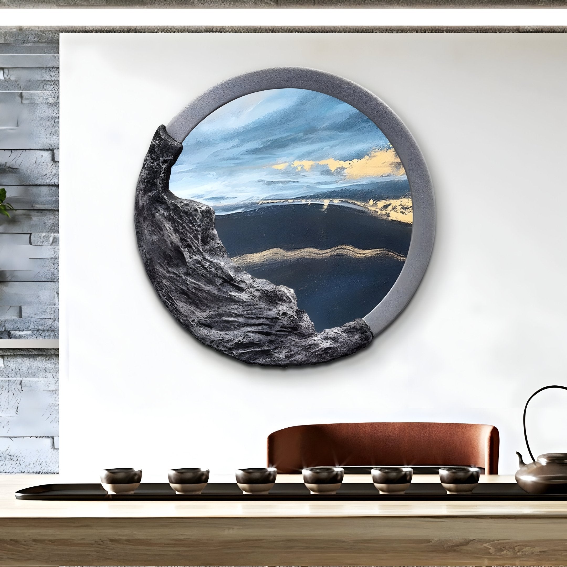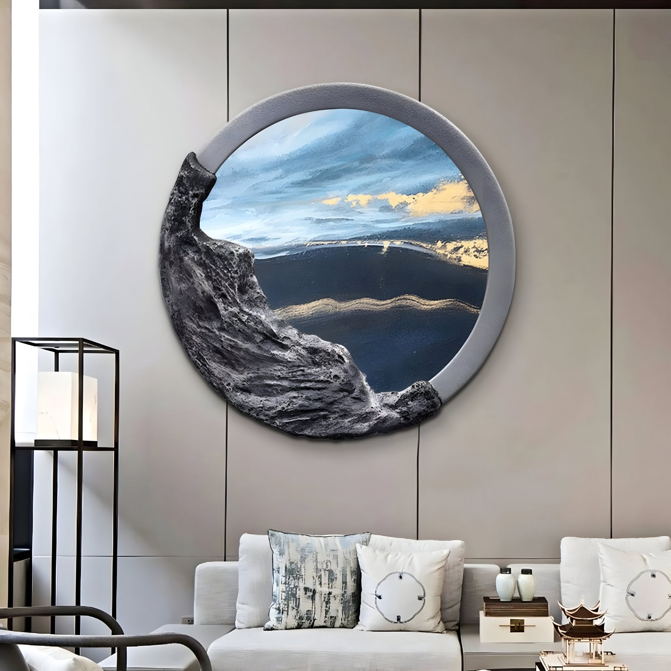 Hand-carved from solid wood and skillfully hand-painted, the Auroria Urban Mosaic Hand-Painted Wood Relief 3D Wall Art features a round form that captures a mesmerising snapshot of city-inspired elements against a subtle, reflective sky. A rugged rock edge lends depth to the lower portion of the circle, contrasting with the smoother urban skyline silhouette that arcs across the centre. The interplay of light and shadow on the carved surface evokes a sense of continuous movement, reminiscent of a bustling cityscape under changing skies. This combination of organic and structured shapes suits contemporary rooms seeking a lively yet balanced statement.
