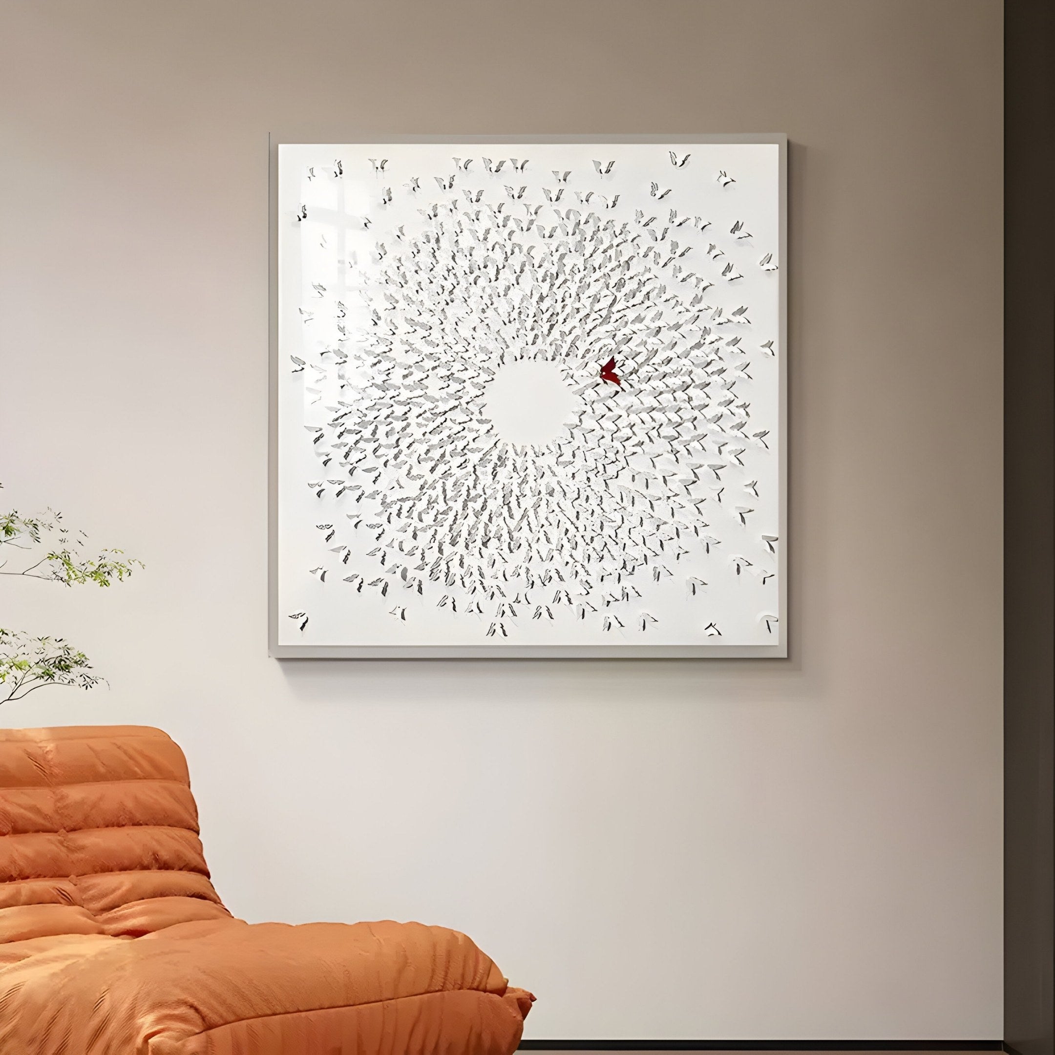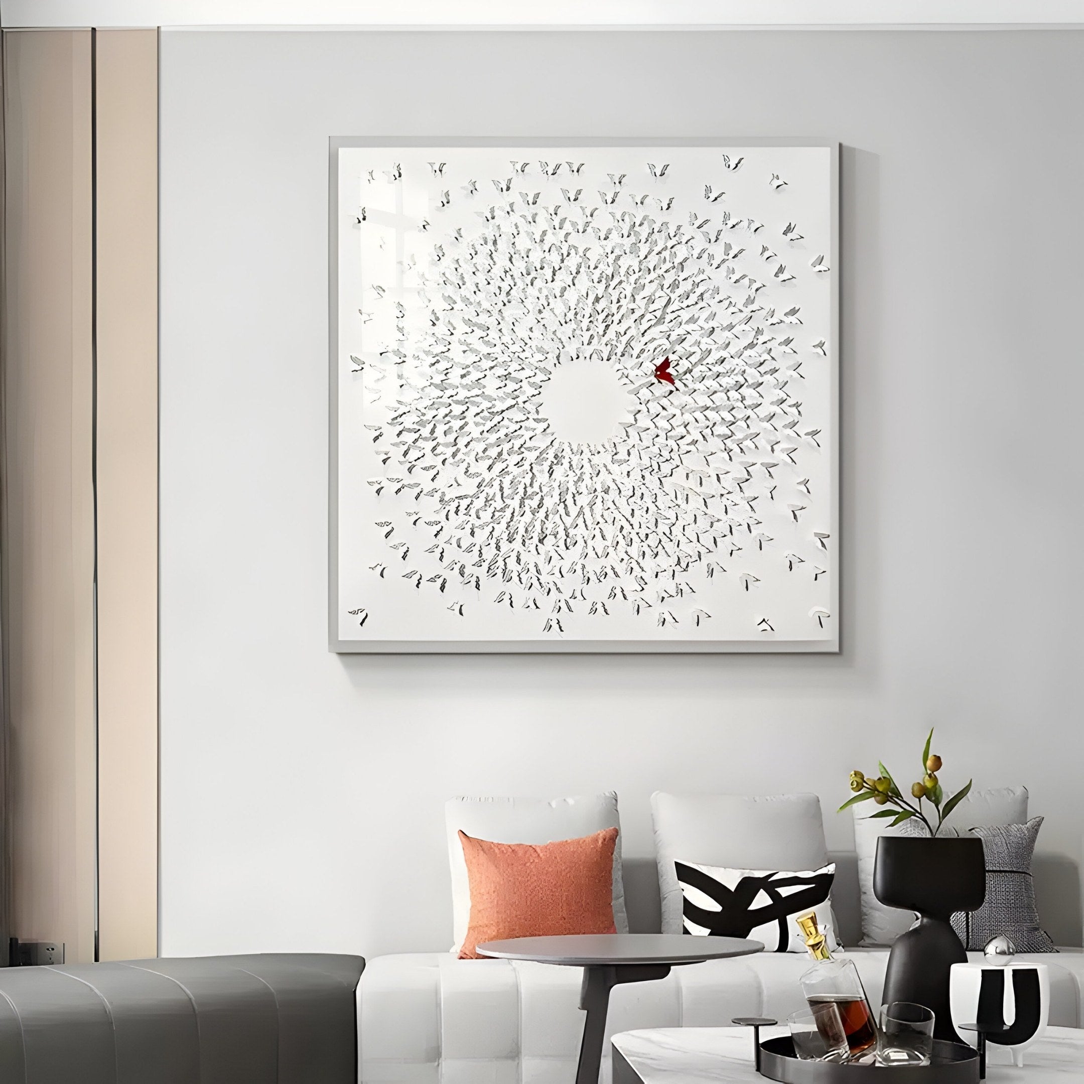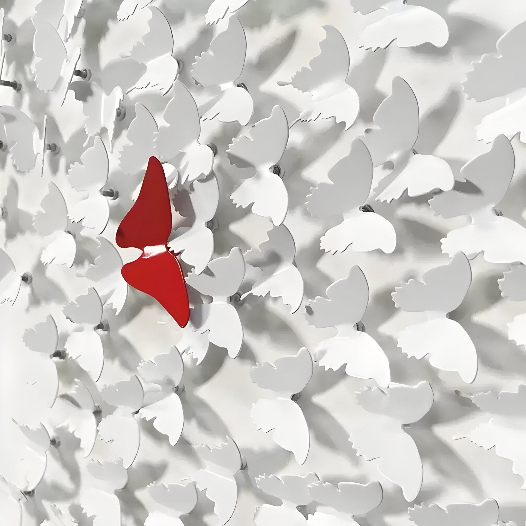 Designed for high-end interiors, this sculptural artwork brings an air of sophistication to spaces like corridors, entrance halls, and hotel lobbies. Its minimalist colour palette allows it to blend seamlessly into modern and contemporary settings while the red butterfly adds an artistic focal point. The 3D effect, achieved through the careful placement of iron butterflies at varying angles, ensures the piece draws attention without overwhelming its surroundings. This wall art is ideal for those who appreciate refined design paired with symbolism, making it a thoughtful addition to curated interiors.