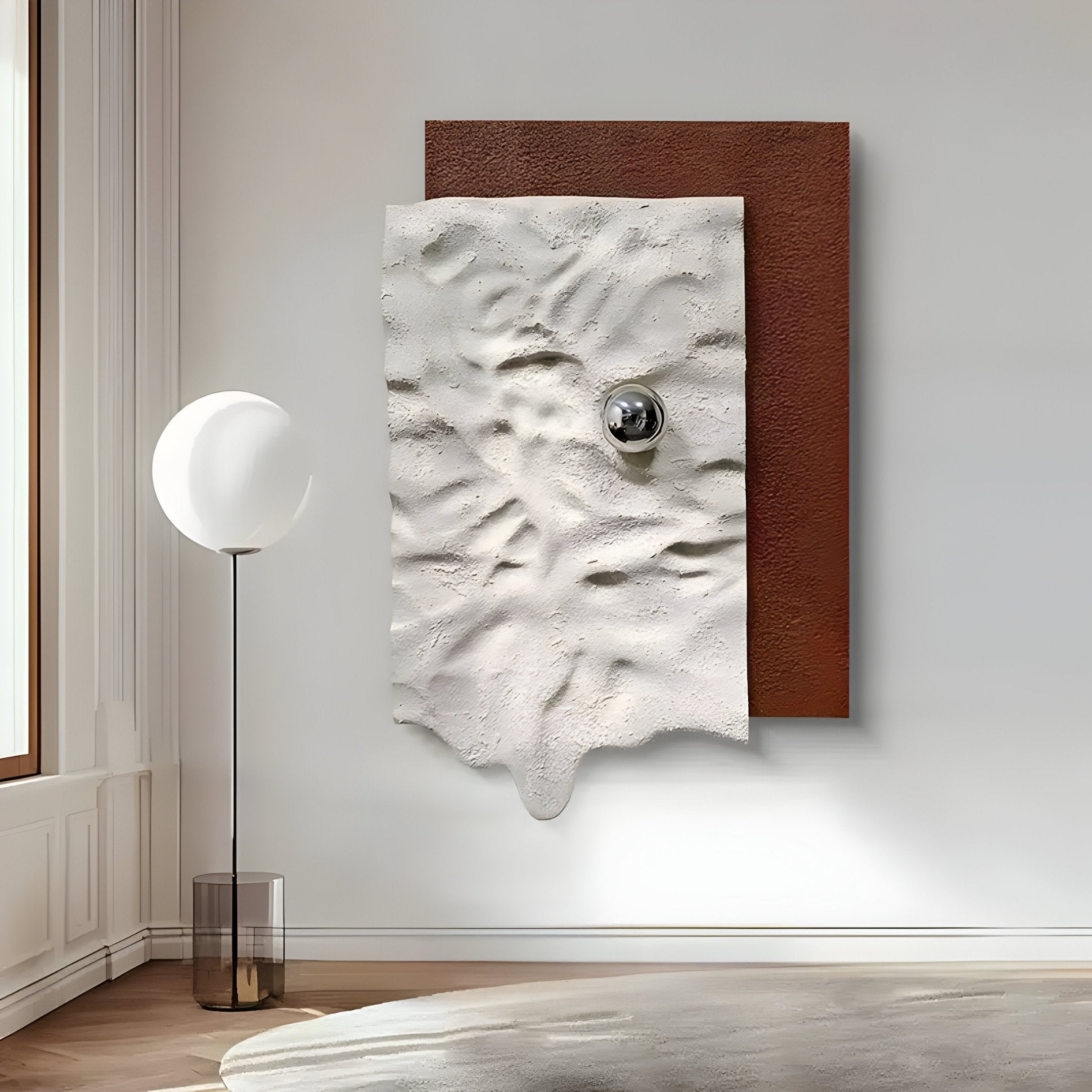 Combining earthy tones and a sculpted surface, the Calidora Terra Sculpted Textured 3D Relief Wall Art introduces a refined yet organic presence. A rectangular background in warm, terracotta-like hues anchors a wave-like panel carved in pale shades, which evokes softly eroded stone or windswept sand. At one focal point, a polished metallic sphere punctuates the layered design, reflecting its surroundings and adding a touch of modern sophistication. This contrast of rough, sand-like texture and glossy metal ensures the piece stands out in an entrance hall, corridor, or living area, offering depth and warmth to its environment.