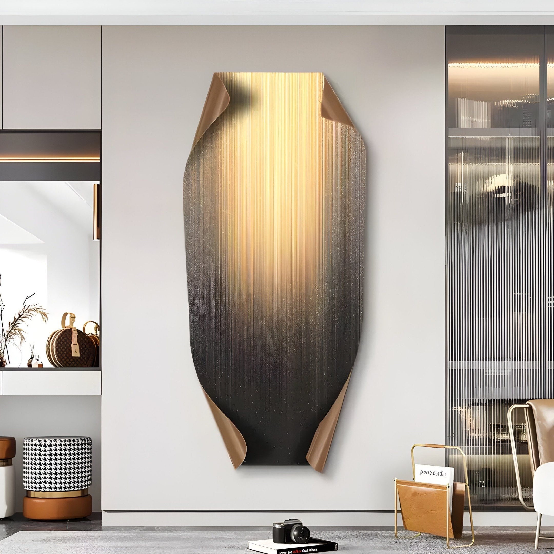 Crafted with precision from high-quality stainless steel and enhanced with leather and UV detailing, this wall art is both durable and visually impressive. The gradient colour palette transitions seamlessly from warm gold at the top to deep black at the bottom, adding a sense of luxury to any modern setting. Its curved and folded edges further enhance its three-dimensional form, giving it an artistic and sculptural appeal. Perfect for a variety of settings, this artwork fits beautifully in living rooms, entryways, dining areas, or even corporate spaces. Its timeless design makes it suitable for upscale homes, offices, or high-end hotels, complementing both minimalist and contemporary interiors.