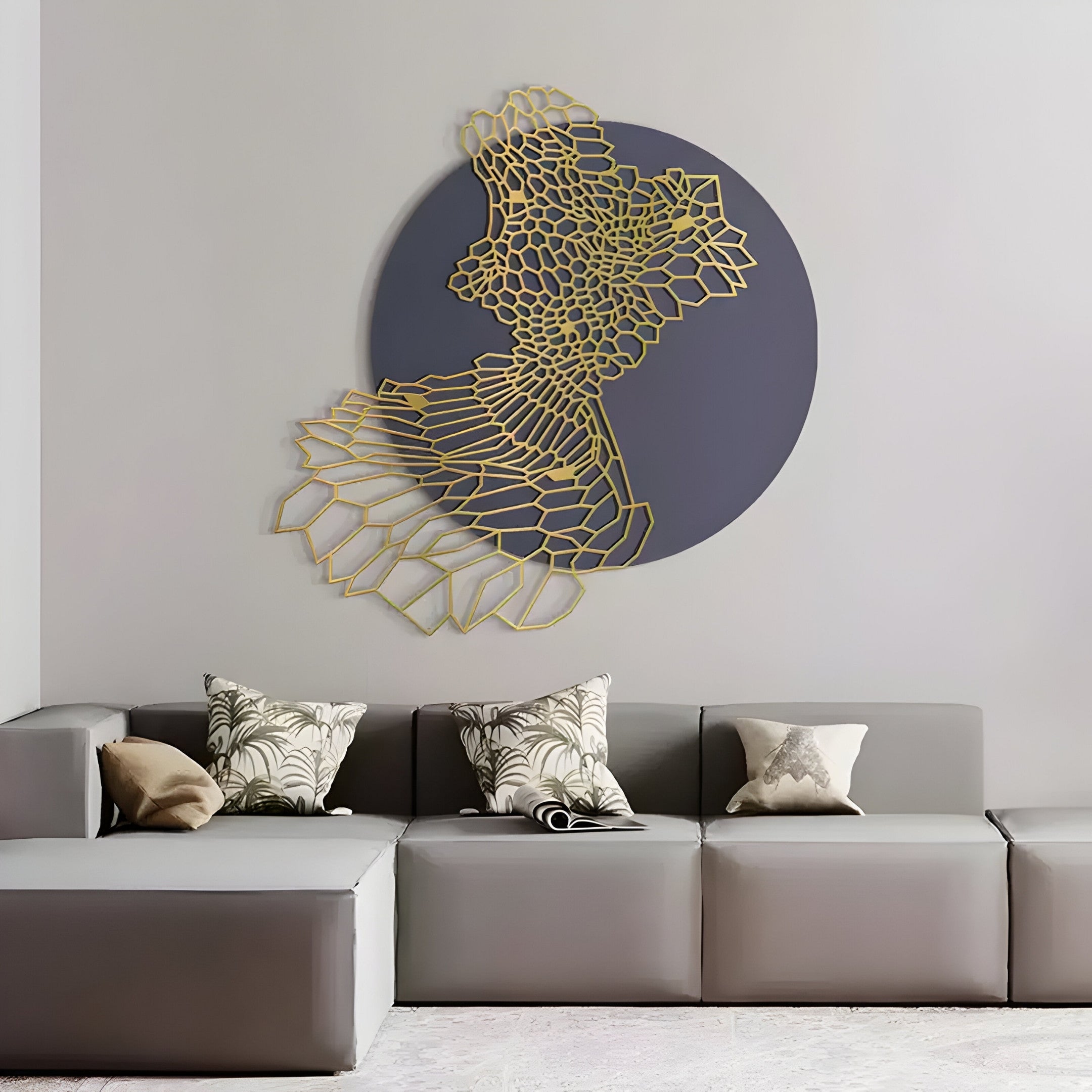 This versatile wall art suits various interior settings, including living rooms, bedrooms, and office spaces. The deep purple base offers a sense of calm and sophistication, while the golden geometric wire pattern adds a refined artistic touch. Whether displayed as a statement piece or combined with other décor elements, this wall art enhances the visual aesthetic of any room. Its contemporary design and premium craftsmanship make it a perfect choice for those seeking unique and high-quality decor that speaks to modern artistic sensibilities.