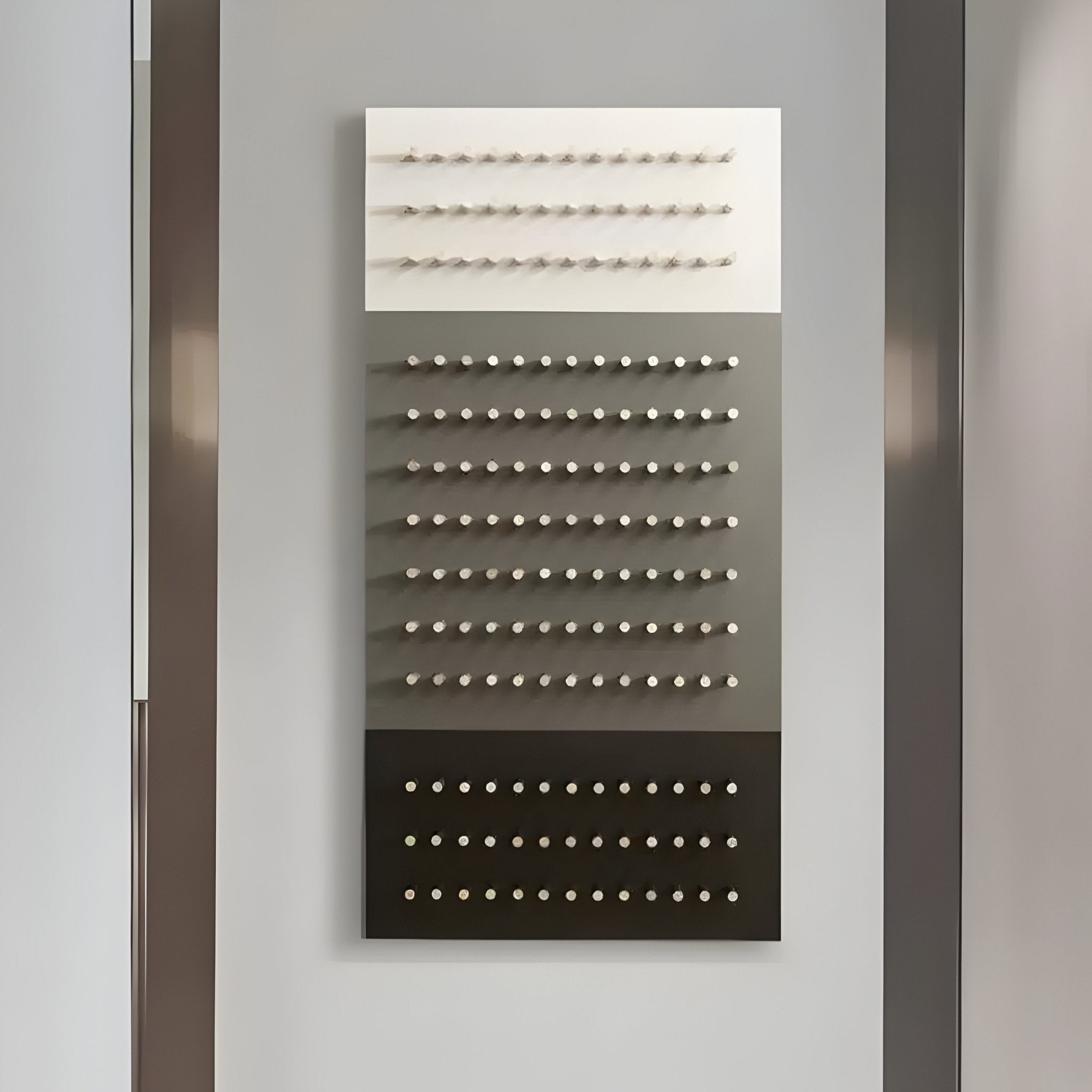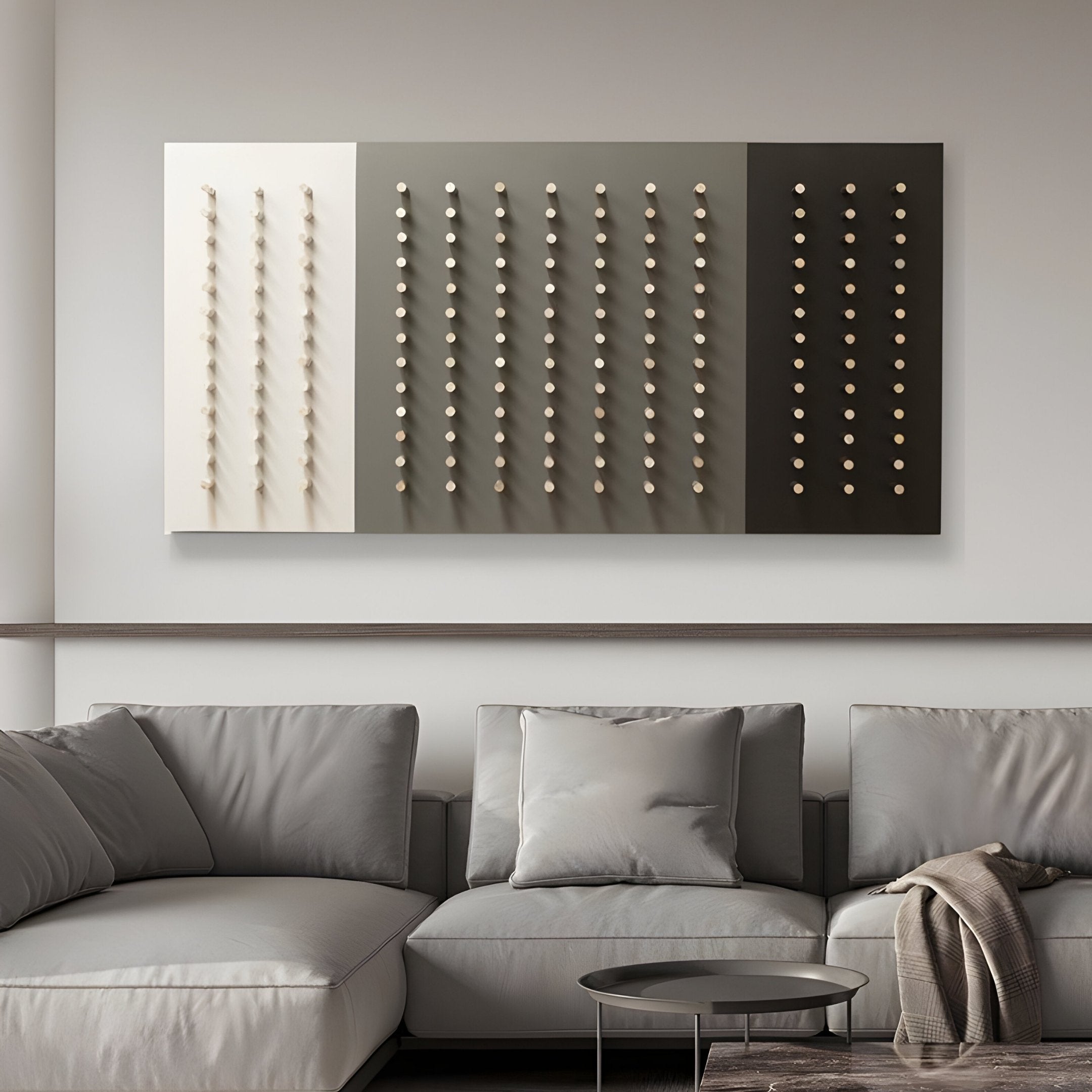 The Contrasto Monochrome Symmetry 3D Wooden Wall Art offers a refined interplay of texture, dimension, and balance. This piece features a harmonious blend of matte black, grey, and white panels, each adorned with meticulously placed wooden pegs that create a rhythmic, grid-like arrangement. The contrast between the dark and light sections highlights the intricacy of the design, while the three-dimensional elements cast dynamic shadows, adding depth and movement. Whether displayed horizontally or vertically, the modular structure allows this artwork to adapt seamlessly to its surroundings.