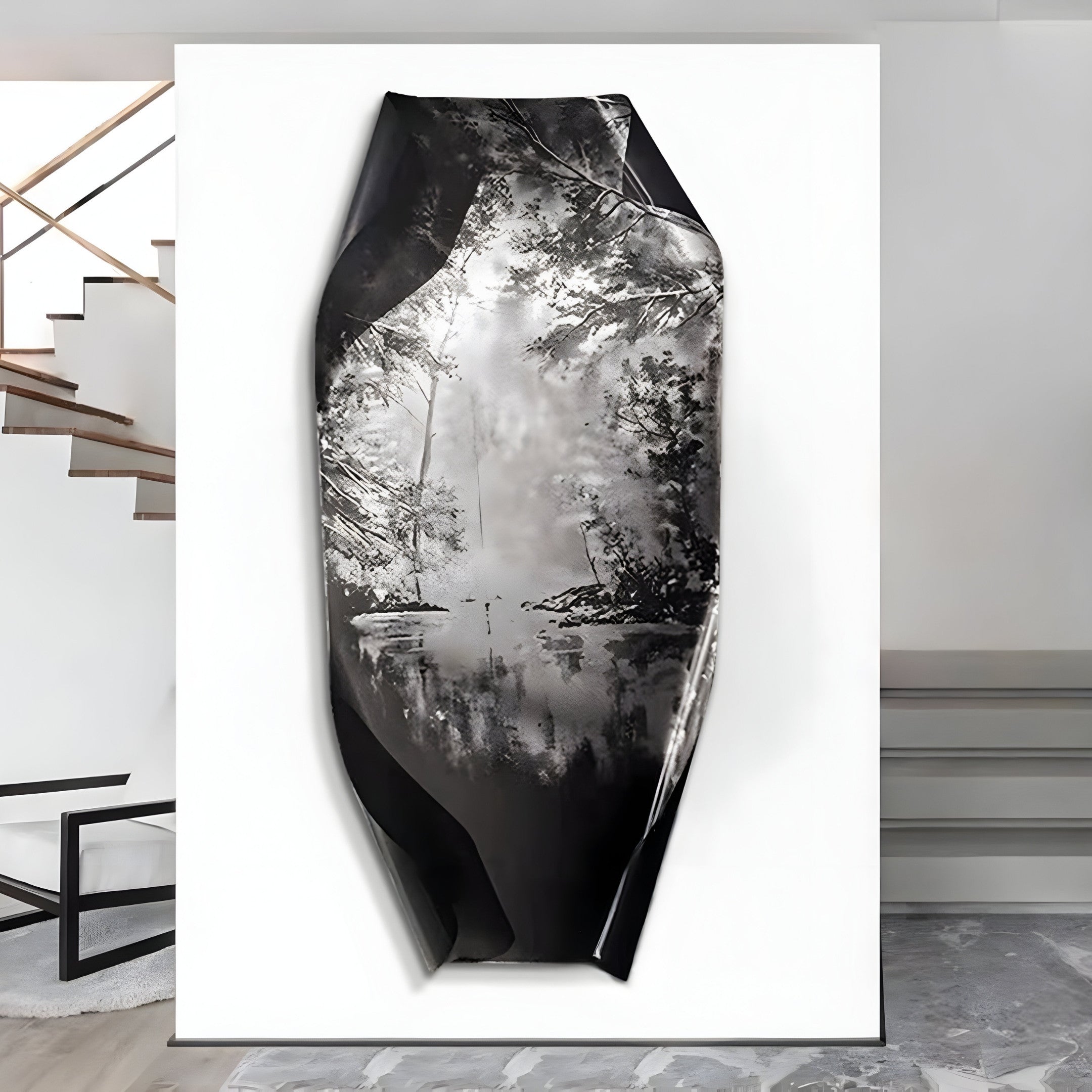 The Echo Waterscape Abstract Wall Art captures a serene black-and-white waterscape etched into a textured metal canvas. The three-dimensional curling design adds a dynamic depth to the landscape, blending natural imagery with modern aesthetics. The reflective surface highlights intricate etching details, creating a stunning play of light and shadow. Its bold yet minimalist structure makes it a versatile choice for any space aiming for an artistic focal point. This wall art merges functionality and beauty, perfect for enhancing contemporary or classic interiors.
