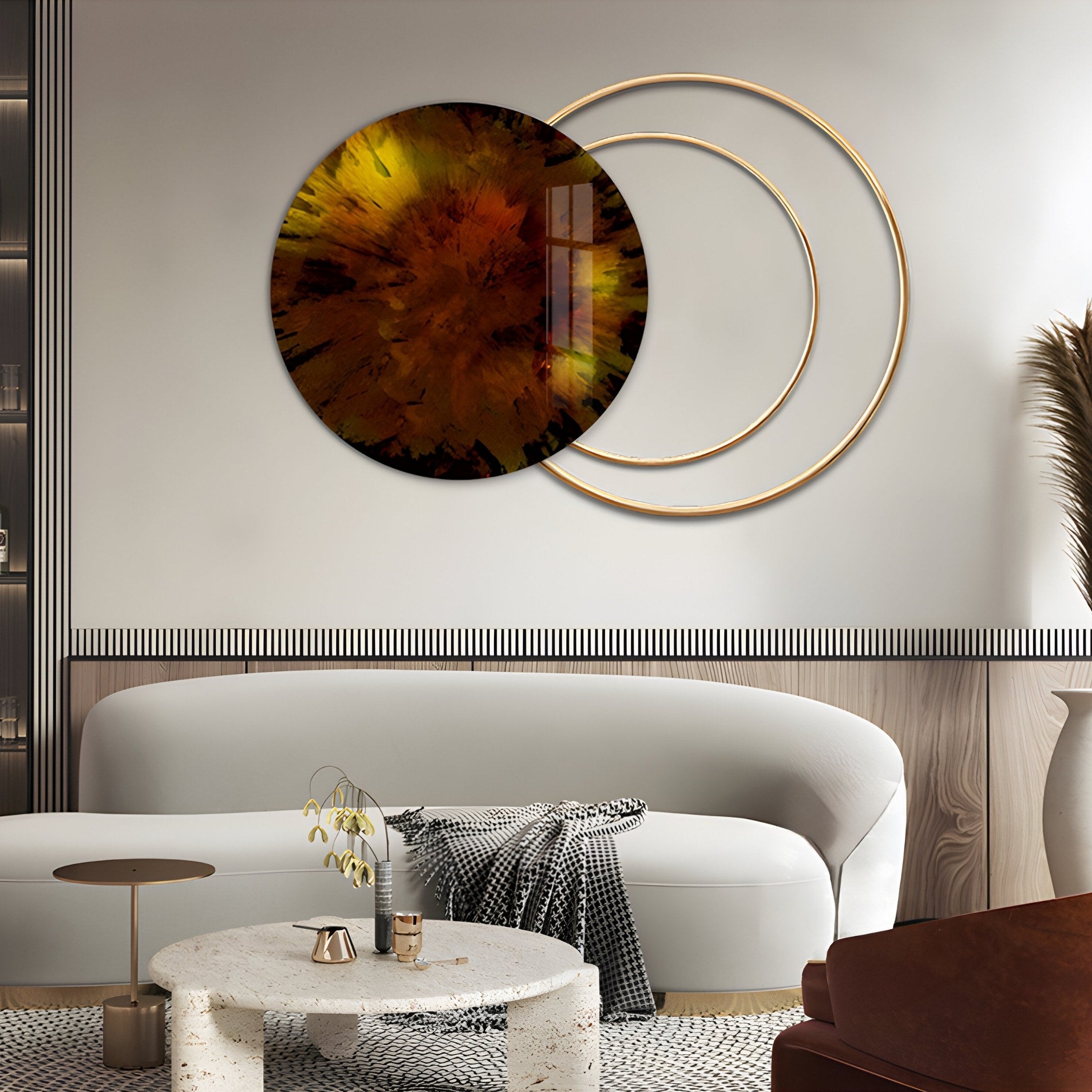 The Eclipse Luxe Amber Glow Circular Ring Wall Art combines modern artistry with a sophisticated flair. This piece features a striking amber-hued circular centerpiece made from high-quality acrylic, giving it a luminous, glass-like finish. The marbled gradient in rich golds and deep browns adds warmth and intrigue. Two intersecting golden metal rings encircle the centrepiece, creating a dynamic visual flow and adding depth to the composition. The fusion of sleek metallic lines with radiant acrylic ensures this artwork stands out as a bold statement piece for any interior.