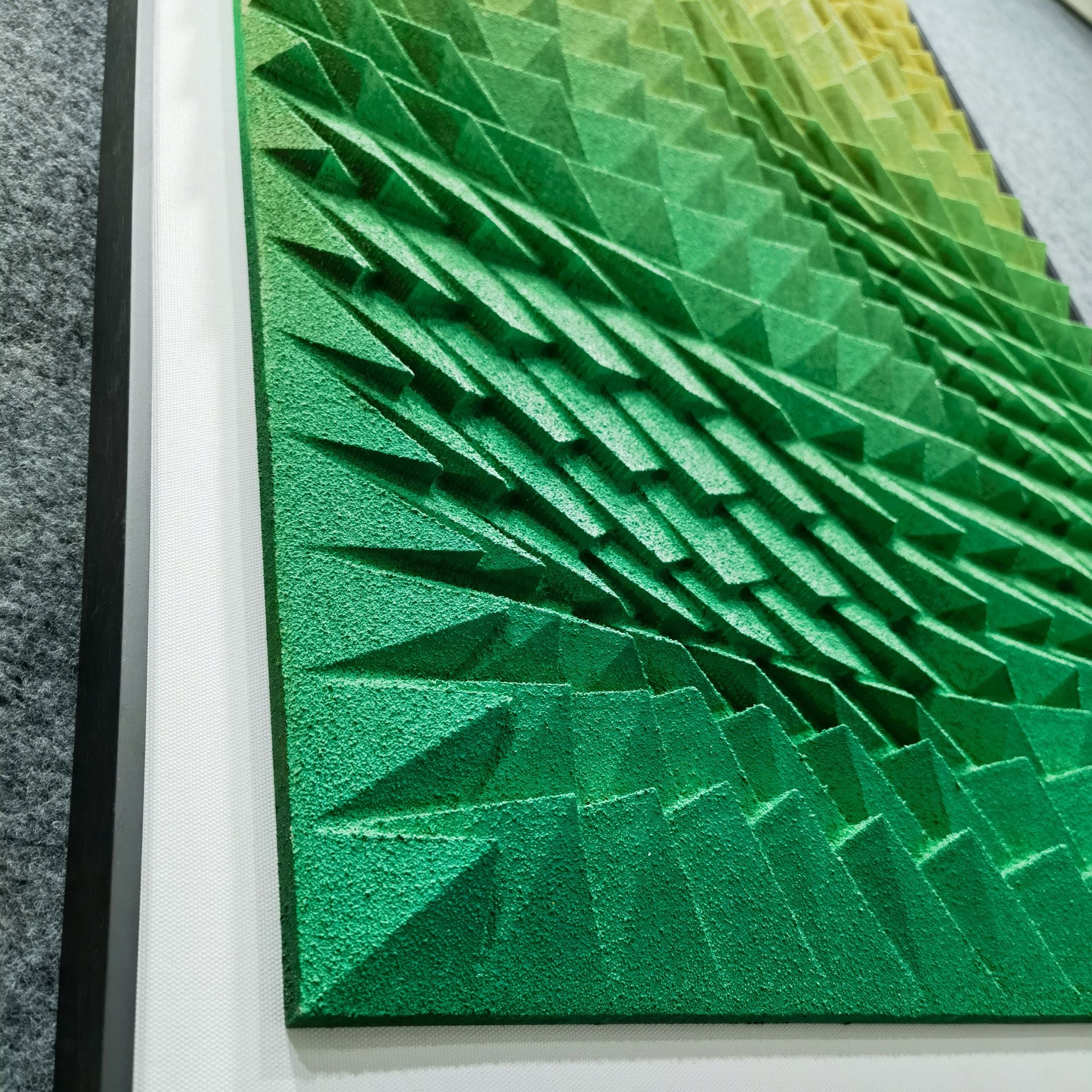 Hand-carved from real wood and carefully finished with a hand-painted gradient, the Elorium Green Gradient Hand-Painted Wood Relief 3D Wall Art offers a refreshing blend of organic charm and contemporary style. Triangular facets cascade across the piece in overlapping rows, creating a lively interplay of shadows and highlights. The gradient transitions from a gentle, pale green at the top to a rich, forest hue at the base, evoking a sense of harmony and calm. Thanks to the subtle sandstone texture, each carved edge reveals fine details that invite closer inspection, while also providing a soothing backdrop when viewed from afar.