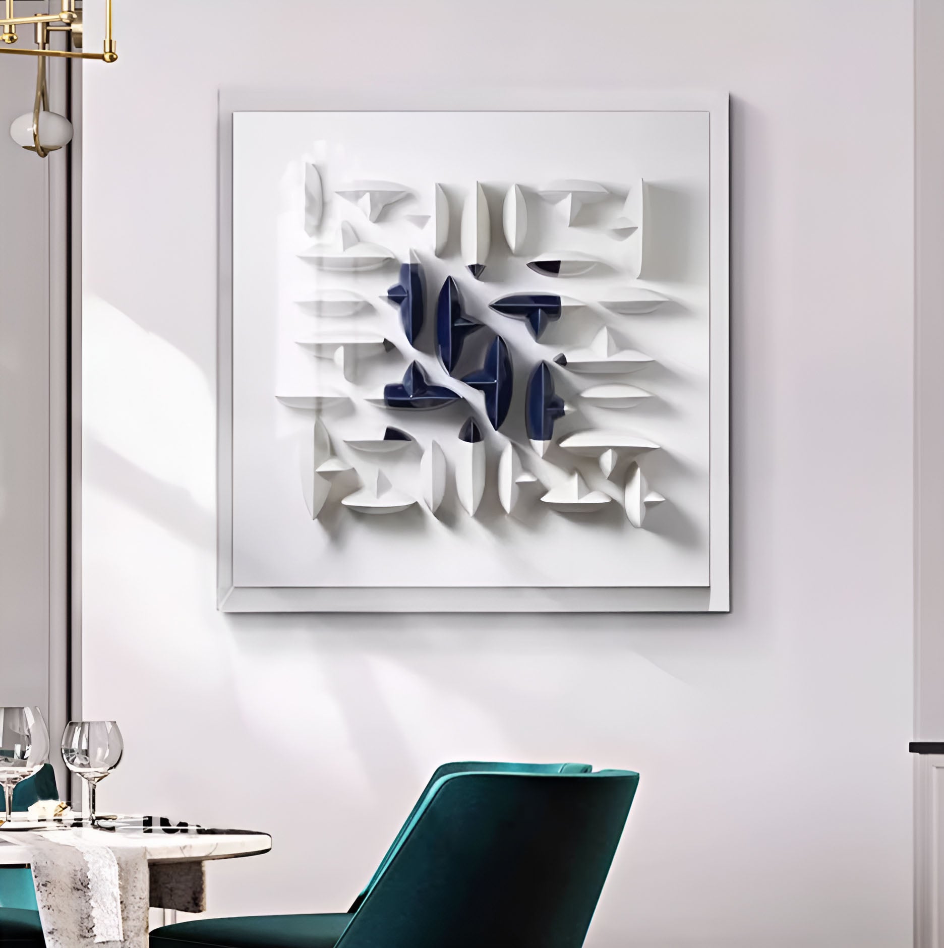 This captivating 3D wall art showcases a masterful blend of sculptural elegance and modern design, featuring meticulously crafted ceramic elements and an acrylic frame. The central structure, adorned with deep blue and white accents, flows seamlessly within the layered composition, creating a sense of movement and depth. Each geometric form is precisely arranged, generating a rhythmic interplay of light and shadow that enhances its visual intrigue. Encased within a clear acrylic frame and complemented by a white sculptural backdrop, this statement artwork merges artisanal craftsmanship with contemporary sophistication, making it a standout addition to upscale living rooms, modern office spaces, or stylish hallways.