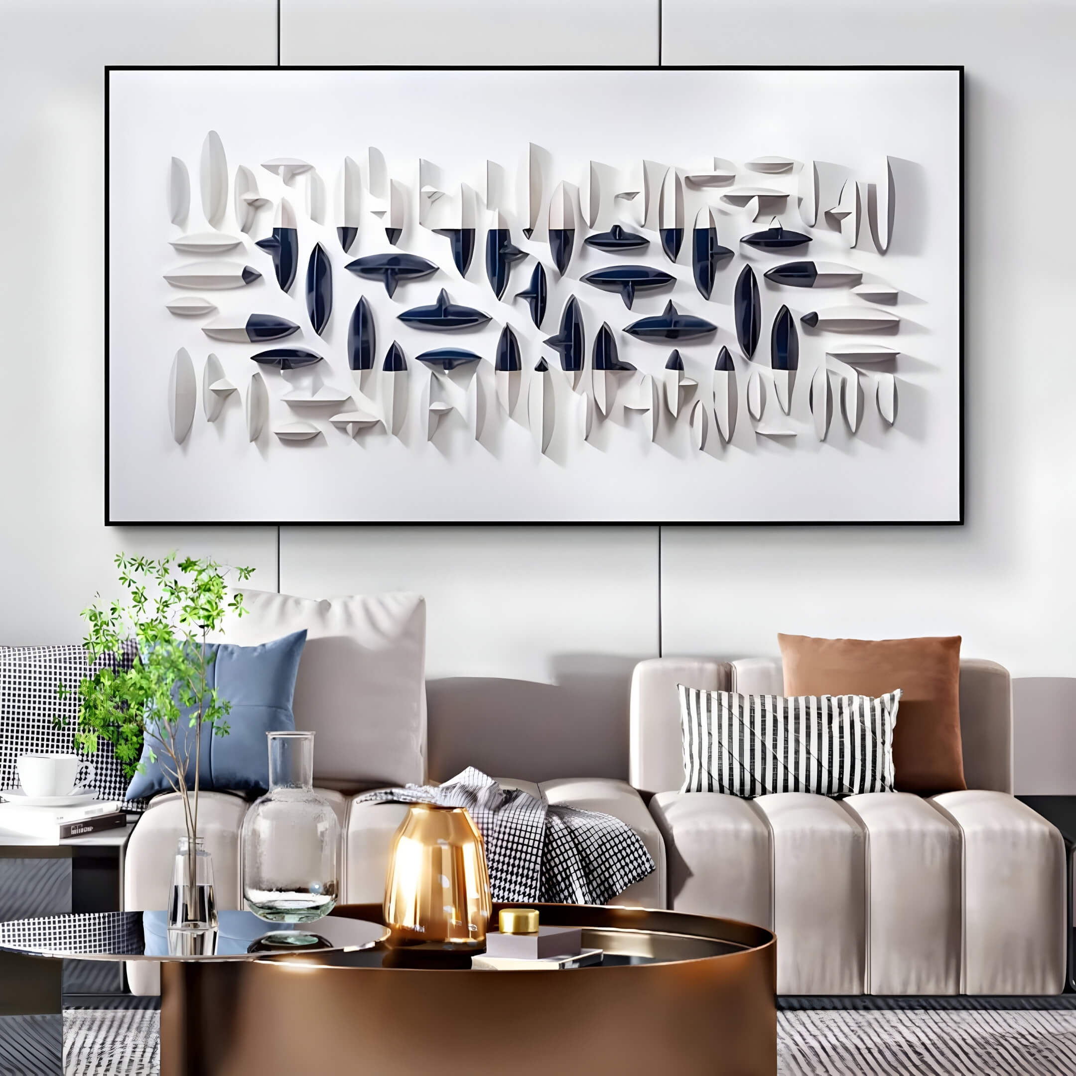 The 3D wall art combines expert craftsmanship with modern design, offering a sophisticated focal point for contemporary interiors. The intricate arrangement of elongated, sculptural ceramic forms in deep blue and white tones creates a rhythmic, horizontal composition that plays with light and shadow to add dynamic depth. Each ceramic element is carefully crafted to form an organic yet structured flow, reflecting patterns inspired by nature while maintaining a bold, modern aesthetic. The artwork is elegantly finished in your choice of gold, black, or silver frames, enhancing its versatility and appeal. The premium framing complements the textured ceramic details, ensuring it stands out in both minimalist and upscale spaces.