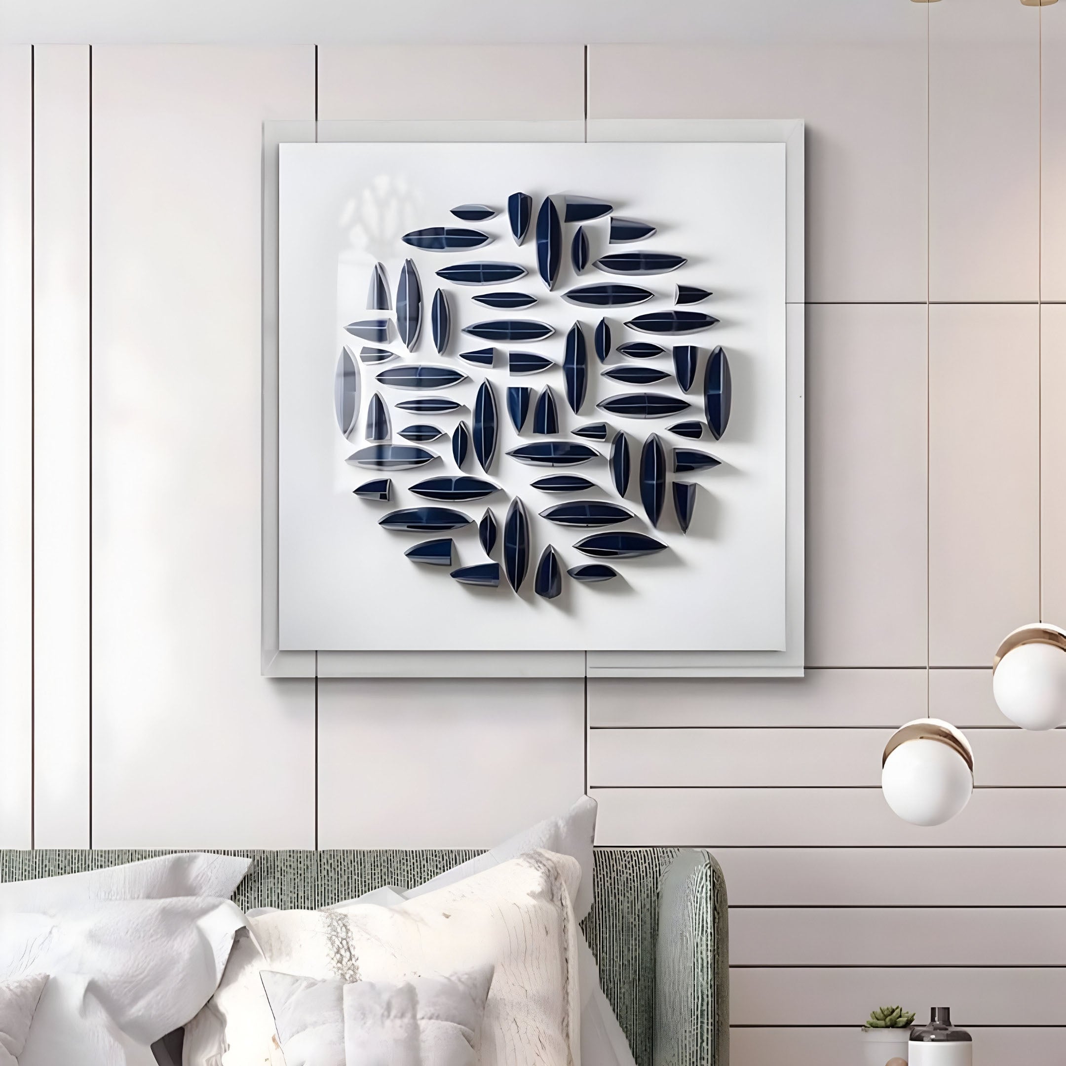 Contemporary 3D wall art embodies modern elegance, featuring sculptural geometric forms meticulously crafted with ceramic techniques. Arranged into an intricate and organic circular composition, the elongated deep blue shapes contrast beautifully against the white background, creating dynamic visual movement. The precise layering of ceramic elements adds texture and depth, while the interplay of light and shadow emphasizes its dimensional design. Encased in an acrylic frame with a minimalist white border, this statement piece combines artisanal craftsmanship with modern sophistication, making it the perfect focal point for stylish interiors.