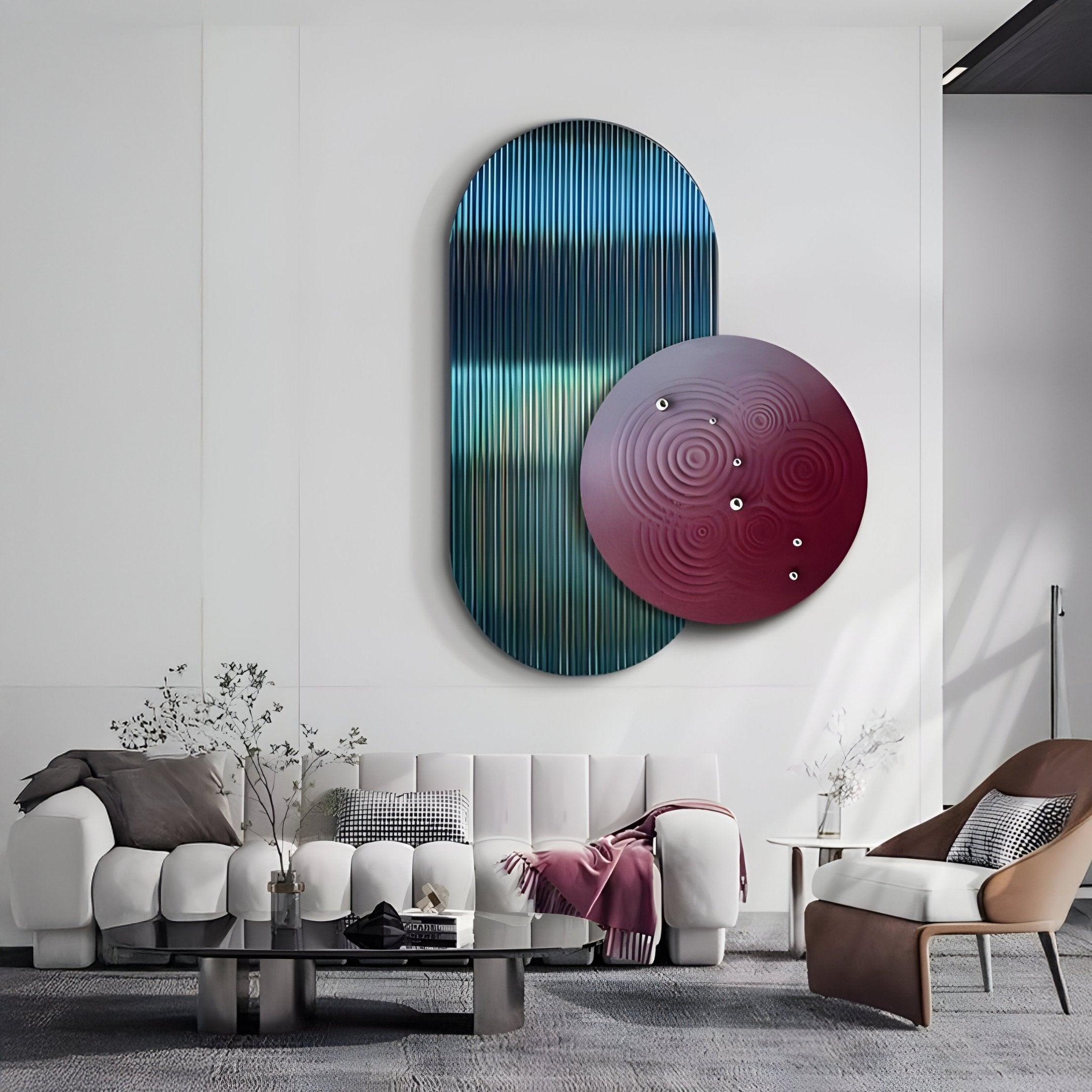 Crafted using a blend of corrugated acrylic and wood carving, the Embera Abstract Circle Navy Warm Gradient 3D Wall Art showcases a bold fusion of shape, texture, and colour. The elongated navy panel, featuring a mesmerising vertical ribbed pattern, subtly transitions into warmer hues under varying light, creating a sophisticated gradient effect. Overlaying this elliptical form is a deep burgundy circle etched with concentric ripples, evoking a sense of calm and balance amidst the piece’s dynamic qualities. Metallic knobs scattered across the circle lend a sleek contrast while adding a subtle gleam. Viewed from different angles, the interplay of cool navy shades and cosy reddish tones reveals nuances that invite the observer to take a closer look.